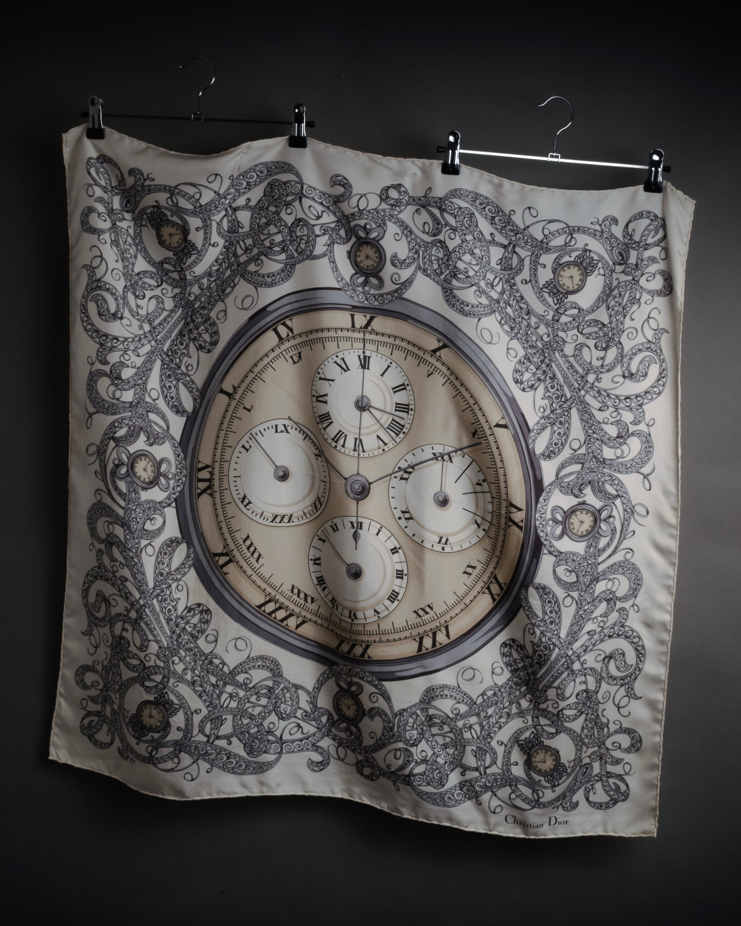 “Christian Dior” 70’s-80’s Clock motif silk scarf