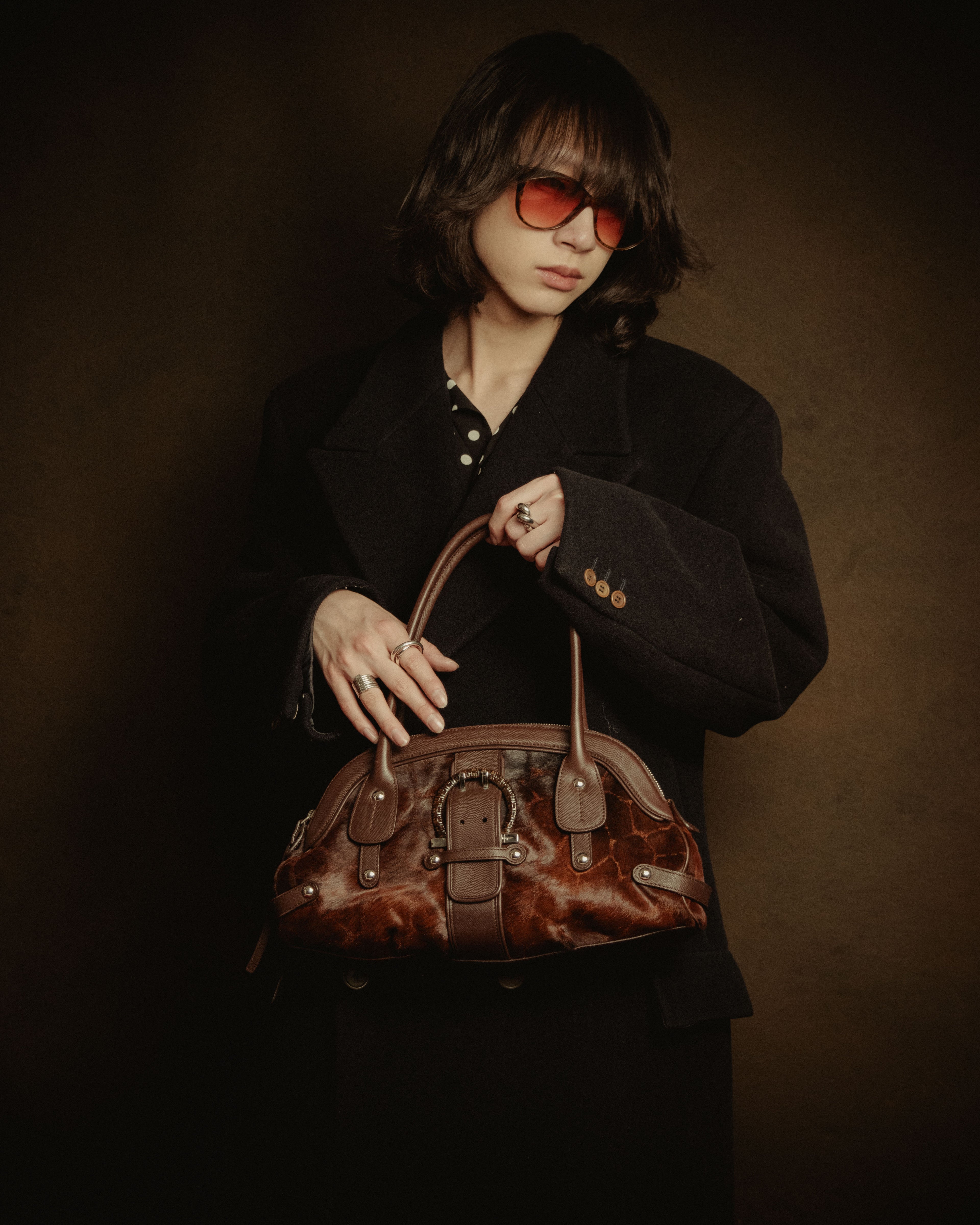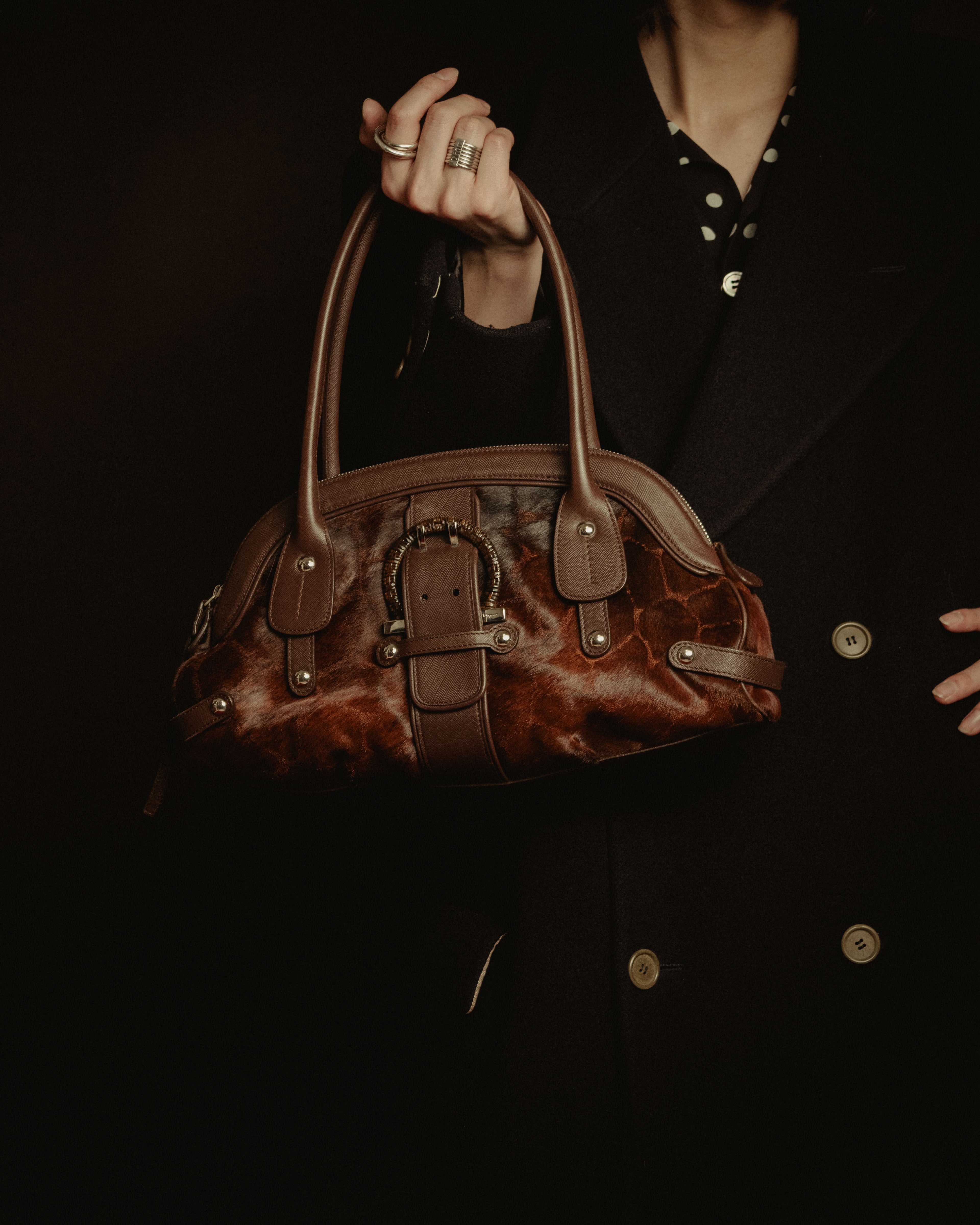 –SPECIAL– "Salvatore Ferragamo" 00’s calf hair gancini rattan accent handbag