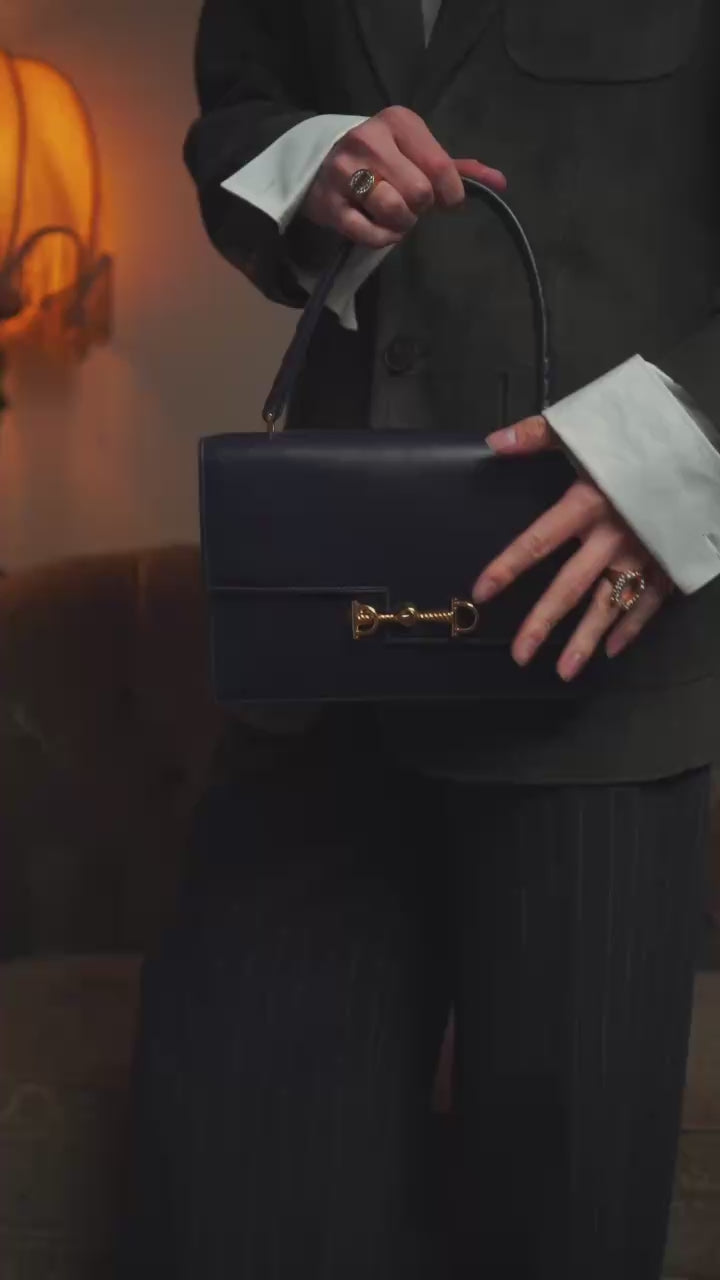 このモデルの核となるのは、正面に据えられたビットモチーフの金具で、捻りの入ったバーとリング状のパーツが立体的に噛み合うことで、光が当たるたび陰影が生まれ、濃紺の面に緊張感を与えてくれますね。さらにこの金具は単に目を惹かせる為の意匠ではなく、フラップの留め具として成立する構造だからこそ、開閉の動作そのものが一つの所作となり、持つ人の手元に自然な品格が宿ります。