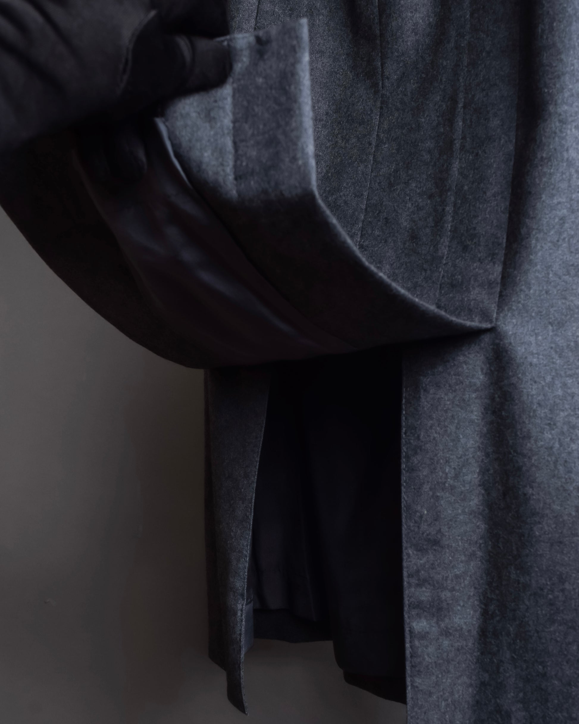 The deep charcoal gray color has a depth that seems to include soft shadows, and the coloring creates a subdued yet dignified appearance. The waist is decorated with two gold buttons, the Maison's signature, with a perfume bottle motif, adding a touch of irony with its modest wit.
