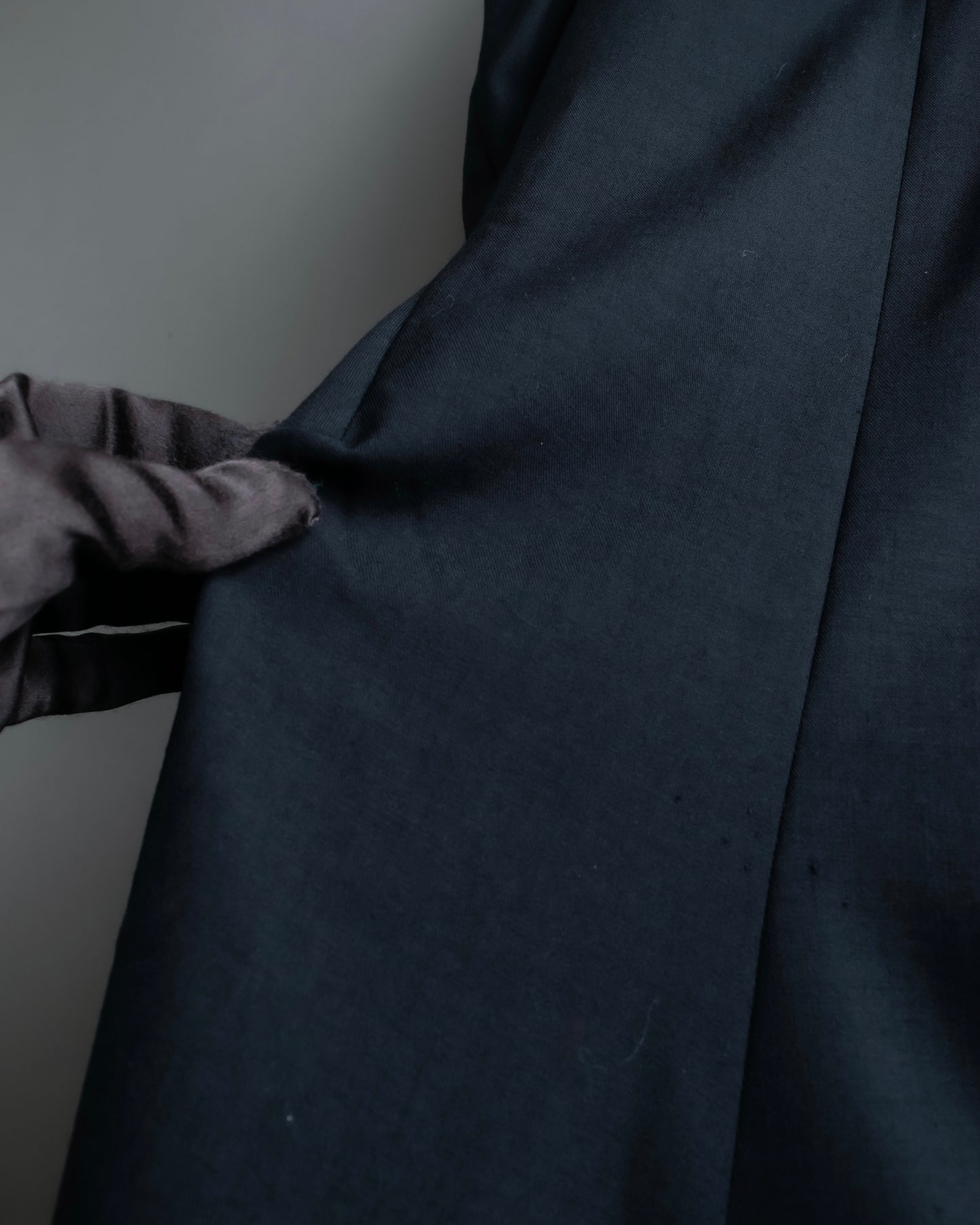 The material used is wool gabardine, a particularly precious wool material, which means that it is more durable than other wools while also having a unique luster and drape, creating an iconic material look.
