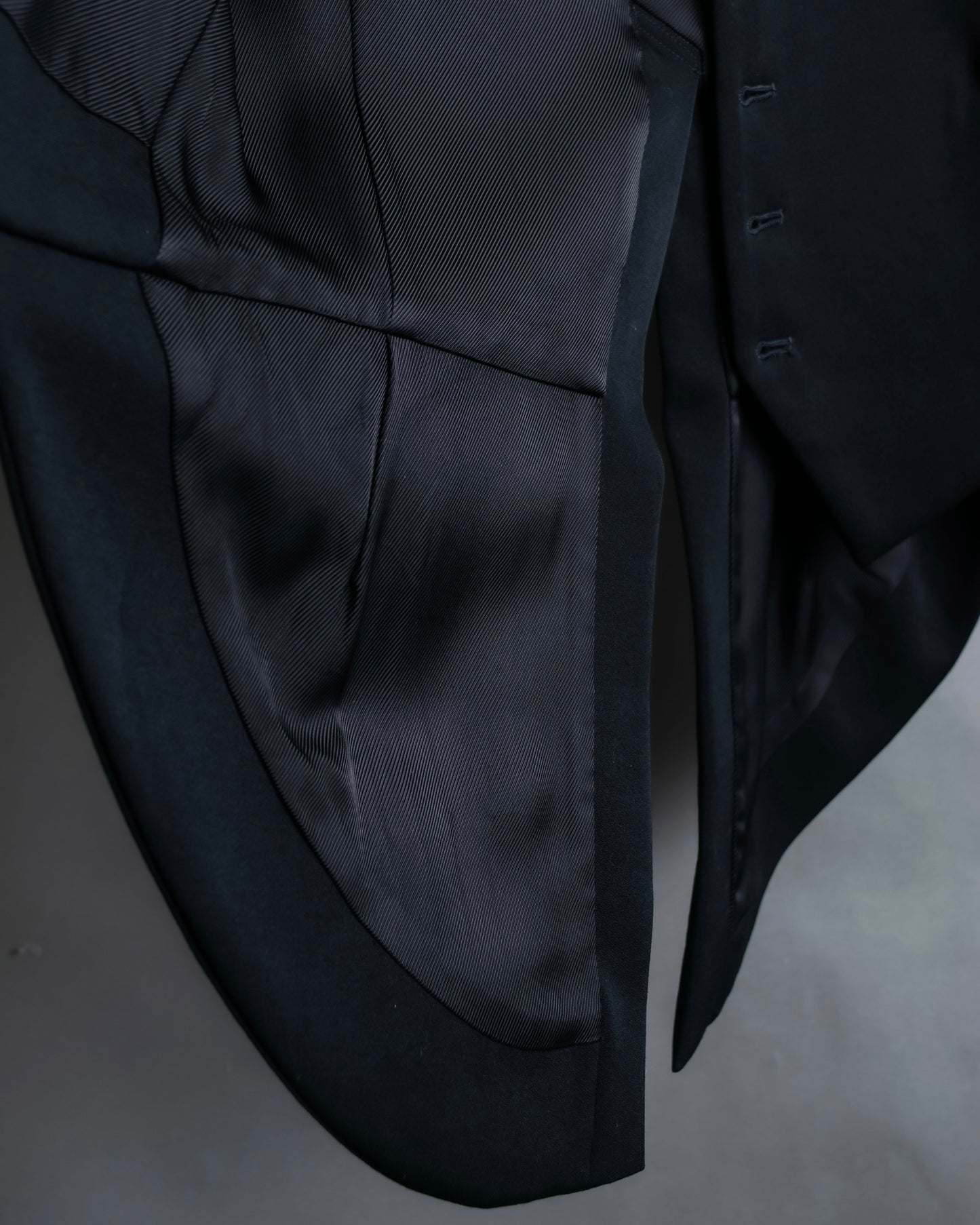 This masterpiece features a silhouette that is longer at the back, resembling a tailcoat.