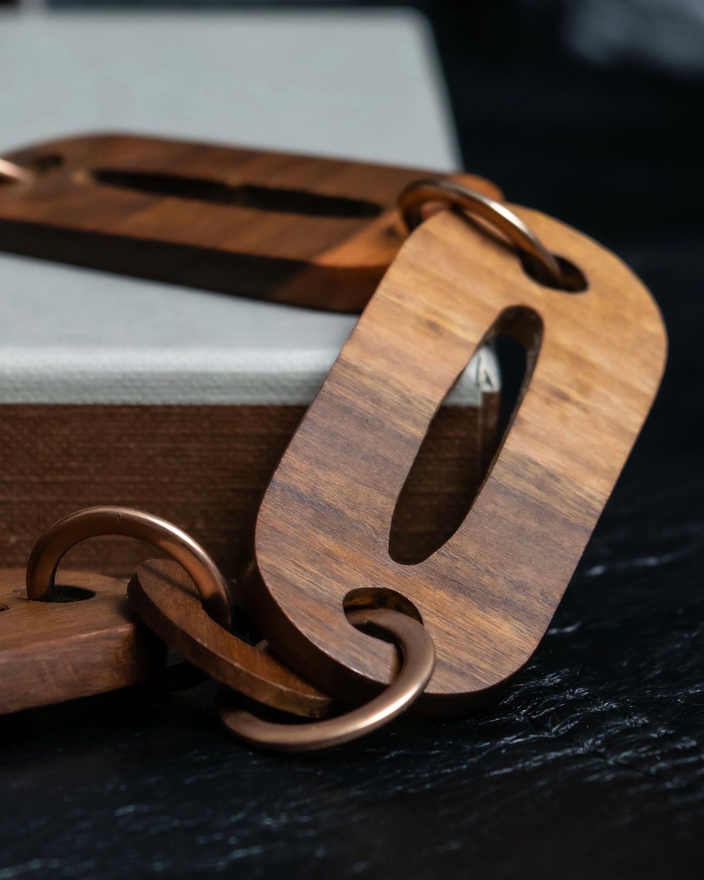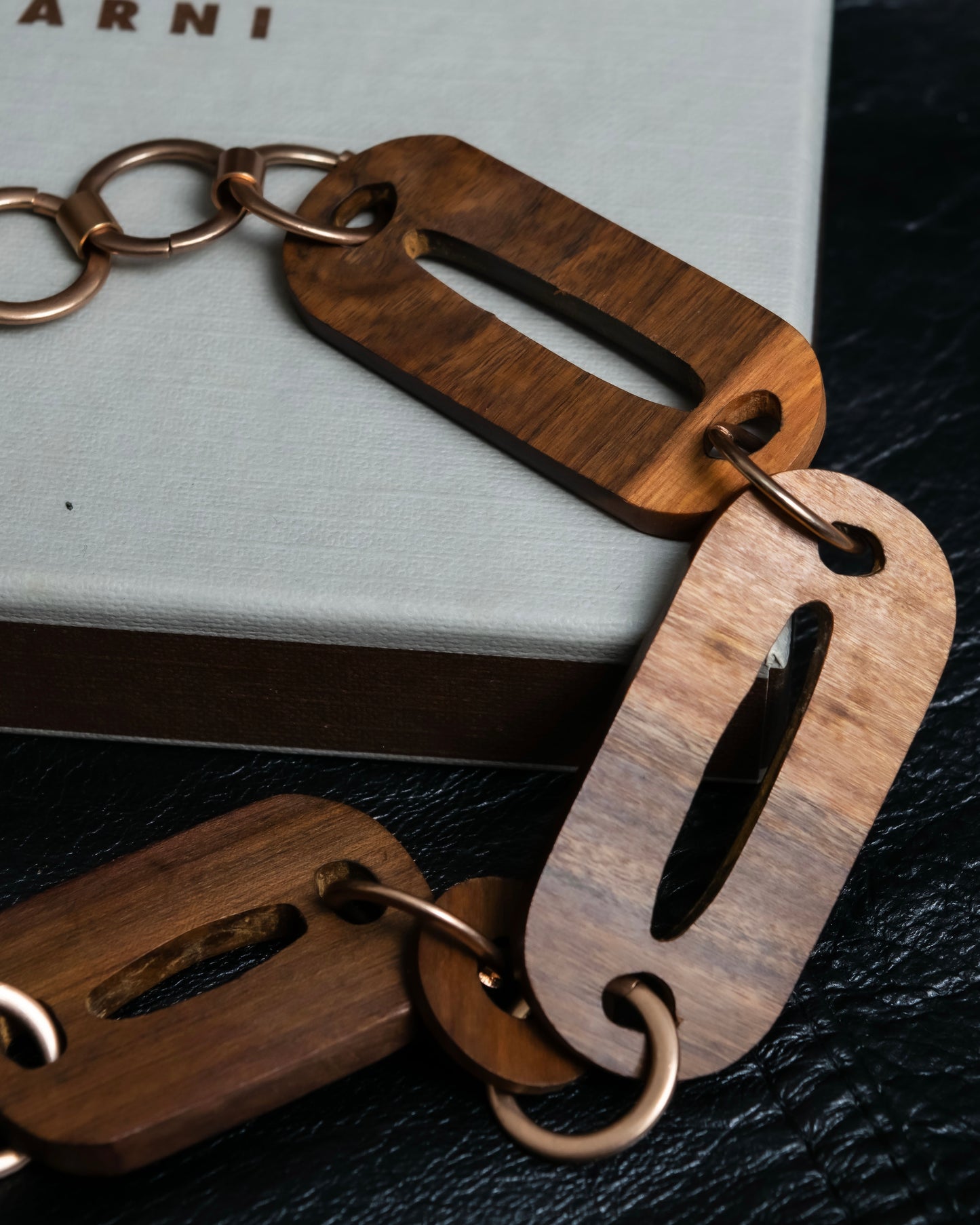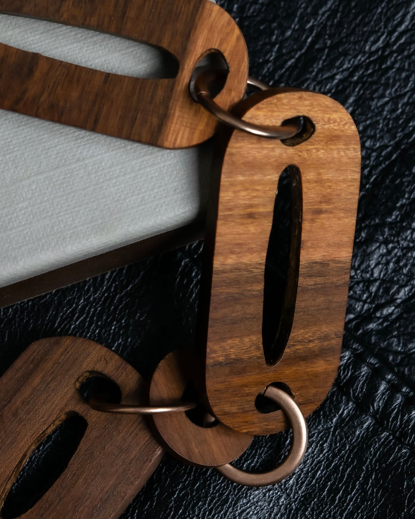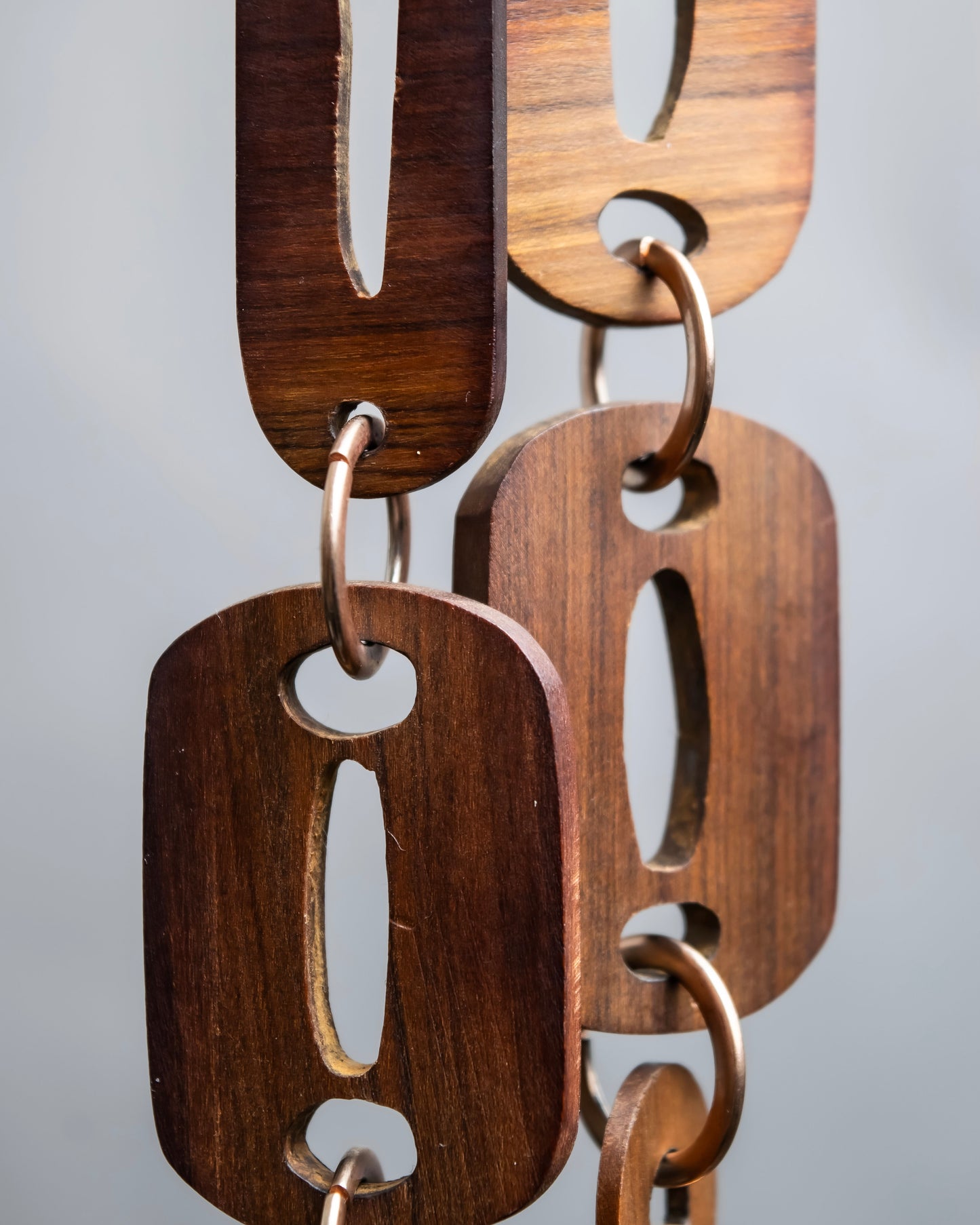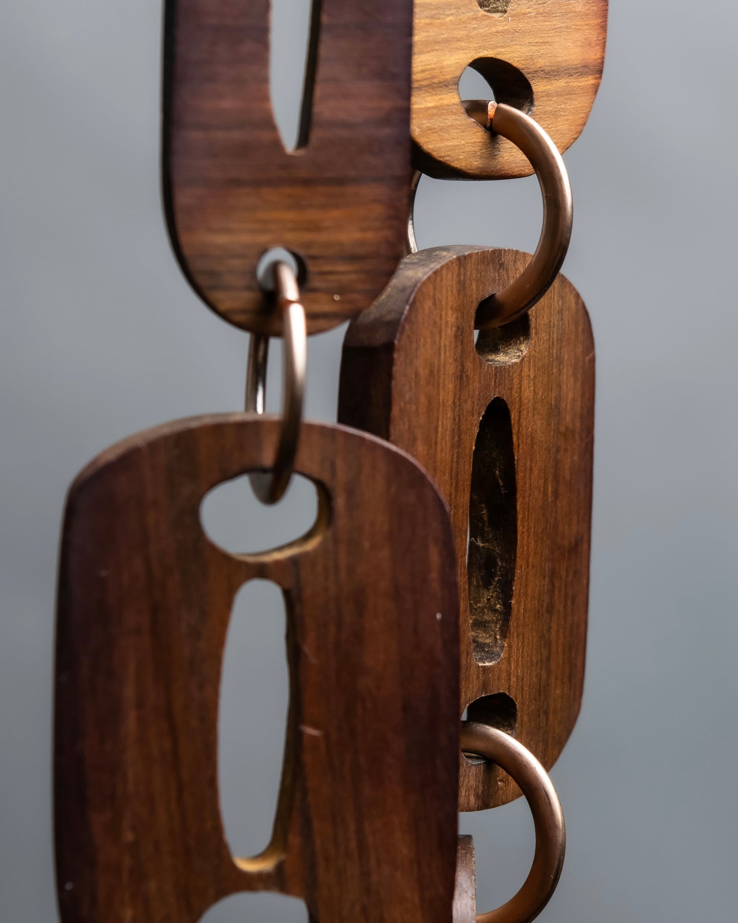 This is a truly eye-catching piece with expressive wooden parts and a gorgeous golden chain.