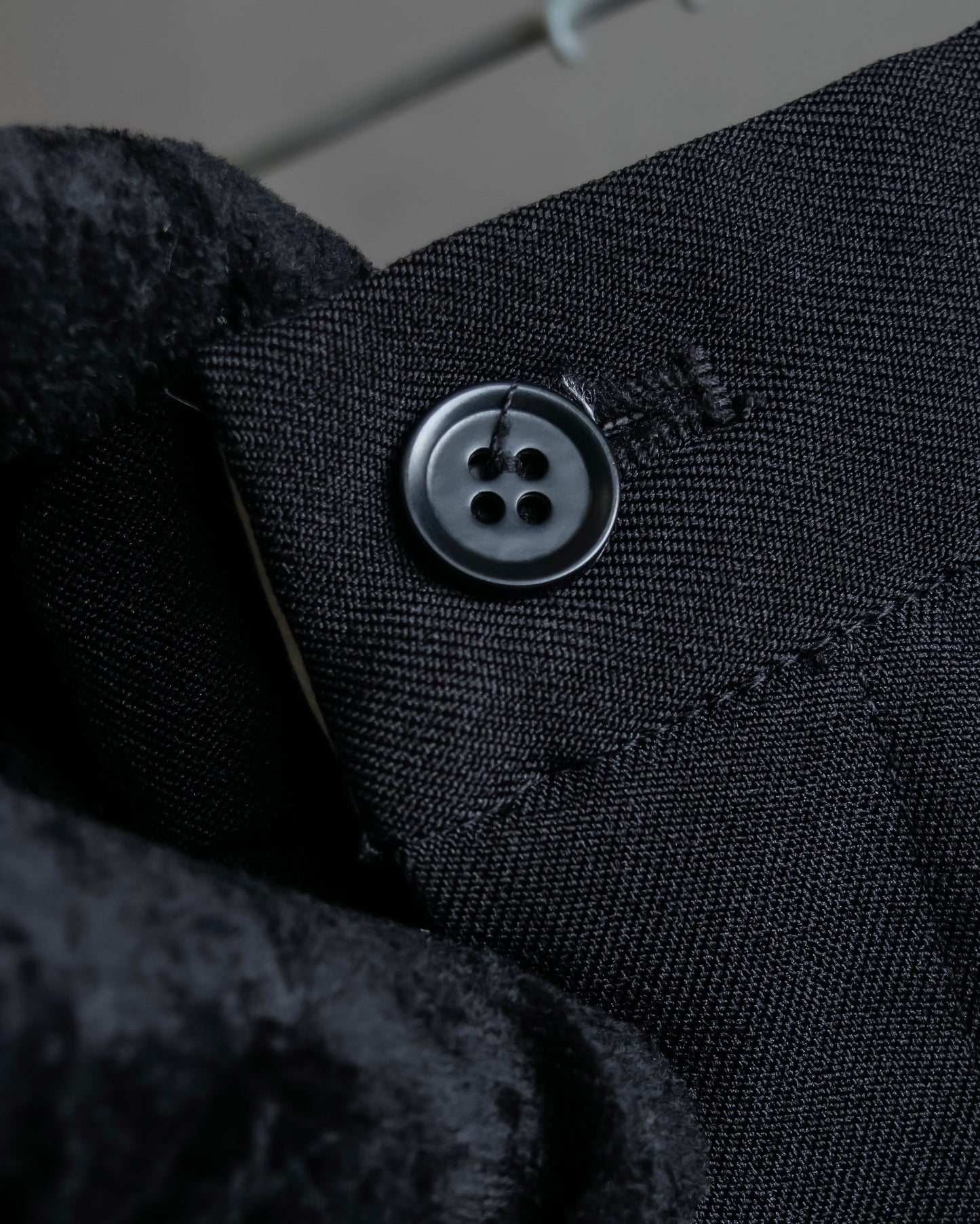 This piece expresses the motif of "disconnection and overlap," a particularly symbolic theme from the 2019 Spring/Summer collection, on the lower body, and is a highly experimental product both aesthetically and structurally, where the precision of tailoring intersects with a deconstructed approach, embodying the theme of "reconstructing clothing," which the brand has been exploring for many years.