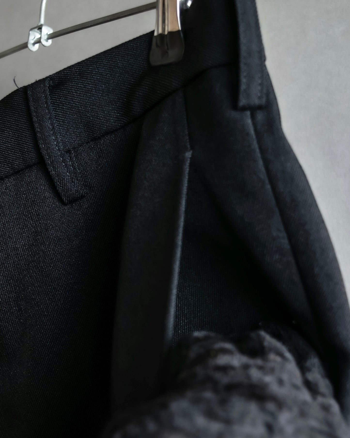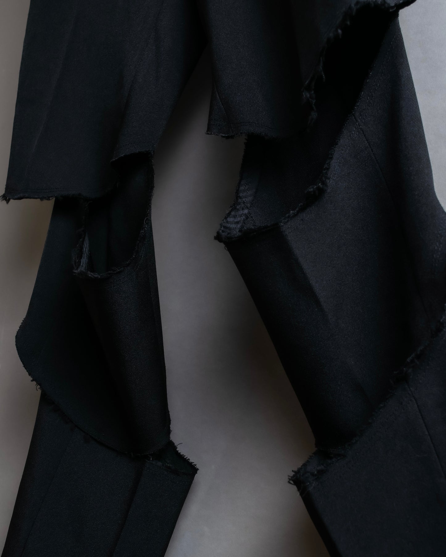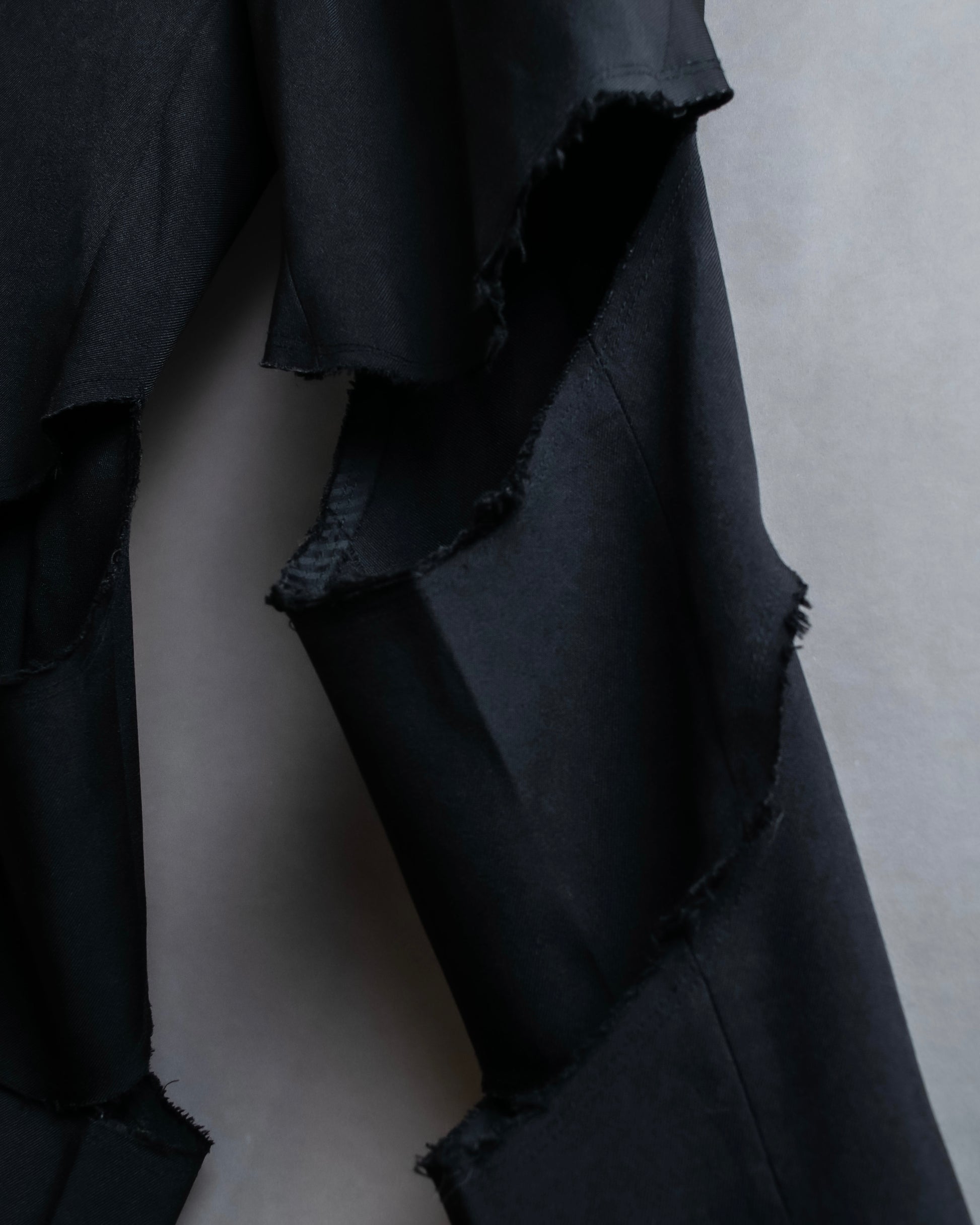 The back pockets and waist tailoring are modeled on traditional dress slacks, creating a sharp contrast between orthodox beauty and cutting-edge design. These are not just "damaged pants," but an experiment proposing a new way of dressing, premised on the space created by the tears allowing the movement of the body and innerwear to interfere with the material.