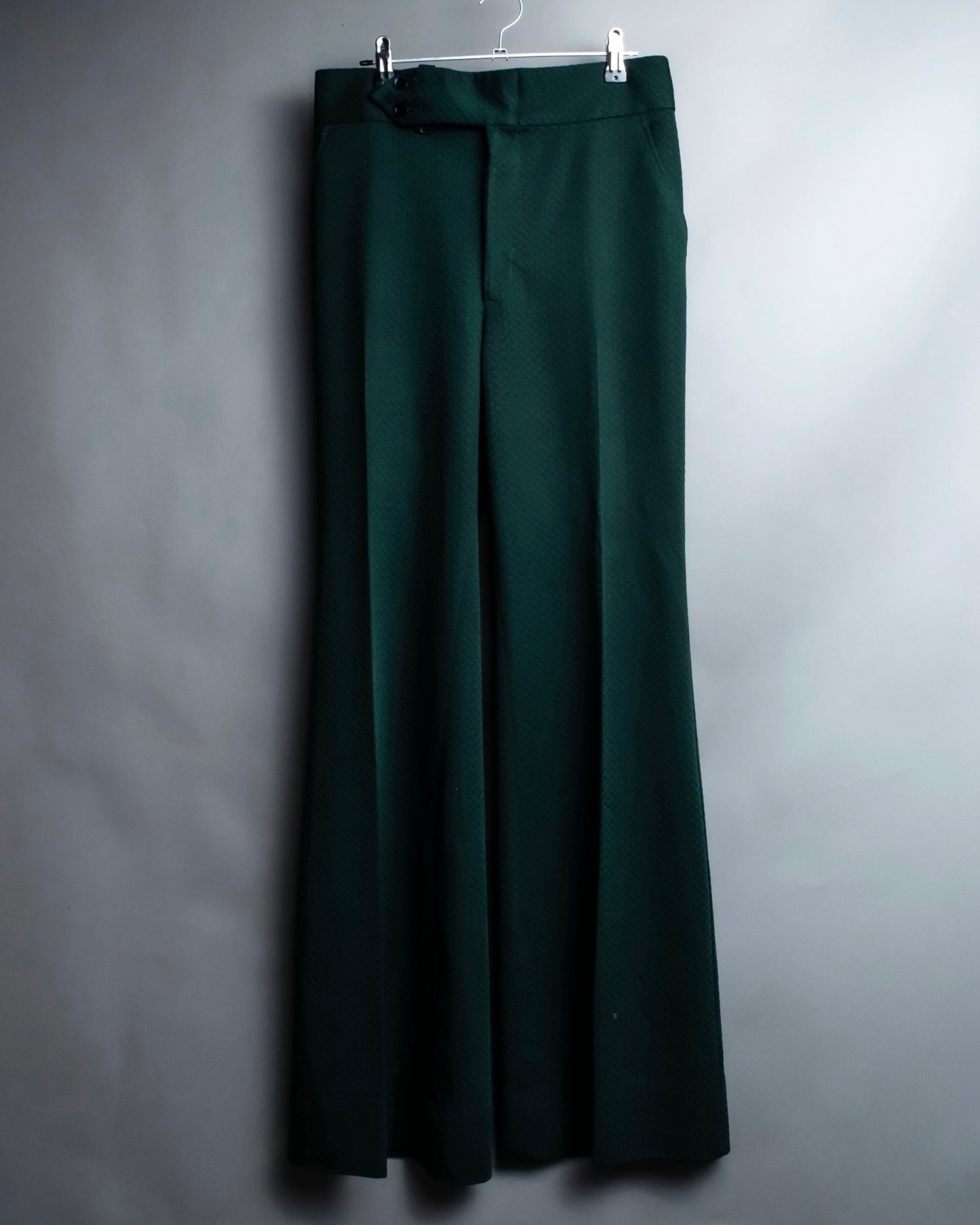 Polyester flare slacks reminiscent of the 70s. They feature a three-dimensional beautiful silhouette that strongly conveys the shape of the center press. Additionally, the iconic expression shown by the total pattern design fabric pairs exceptionally well with modern items. In summer, they are a remarkable piece that can be paired with a T-shirt.