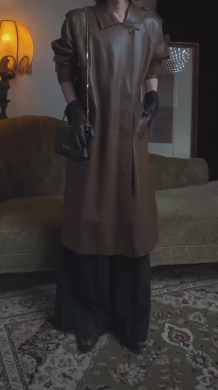 En cuanto al diseño, la longitud larga con volumen generoso se combina con un corte raglán en los hombros que permite libertad de movimiento, resaltando la caída natural del cuero, que es clave para su belleza.