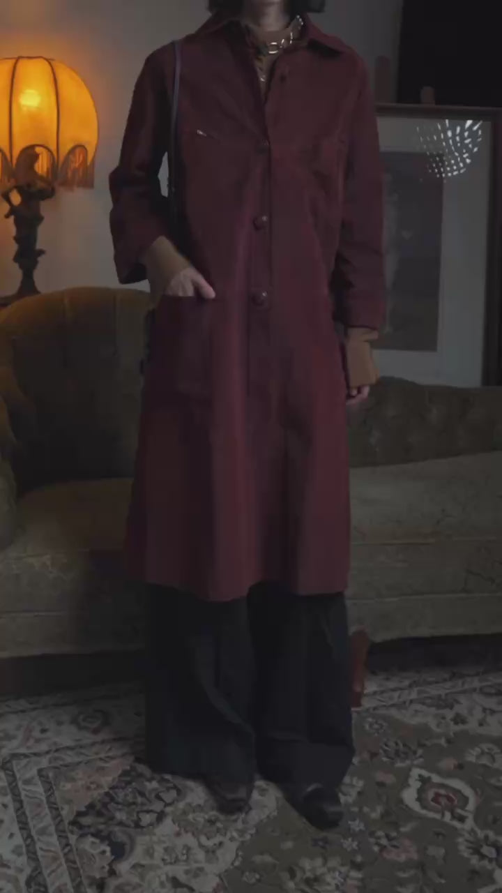 El ante de un profundo burdeos cubre toda la prenda, y su textura absorbe la luz, creando una profundidad en el color y sombras muy elegantes. El cuello redondo aporta suavidad, mientras que la parte frontal con botones mantiene las líneas verticales, logrando un acabado pulido sin dulzura excesiva. En el pecho, hay bolsillos con cremalleras a ambos lados, que guían la mirada hacia arriba, evitando que la prenda se vea larga y desproporcionada, y además cuenta con un gran parche en la cintura, combinando funcionalidad y estilo. Los hombreras con hombreras sutiles aportan un toque de aire de viaje o uniforme, y las cremalleras en las puñas permiten ajustar el ajuste en las manos. Los botones parecen de cuero con diseño de nuez, con la inscripción de un entrelazado G. Gucci en el centro, que mantiene un perfil discreto pero con autoridad. La etiqueta presenta la inscripción en cursiva de G. Gucci, un escudo con caballero y escudo, y la mención de s.r.l., además de Made in Italy, Genuina Leather y la talla 44, indicando que fue fabricado en Italia durante la época en que Gucci era controlada por la familia. Aunque en la parte inferior hay una pequeña variación de color, no afecta la apariencia general y se integra naturalmente en el estilo vintage.