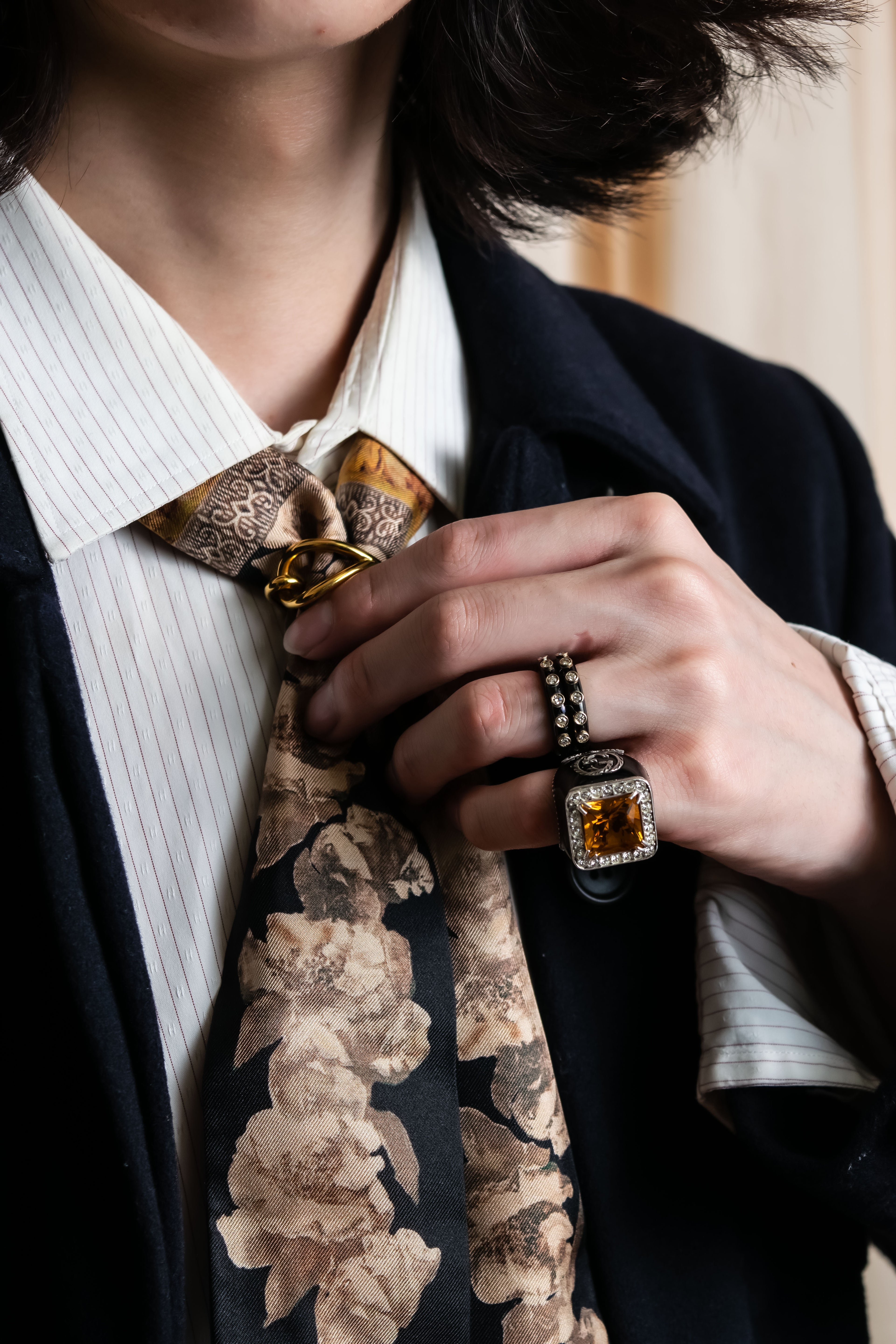 "GUCCI" Amber rhinestone GG motif engraved signet ring -