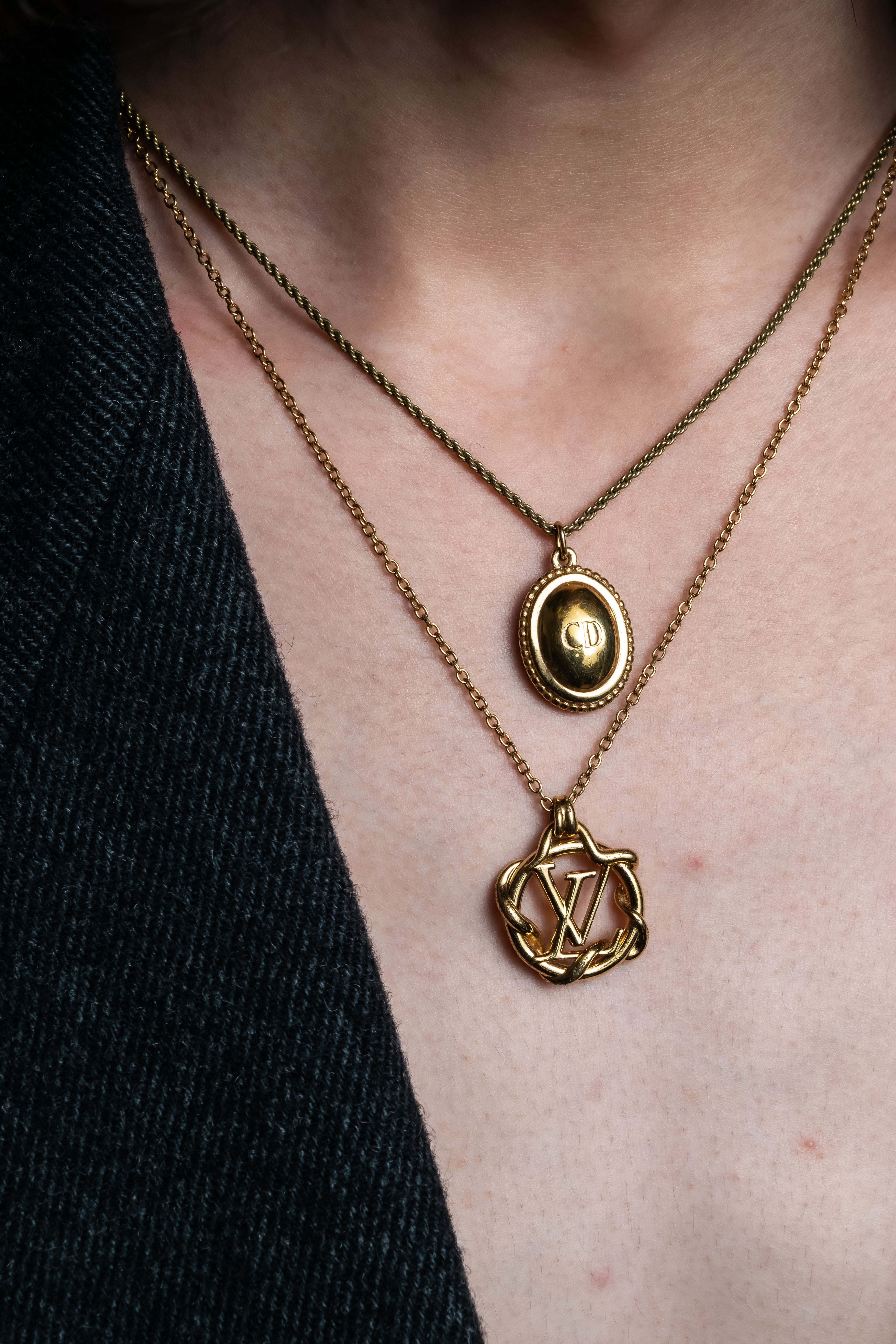 "Christian Dior" Logo engraved oval top motif gold necklace