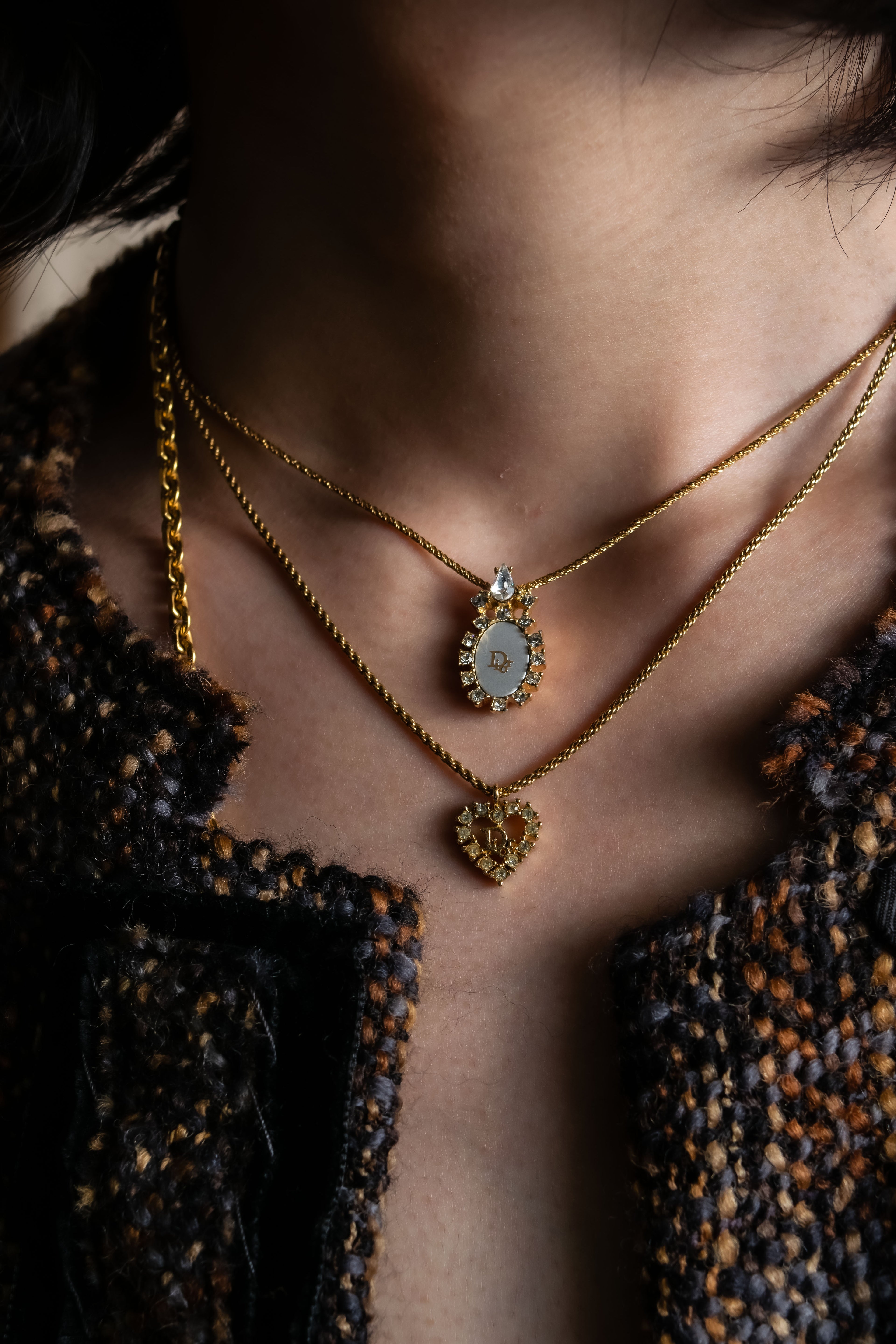 "Christian Dior" Rhinestone studded CD logo design in gold necklace -