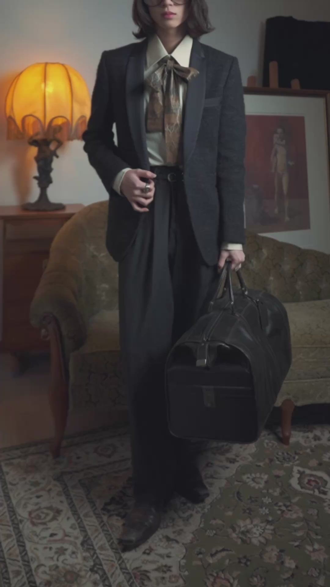 まず特筆すべきは、タキシードの象徴であるショールカラーをサテンで切り替えている点で、光を受けたときの面の滑らかさが顔周りへ品格を与える為、ボディのラフな毛羽立ちが単なるカジュアルへ転ばず、緊張感のあるバランスで成立していますね。さらに生地は綿を軸にモヘヤを大きく混ぜ、ナイロンとウールで輪郭を支える混率となっている為、モヘヤ特有の長い毛足が空気を含みながらも、ジャケットとしての形を保てる実用性が確保されています。