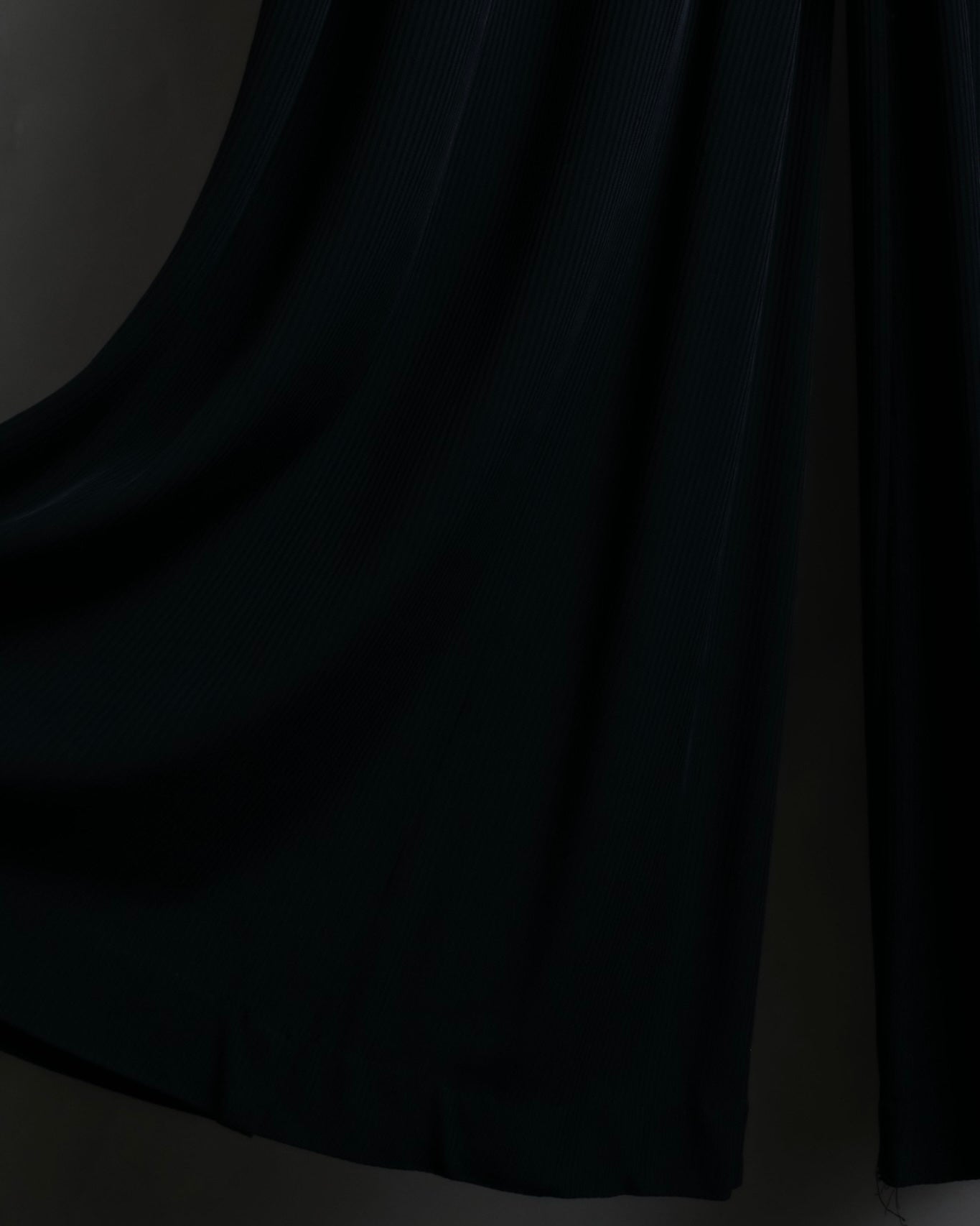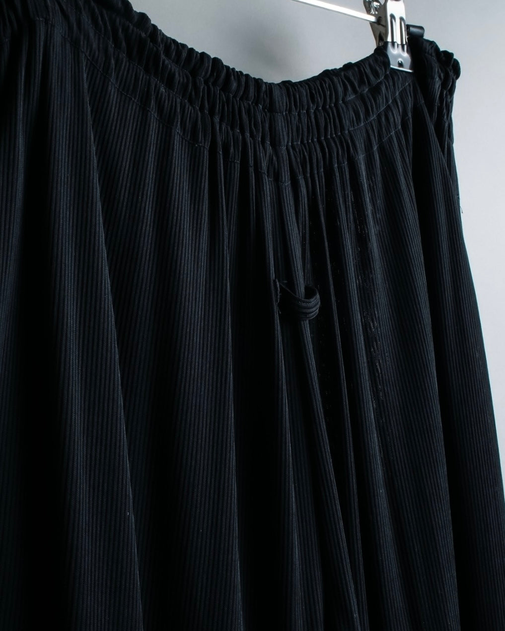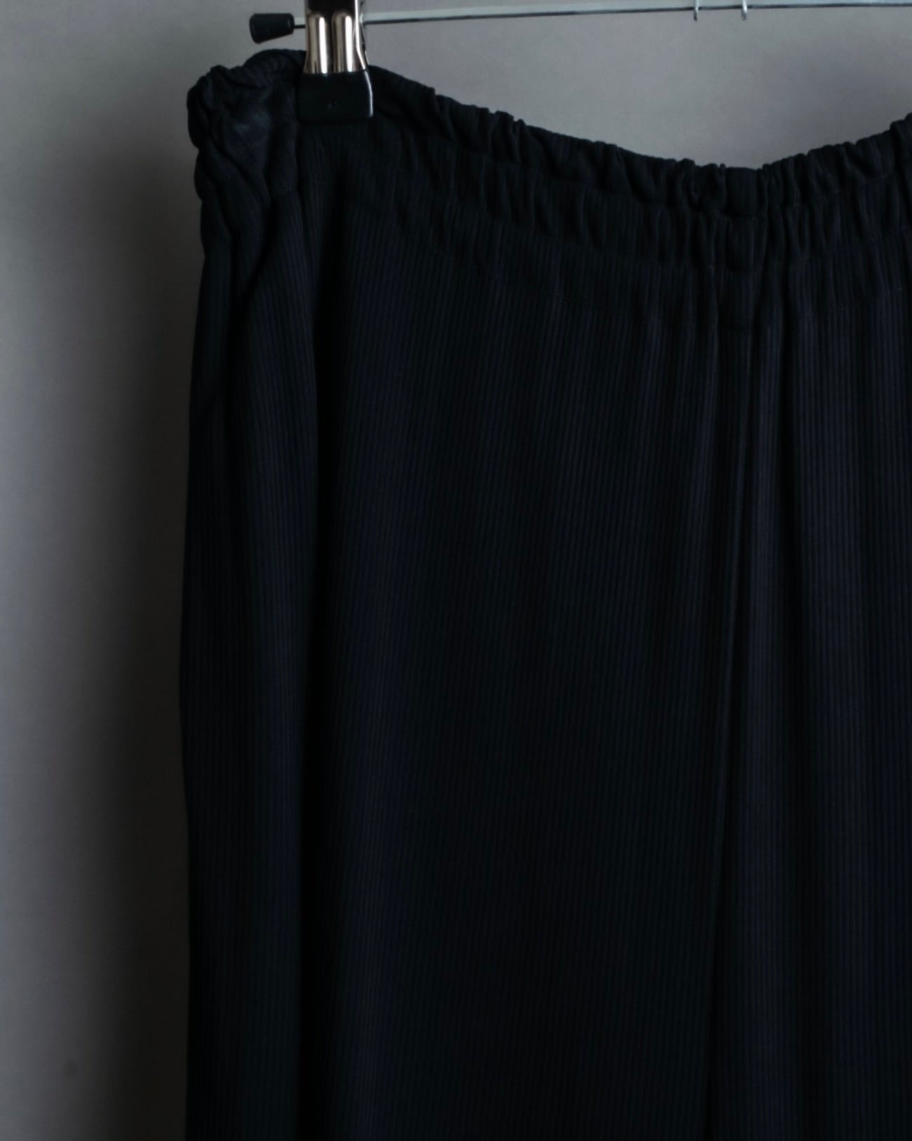 非常に細かなプリーツが全面にあしらわれたデザインと、裾にかけてゆったりとしたバギーシルエットによる、優雅な雰囲気漂うドレープ感が魅力のこちらの逸品。