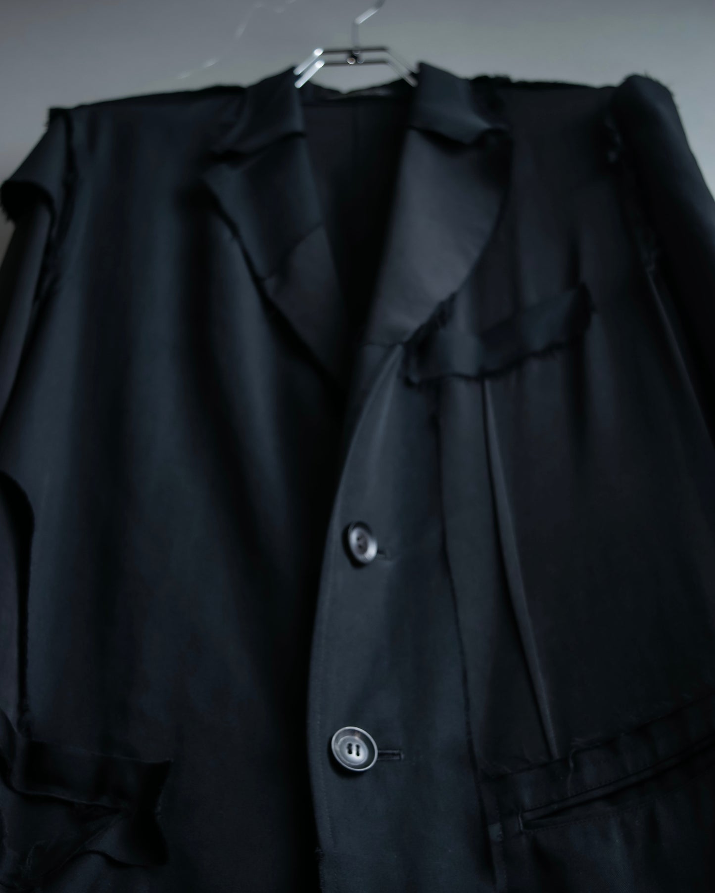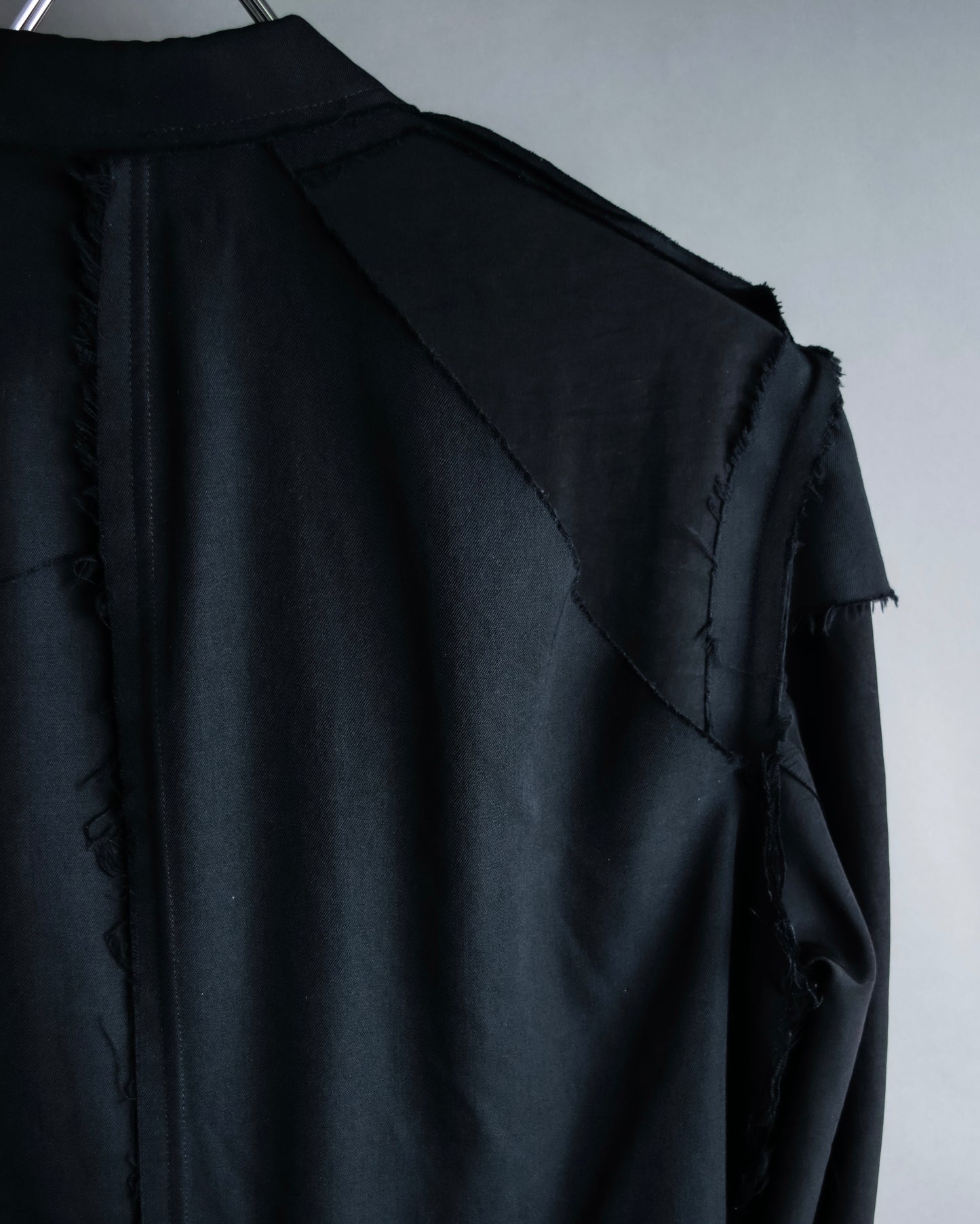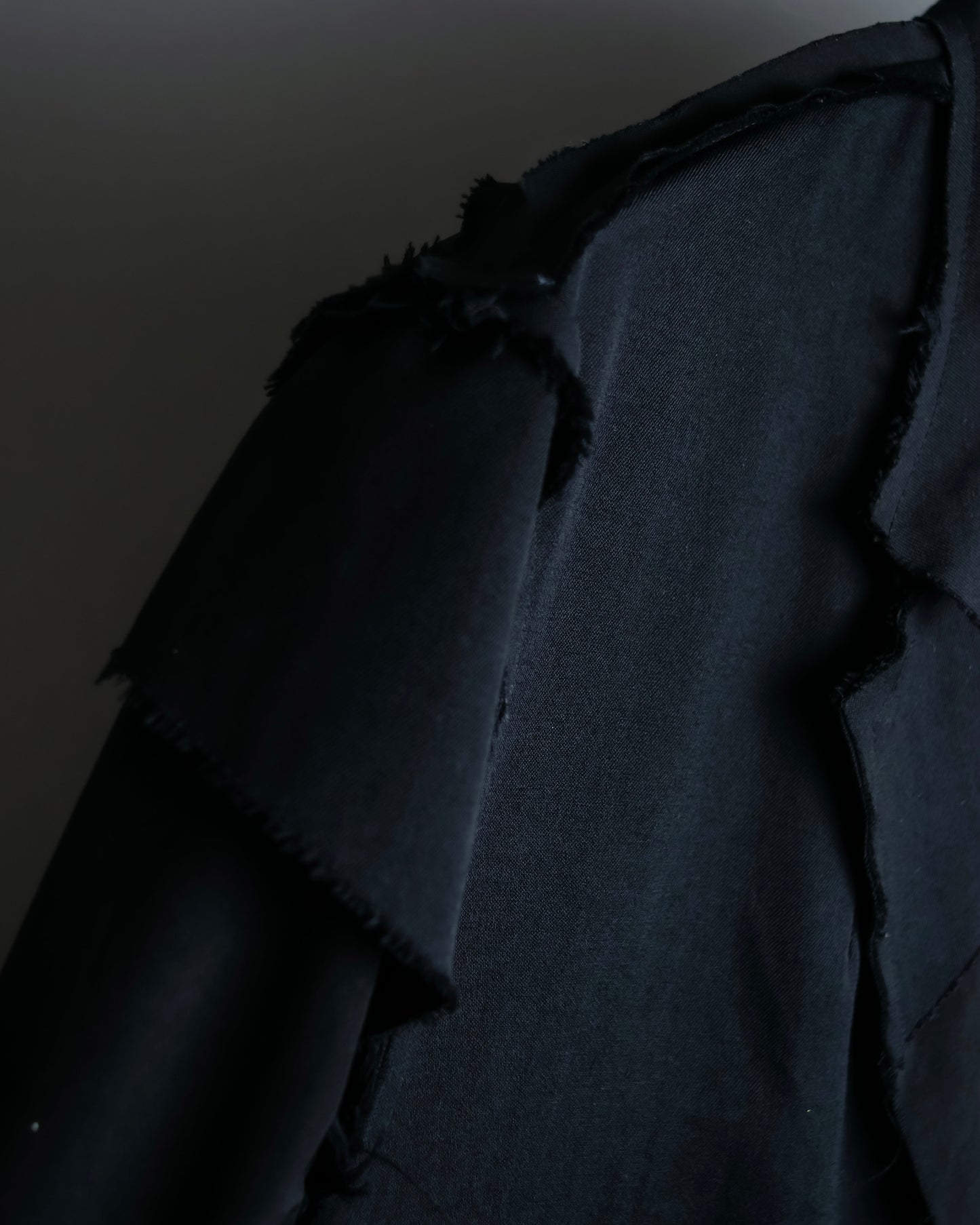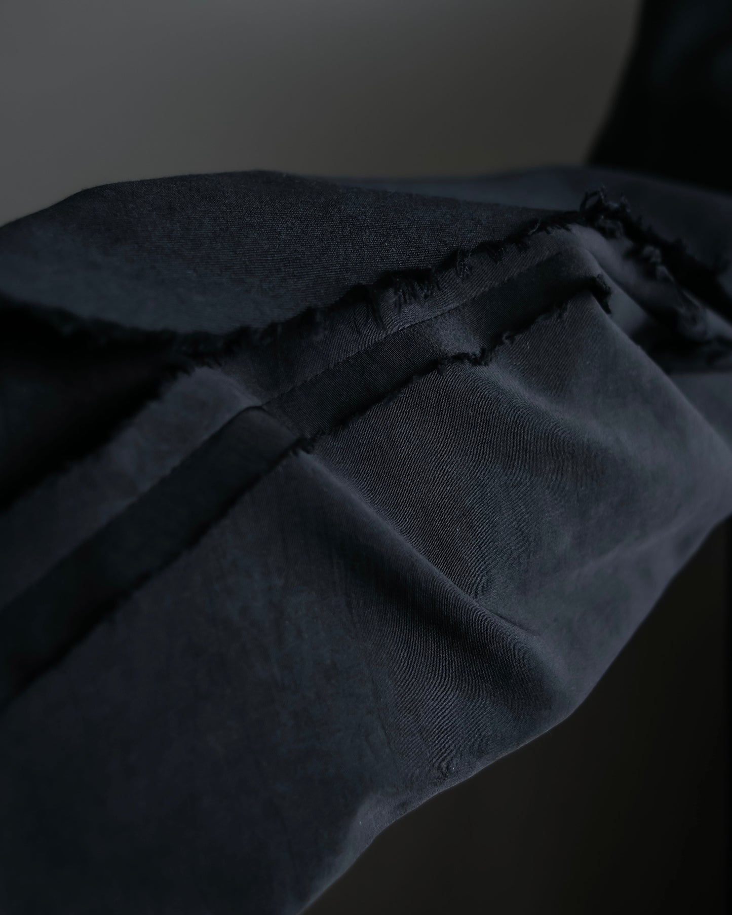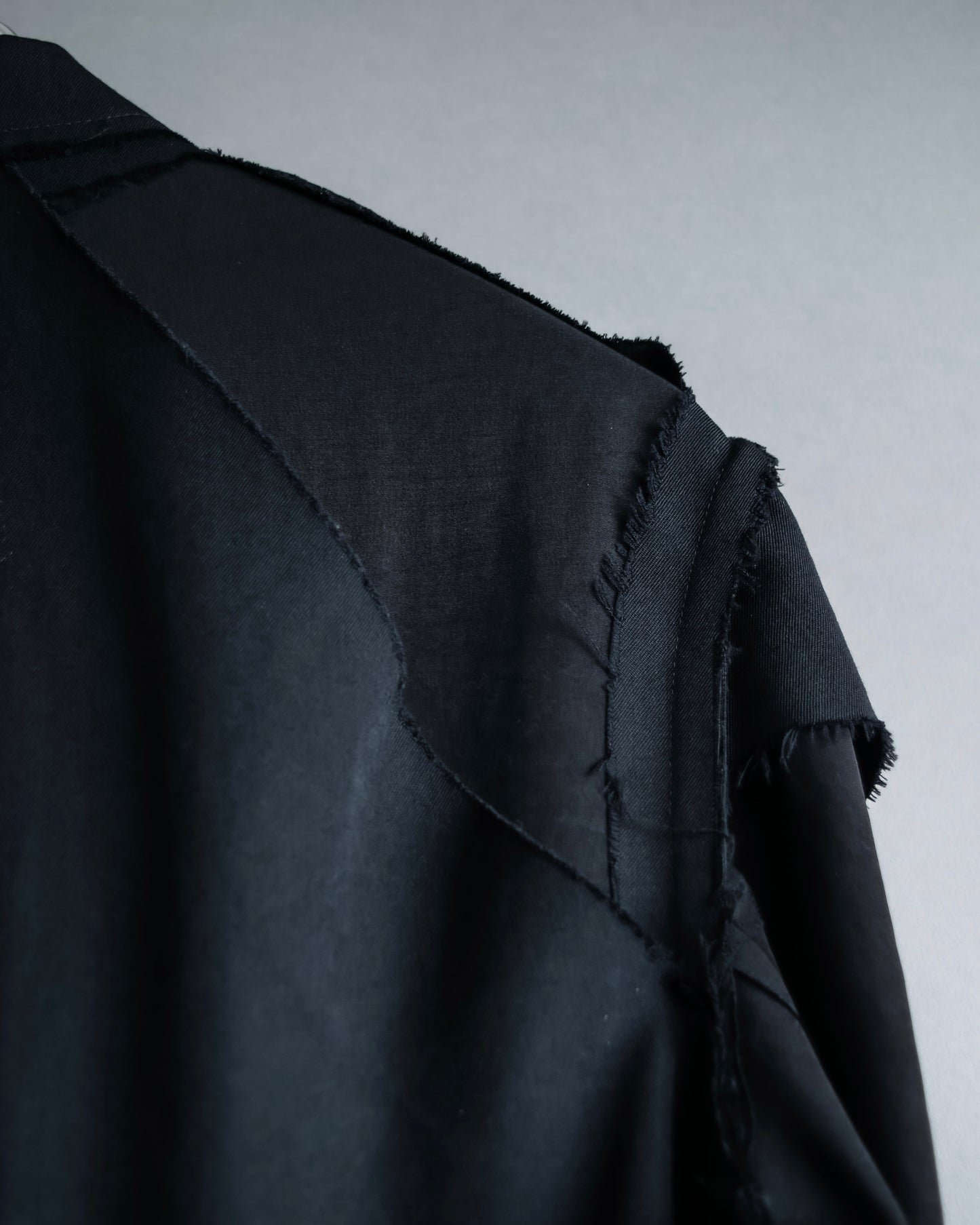 それらが生み出すアヴァンギャルドな魅力が最大の特徴となっておりますが、生地感についても極薄のポリエステルを使用している為、ここから先の季節にシャツとして長くご着用頂けるスペシャルなアイテムという側面も持ち合わせています。