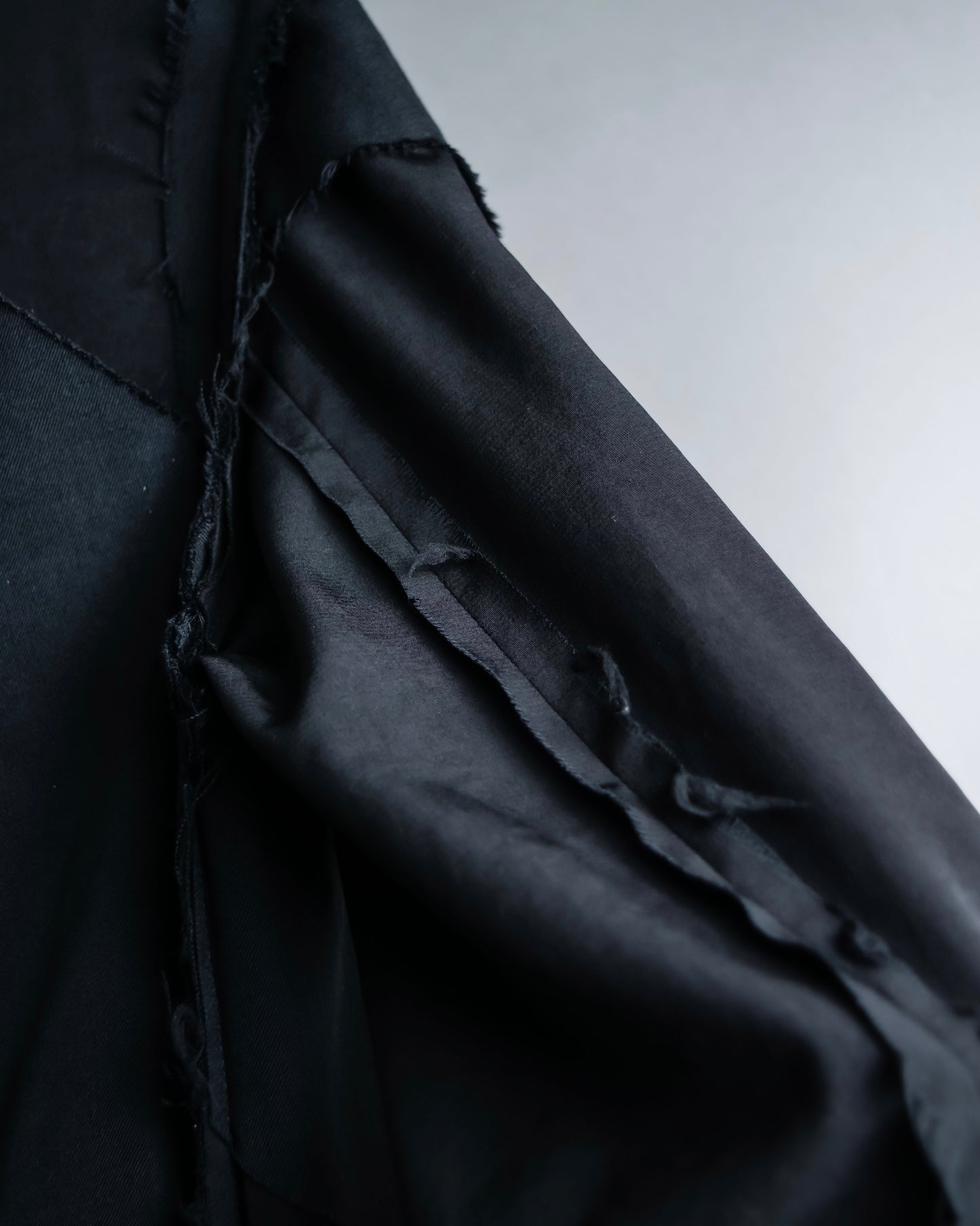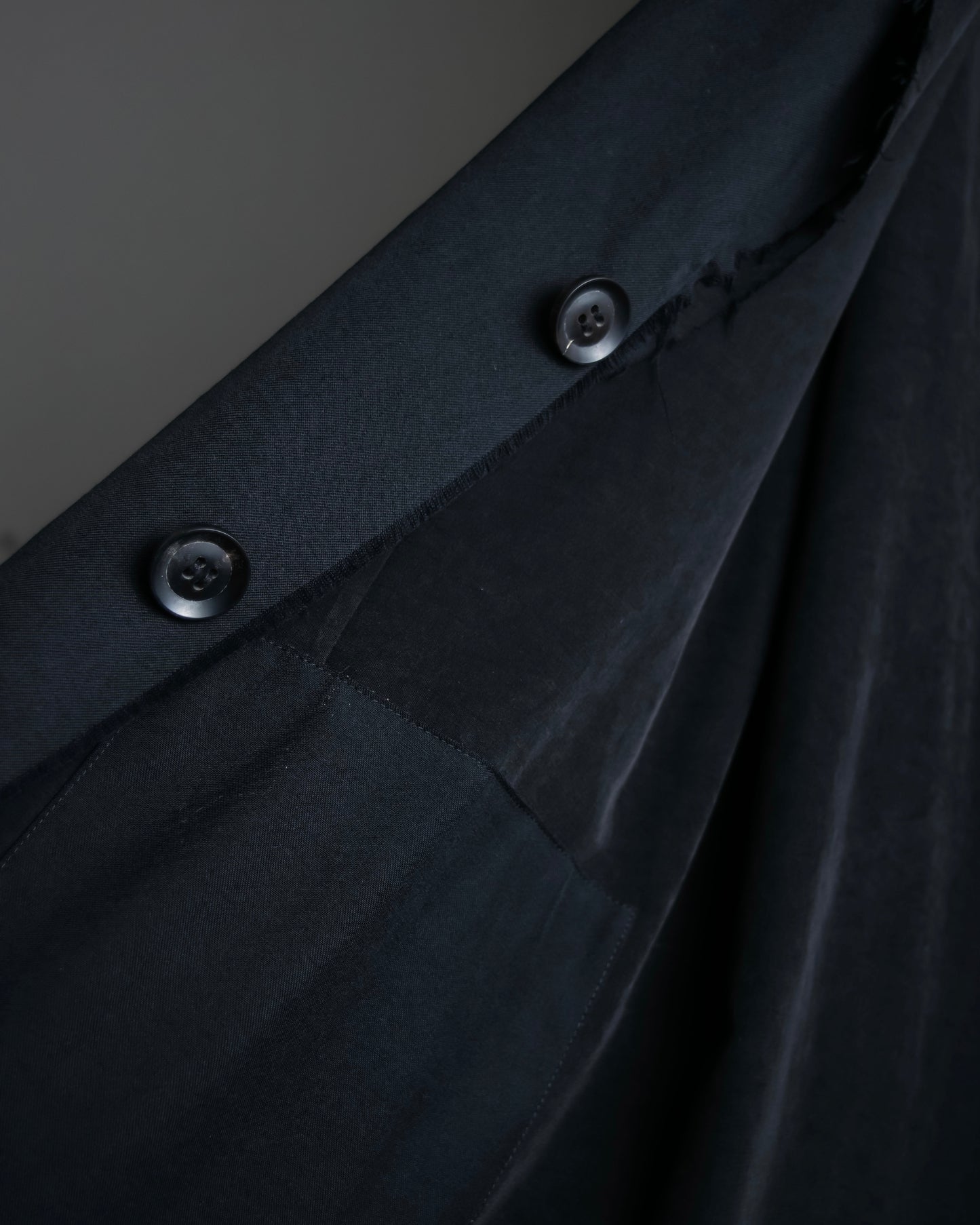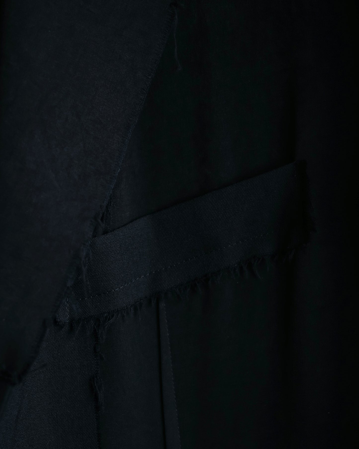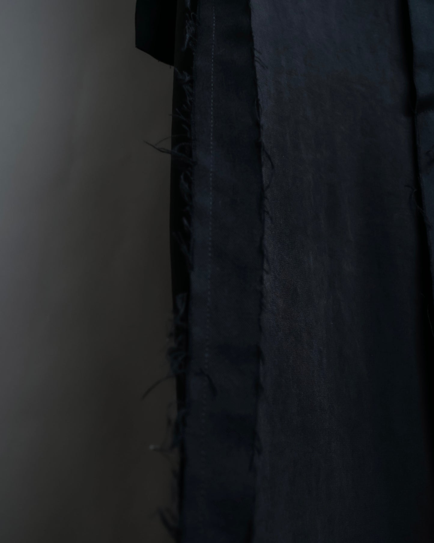 全体的に、様々な大きさの生地をつなぎ合わせ、切りっぱなしというプロセスを踏んでいてますが、左右でパターンが異なるという大変手間のかかる構成となっております。