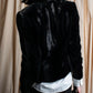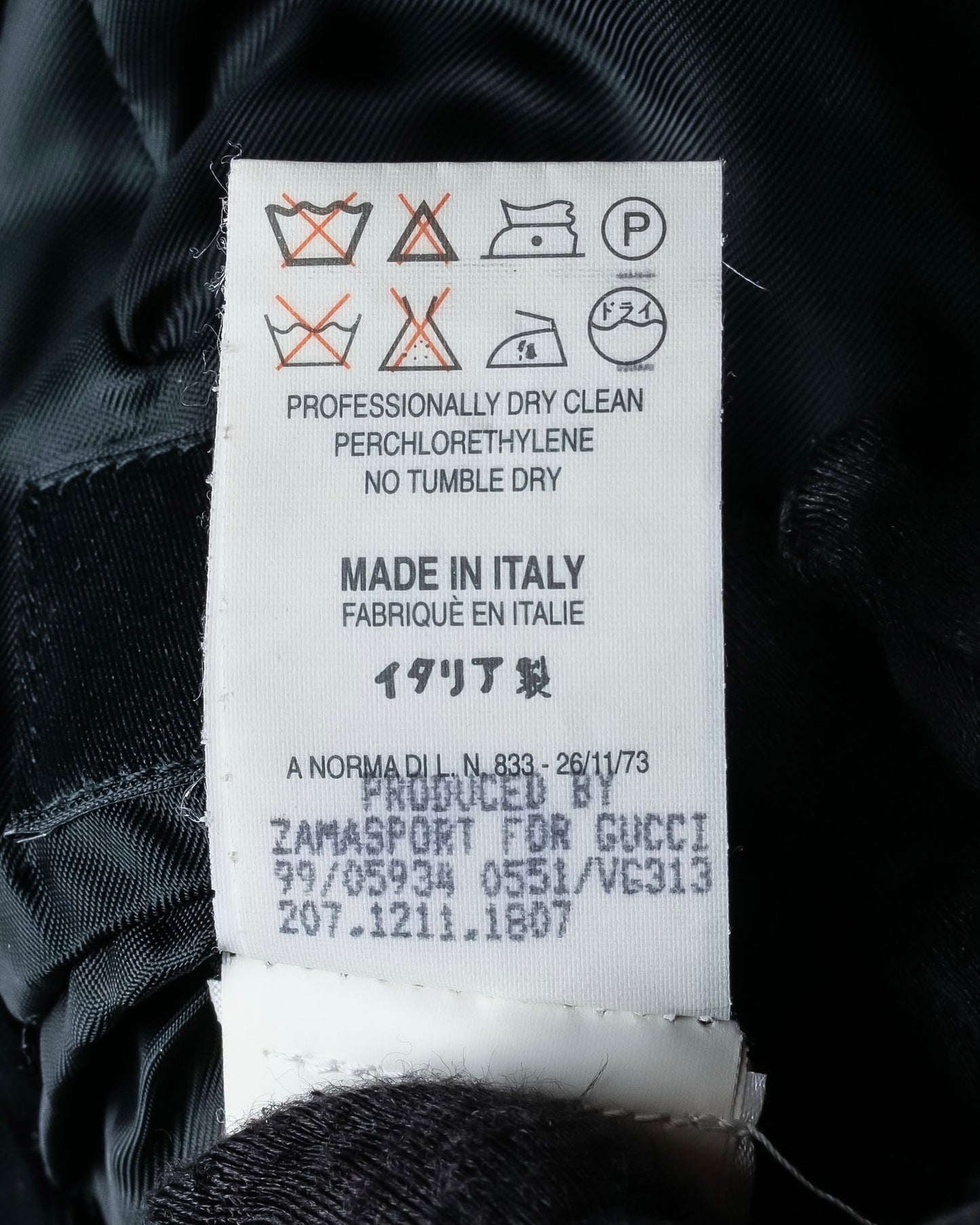 内側は総裏仕立てで、裏地には鈍く光を吸い込むブラックの滑らかなサテンが用いられており、着用時の滑りも良く、秋冬にかけてのインナーとしても快適にご着用いただけます。サイズは40表記で、レディースのM相当となり、ややコンパクトな作りでありながら、肩のラインや身頃のシェイプに構築的な美しさが宿る、GUCCIならではのパターンメイキングが感じられます。