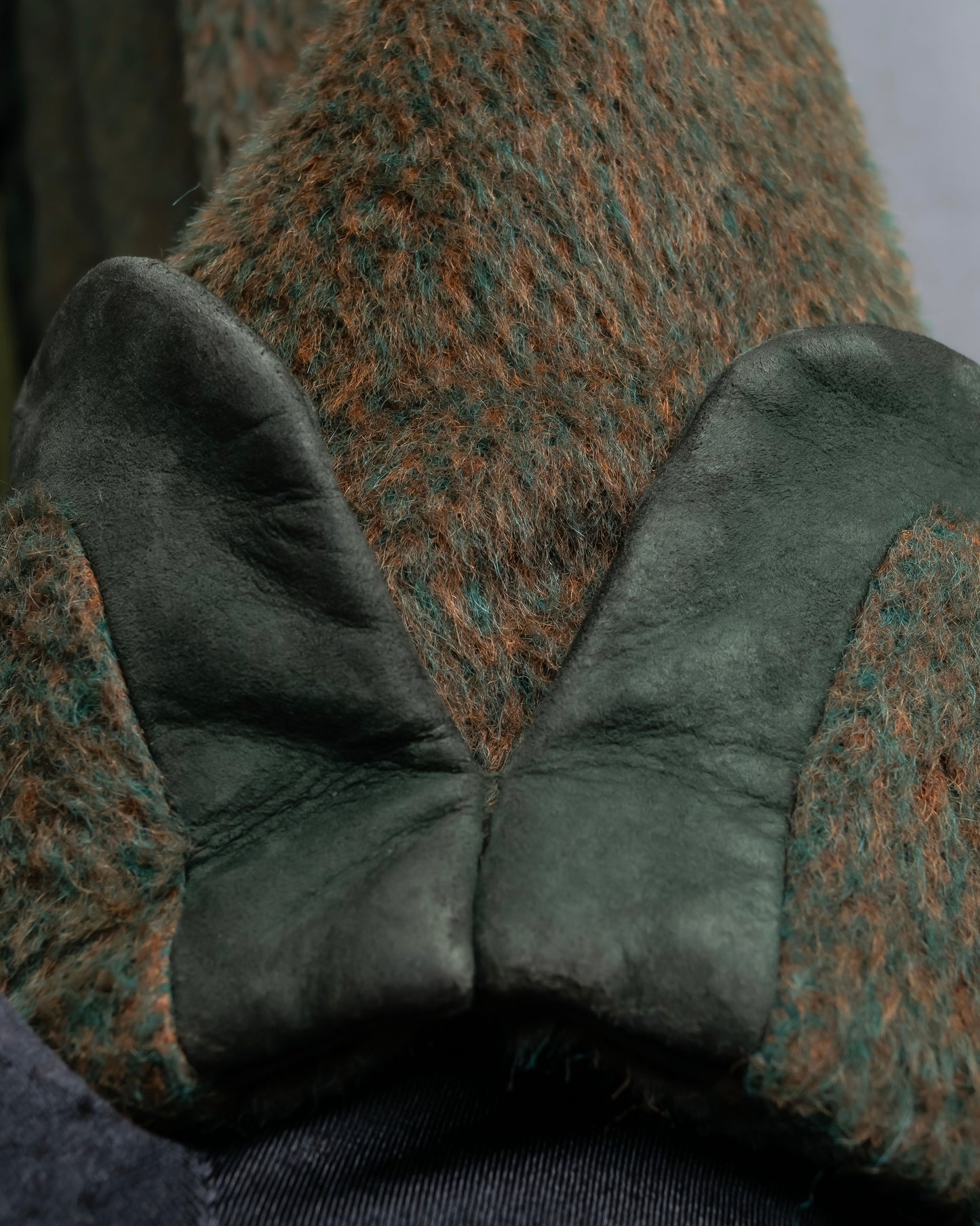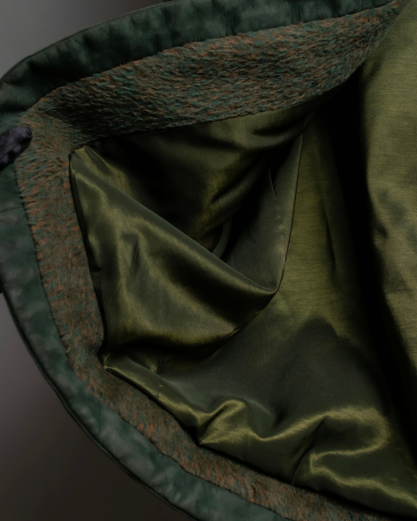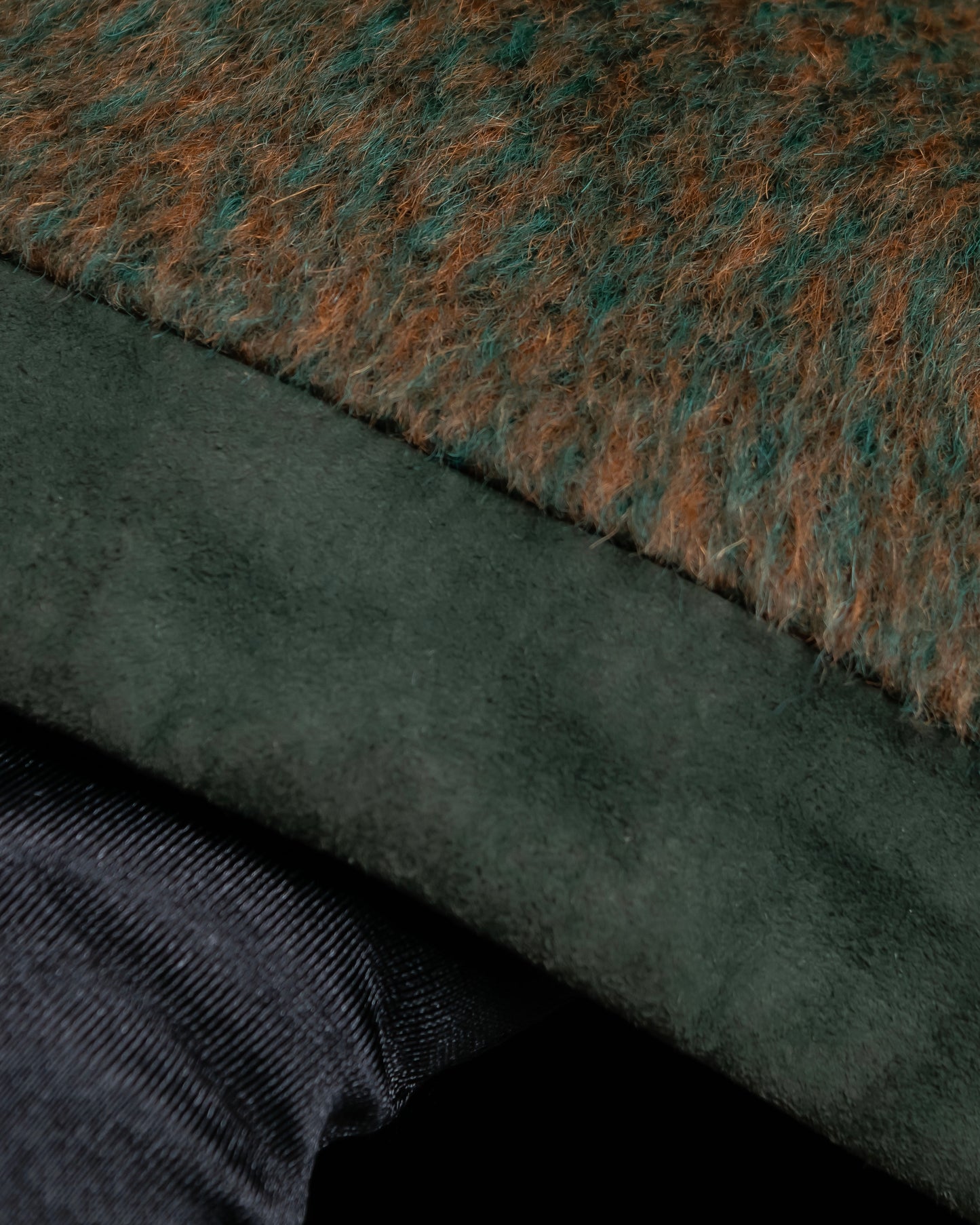 緑やカーキ、オレンジといった多色使いのウールパイル地を使用している為、独自の起毛感と豊かな色彩表現が特徴で、ウールパイル地の柔らかさや暖かさがありながら、色のコントラストが生み出す奥行きと立体感が魅力かつ、視覚的にも楽しめるデザインに仕上がっております。