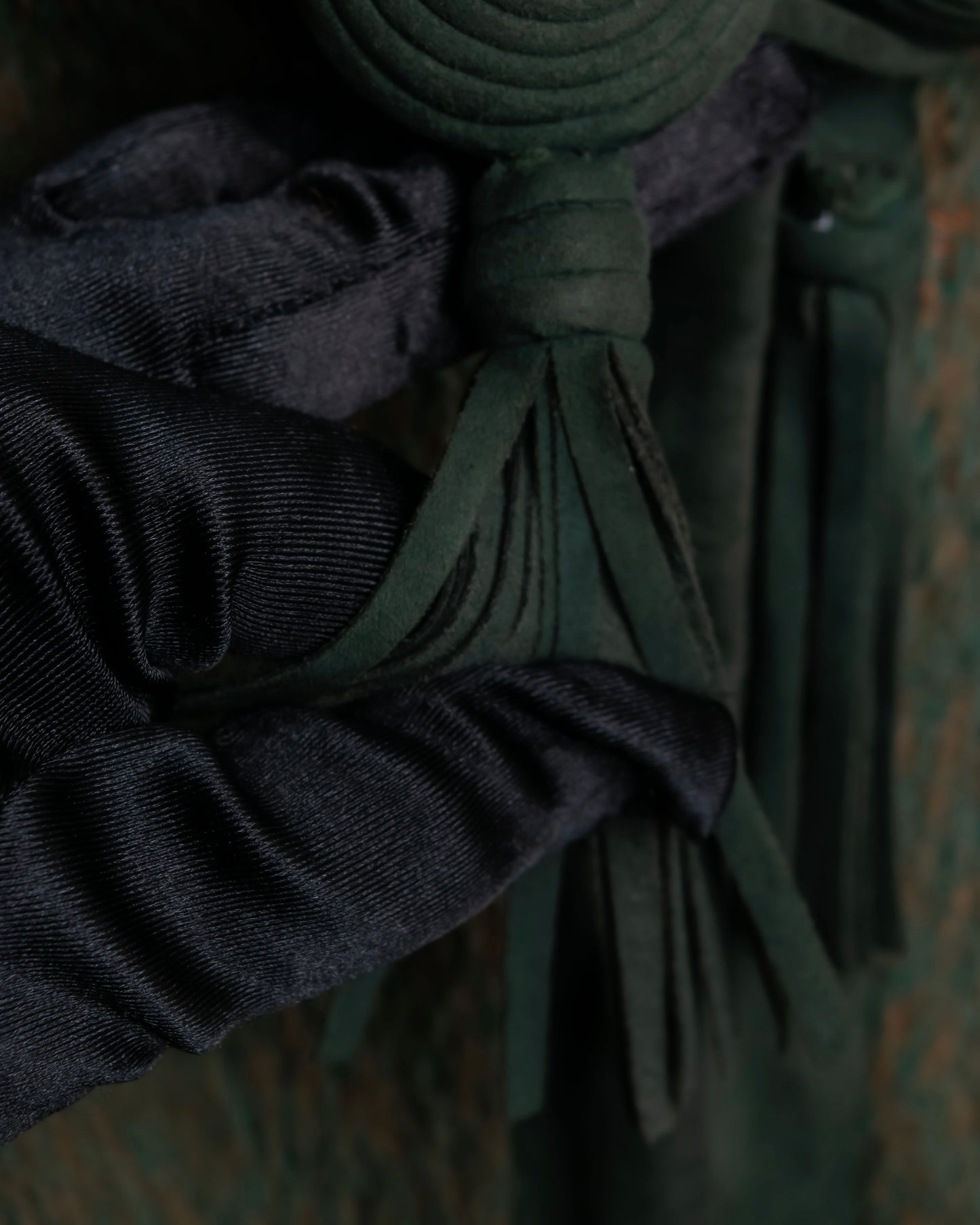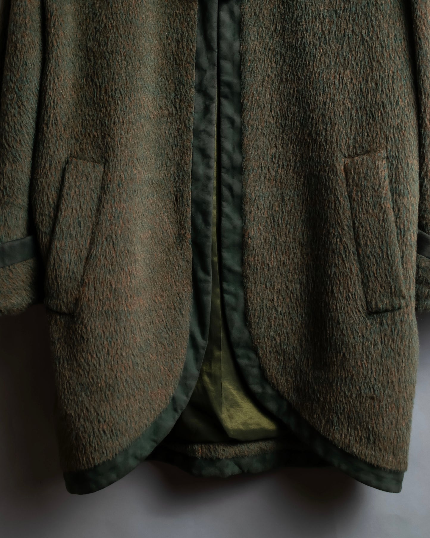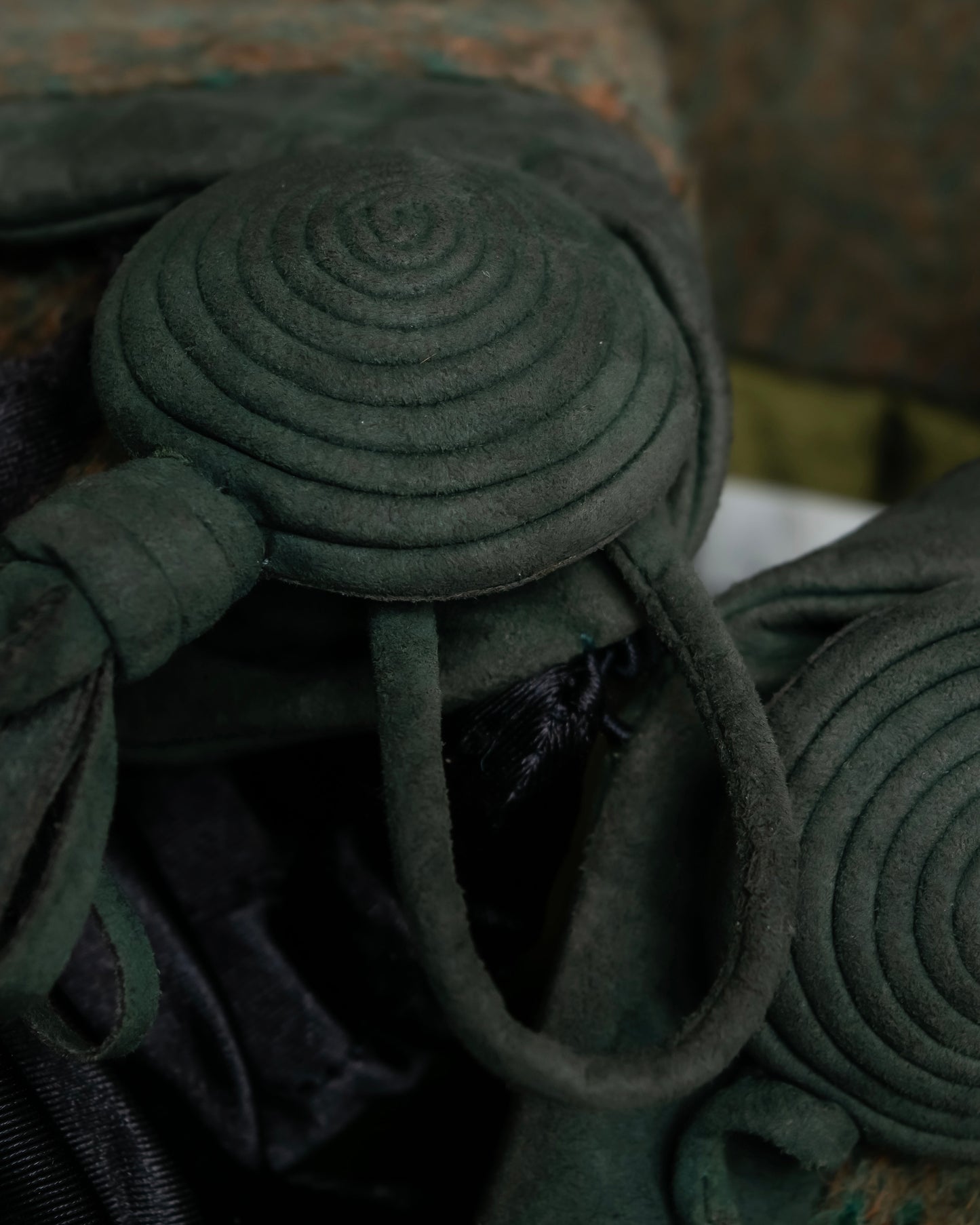 緑やカーキ、オレンジといった多色使いのウールパイル地を使用している為、独自の起毛感と豊かな色彩表現が特徴で、ウールパイル地の柔らかさや暖かさがありながら、色のコントラストが生み出す奥行きと立体感が魅力かつ、視覚的にも楽しめるデザインに仕上がっております。