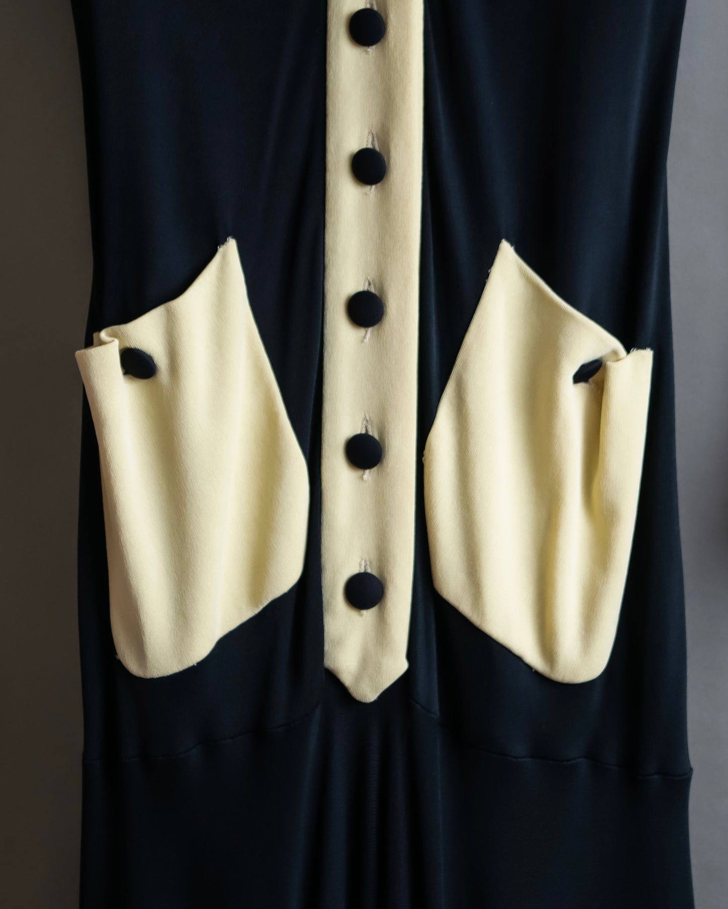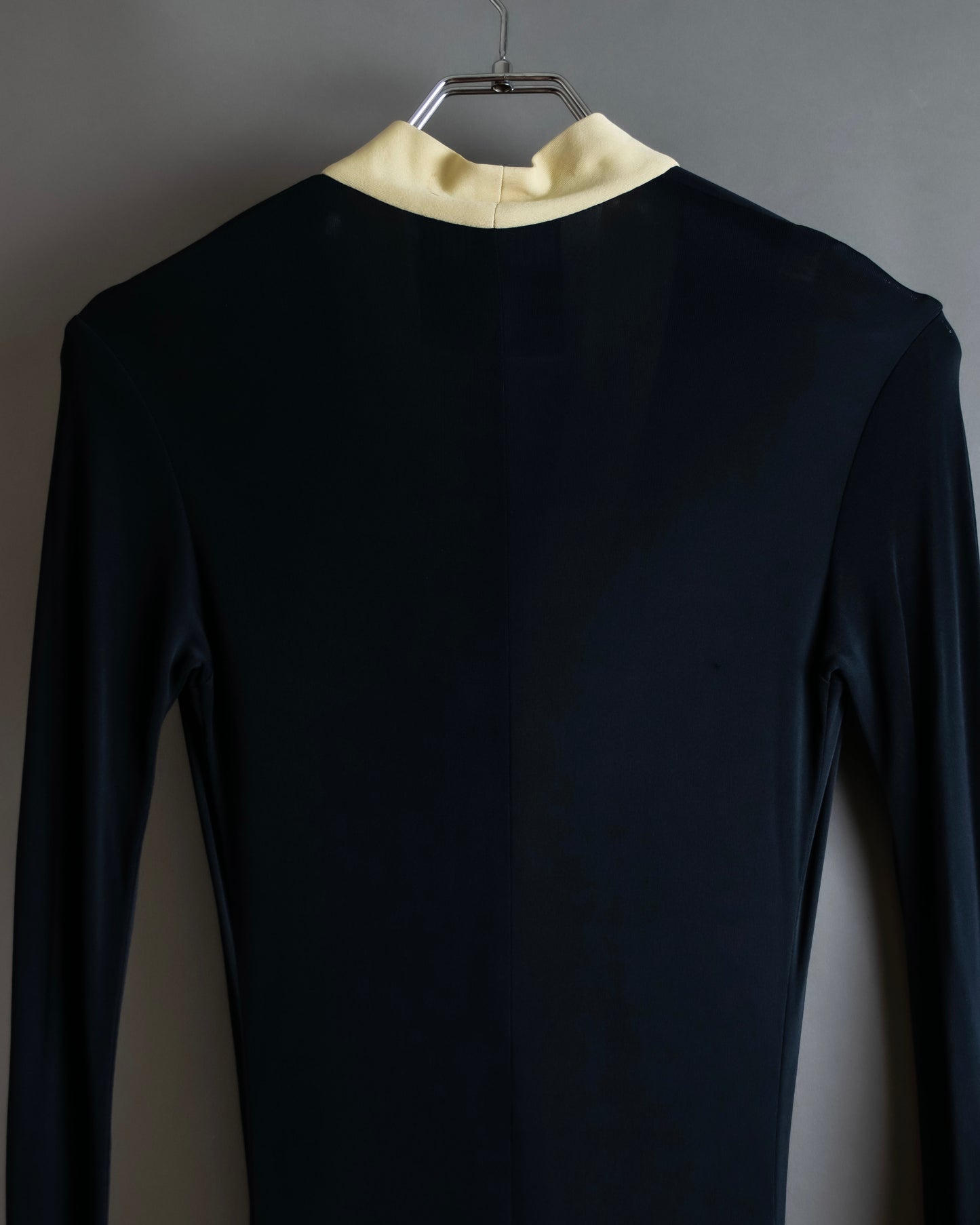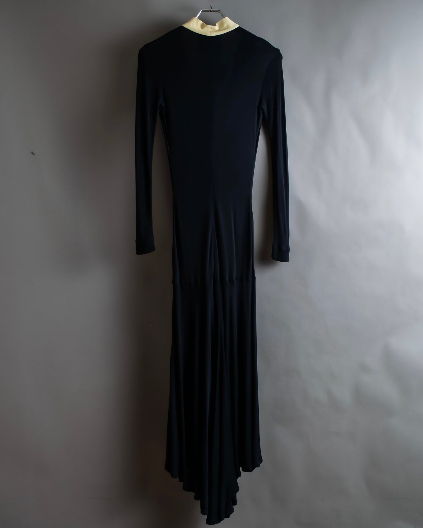 着丈149cmからなるエレガントな印象を演出するロング丈と、聖職者のクレリックシャツを思わせるブラックとオフホワイトのバイカラーデザインがイタリア発のブランドとしての格式高い風合いを放っているこちらの逸品。