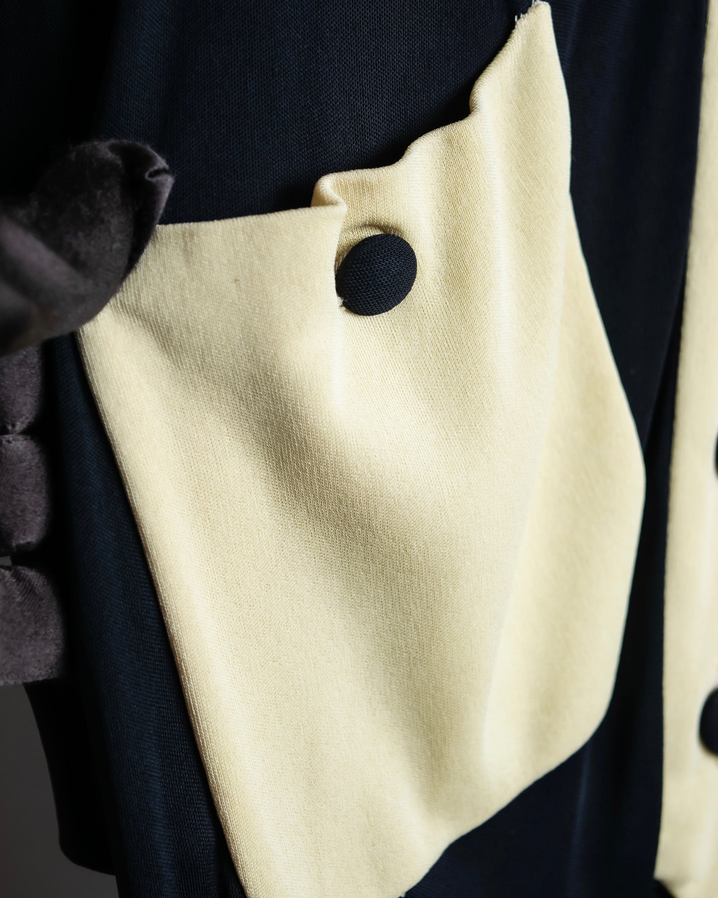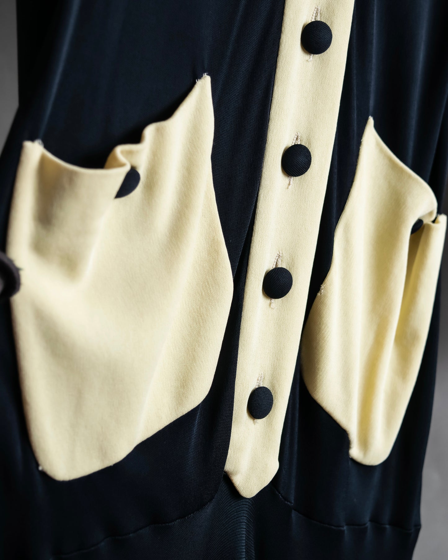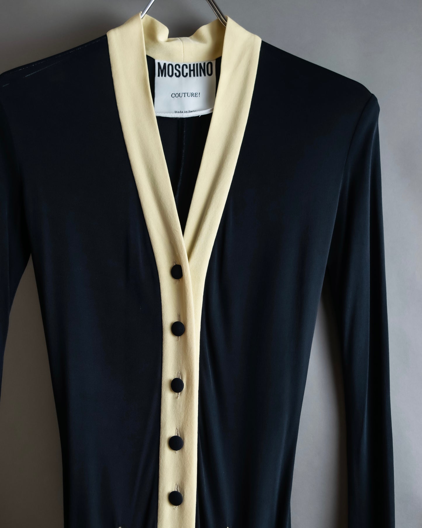 着丈149cmからなるエレガントな印象を演出するロング丈と、聖職者のクレリックシャツを思わせるブラックとオフホワイトのバイカラーデザインがイタリア発のブランドとしての格式高い風合いを放っているこちらの逸品。