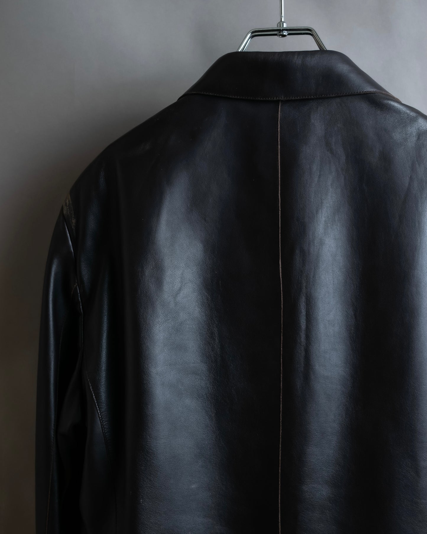 レザーの光沢が上品でありながら強い個性を発揮し、シンプルなテーラリングとの対比を生み出している為、より一層際立った存在感をお楽しみ頂ける計算された技巧を纏っております。