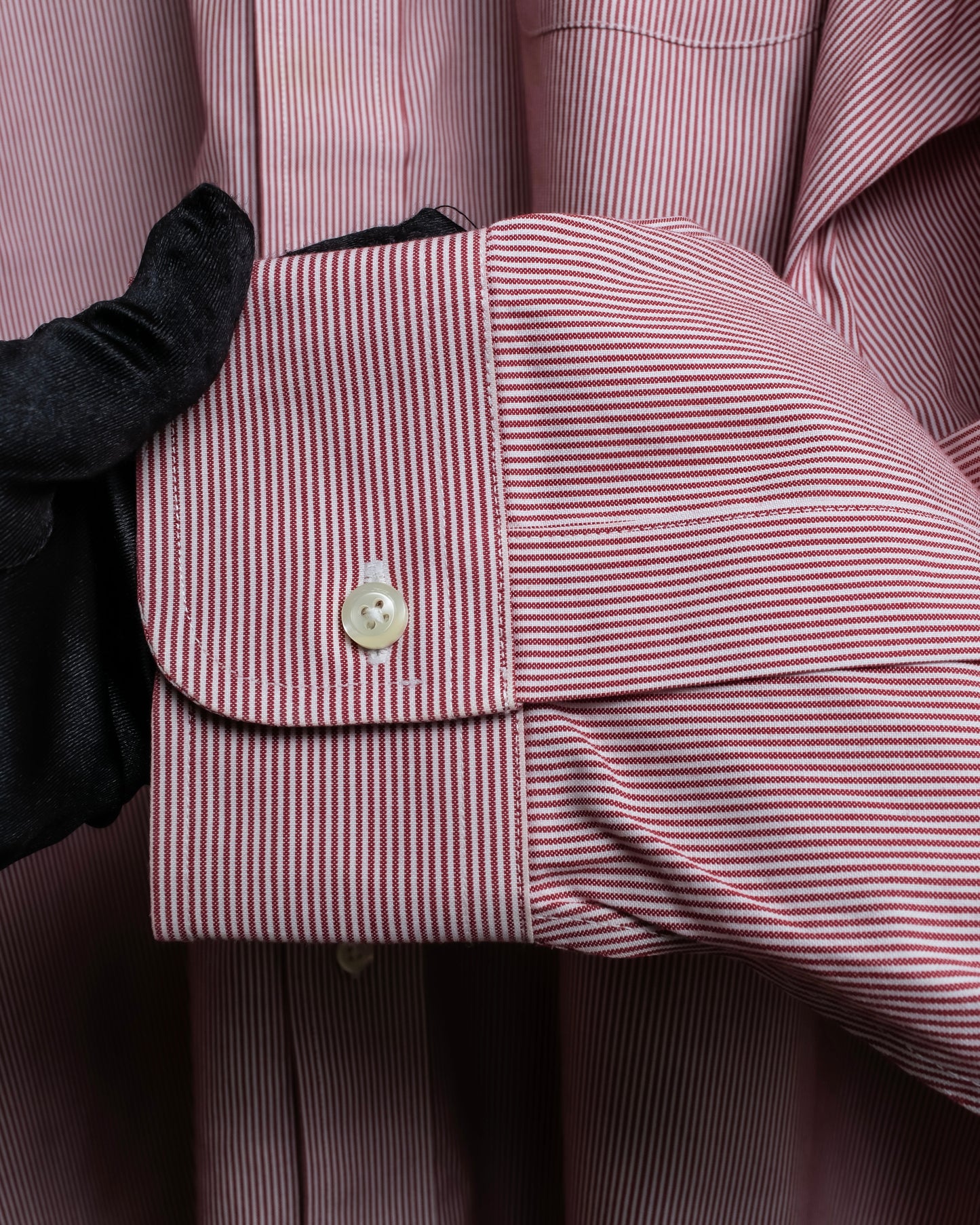 赤と白で構成された極細のストライプ柄が全体に施されており、視覚的にスタイリッシュな印象を演出して頂けて、美しい柄使いが生み出す繊細なラインは、クラシックでありつつも現代的なエッセンスも感じさせ、都会的な雰囲気を纏っております。