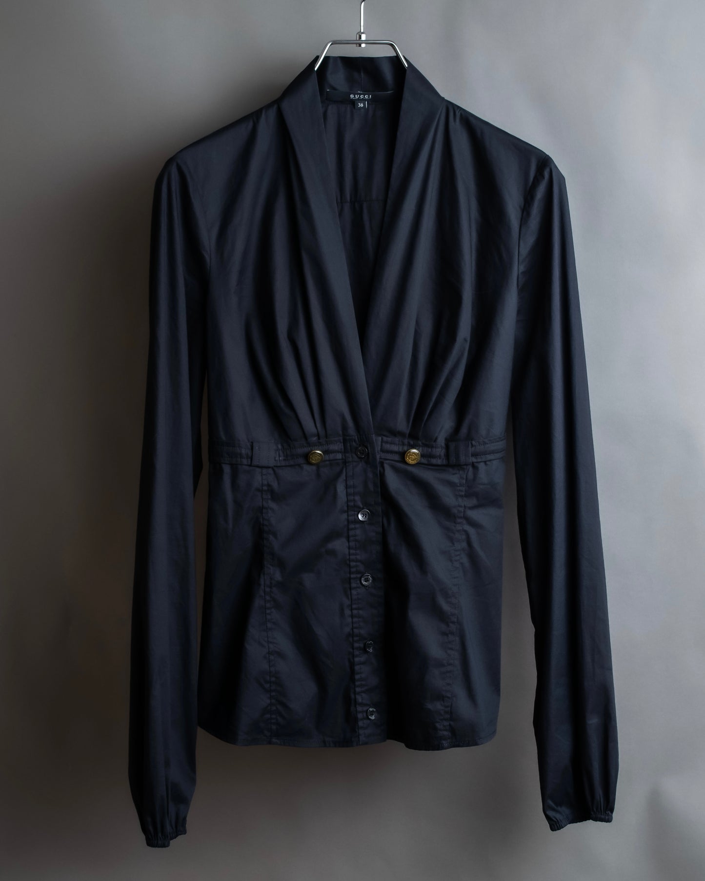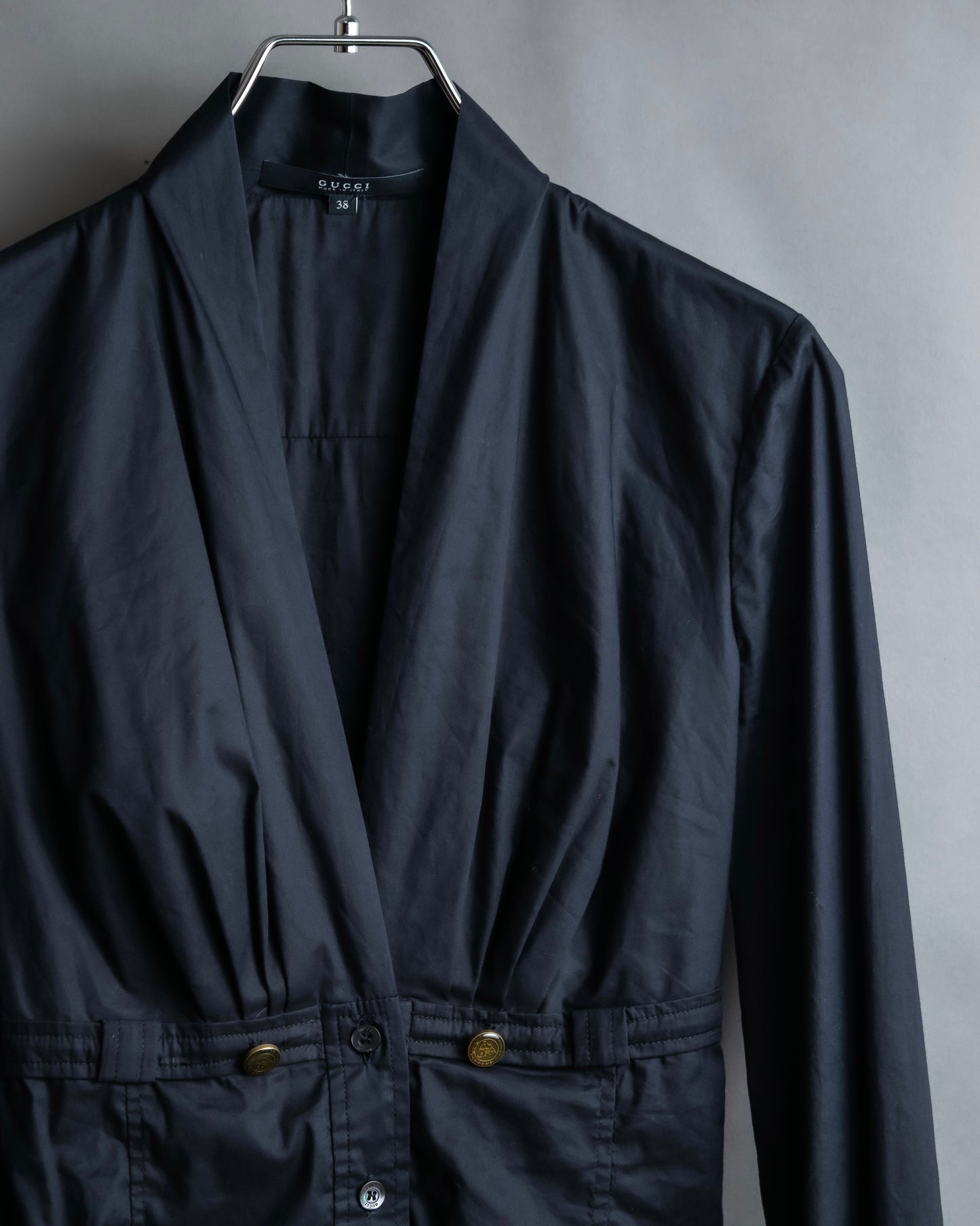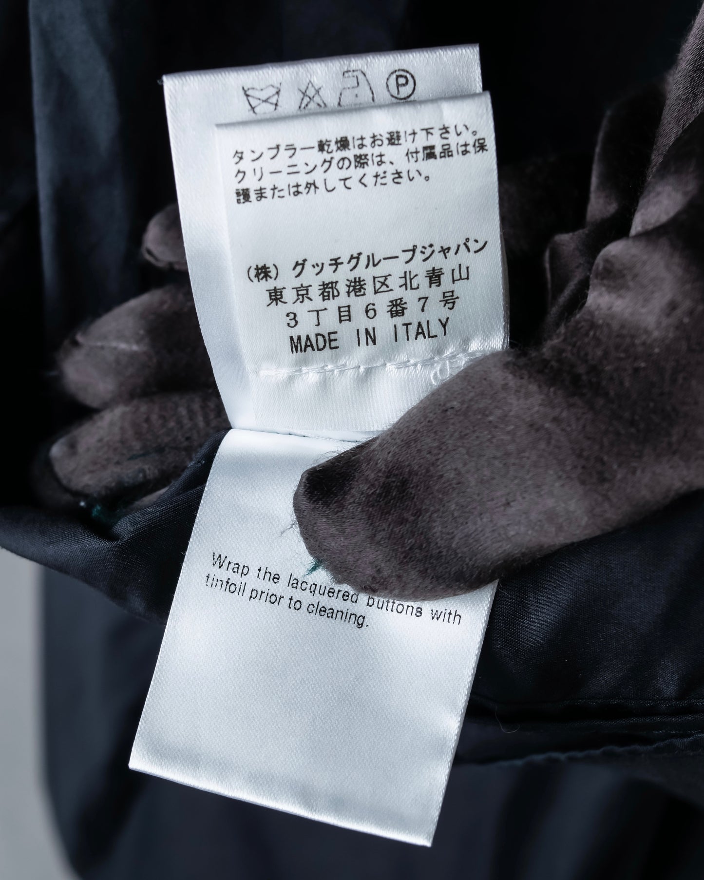 アクセントとなる金ボタンが、グッチらしいラグジュアリー感と遊び心を演出しているのが特徴でです。
