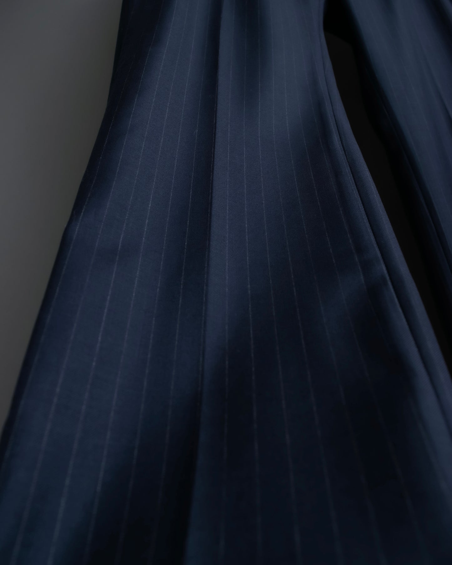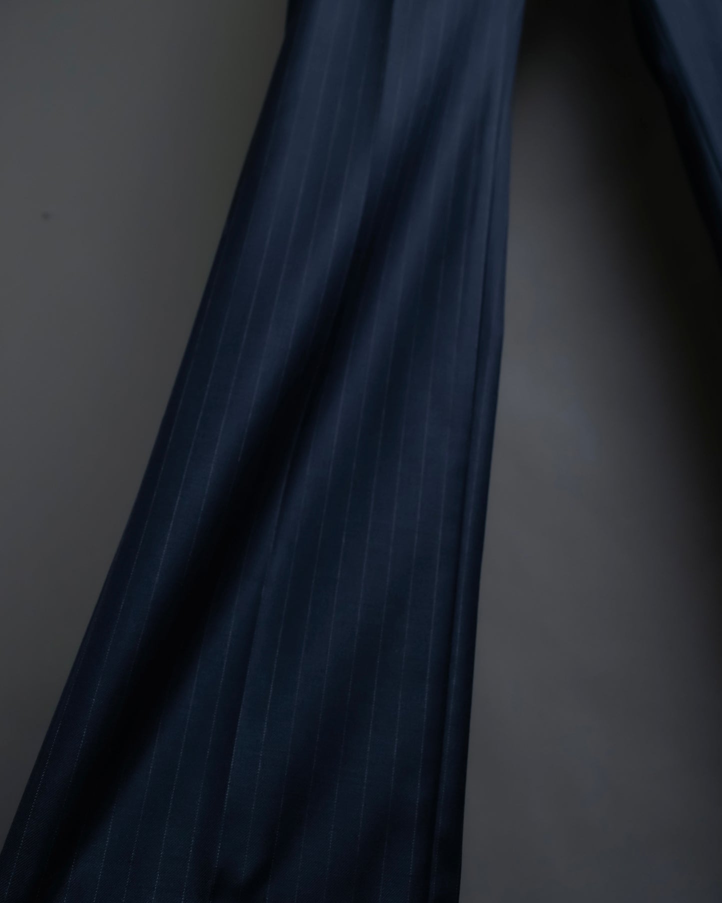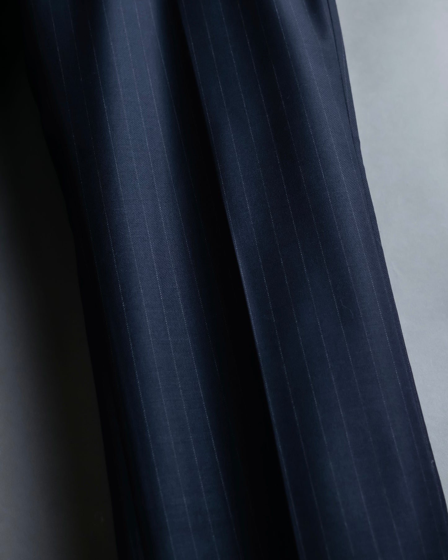 通常よりもマッドな色合いに加えて僅かな光沢感のあるストライプ生地をベースに、美しい細身なシルエットを誇るスラックスと落とし込んだデザイン。