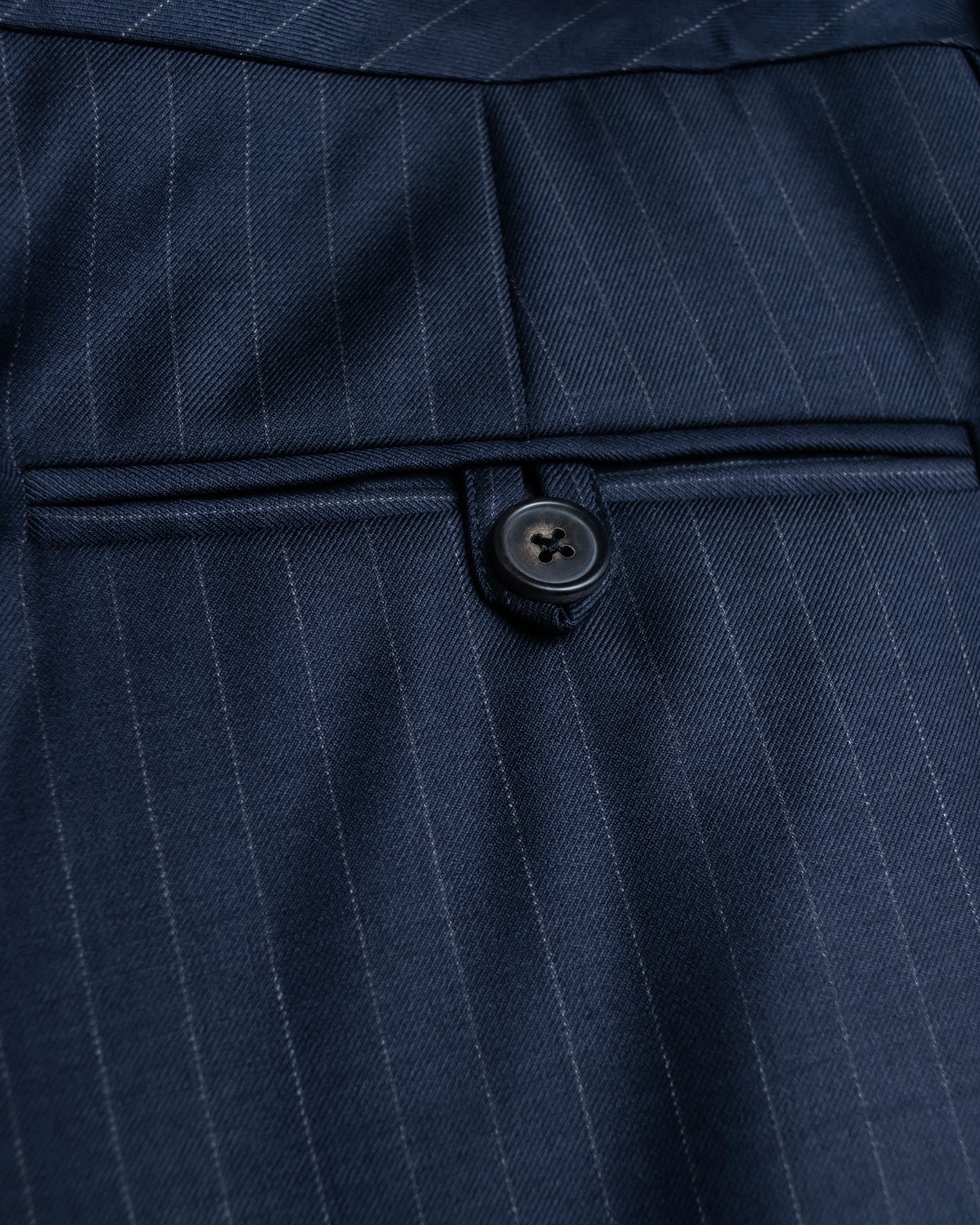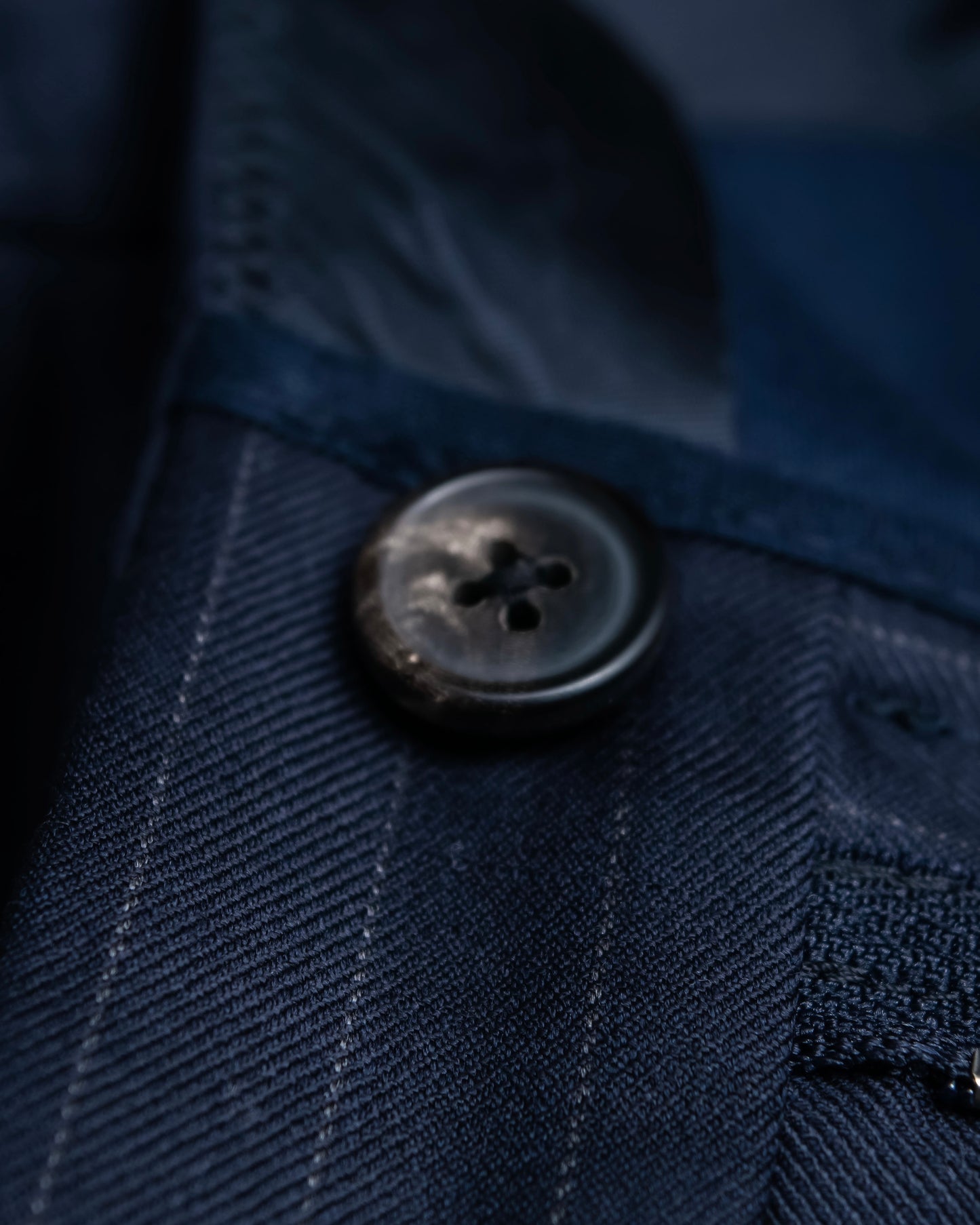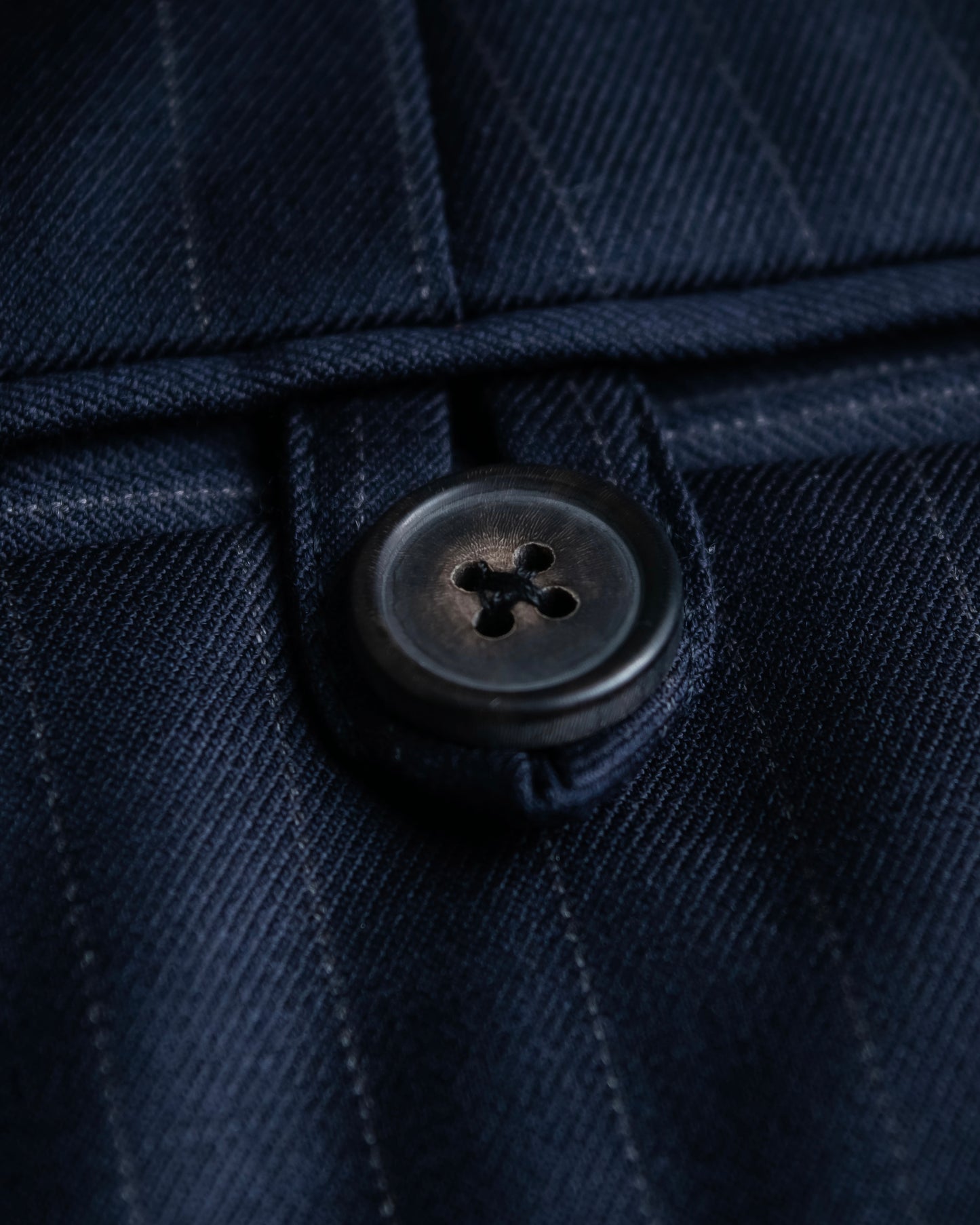 通常よりもマッドな色合いに加えて僅かな光沢感のあるストライプ生地をベースに、美しい細身なシルエットを誇るスラックスと落とし込んだデザイン。