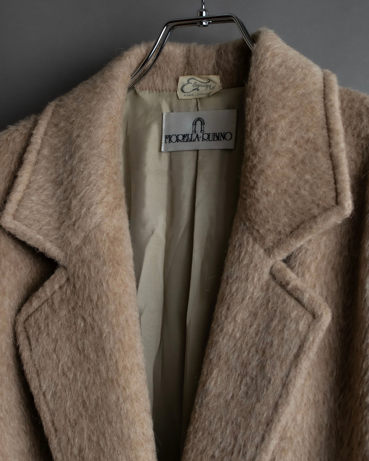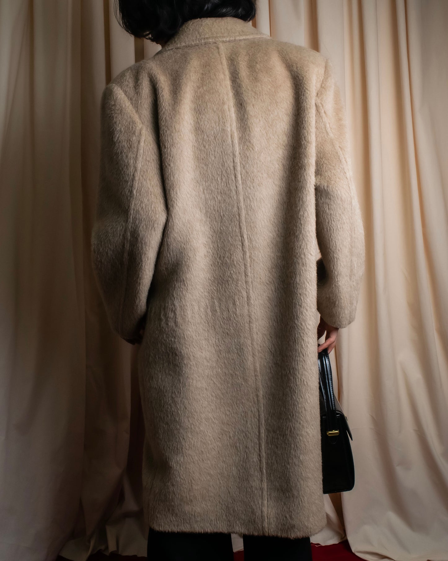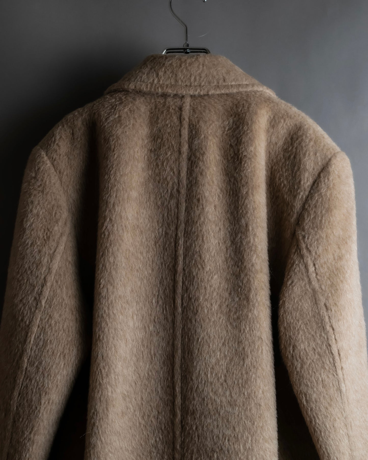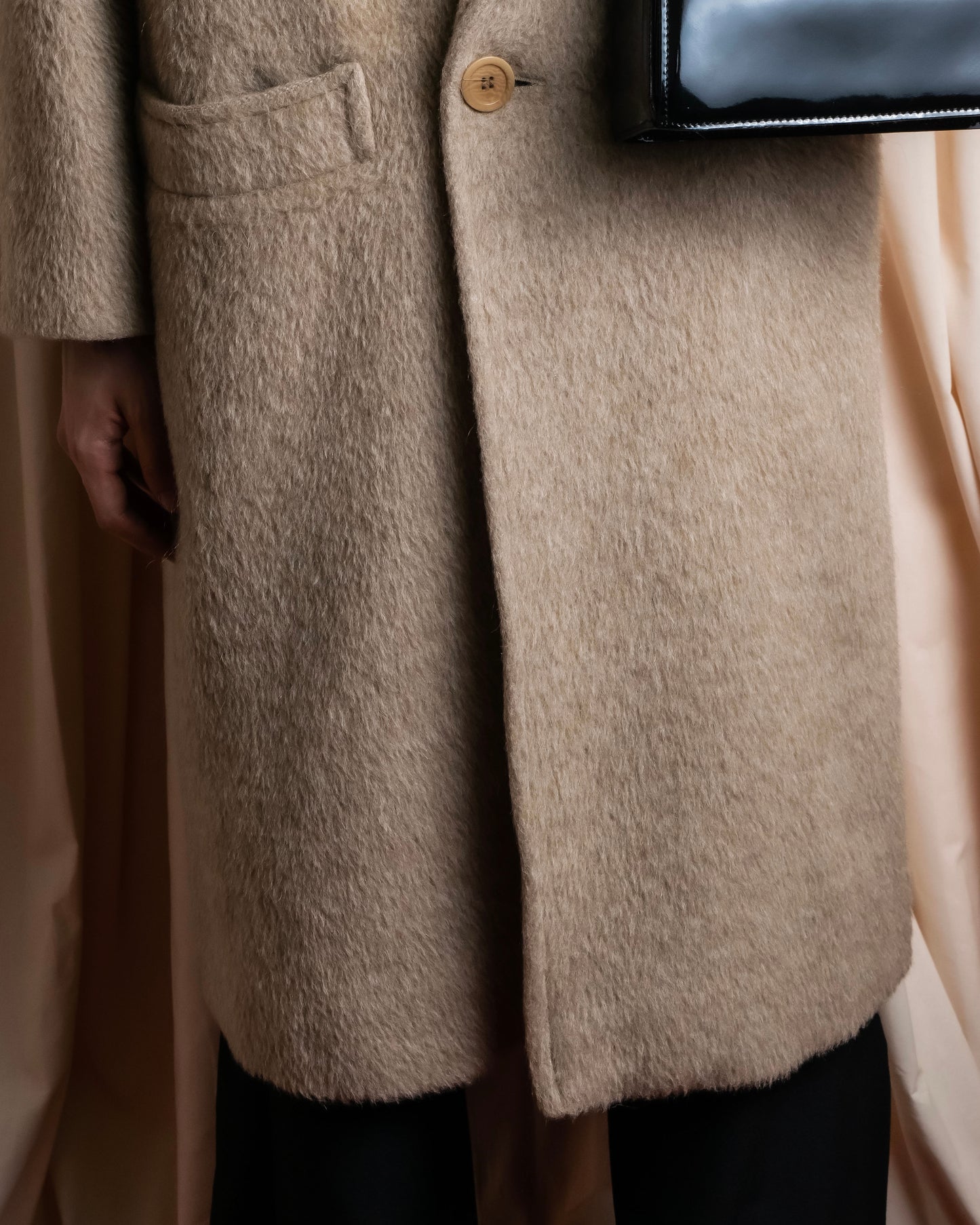 ウール素材を軸に、高級素材であるアルパカやモヘヤを混紡した生地を使用している為、美しい艶を帯びた起毛感と、高い防寒性や蒸れにくい性質を持ち合わせたコートに最適解な素材感となっております。
