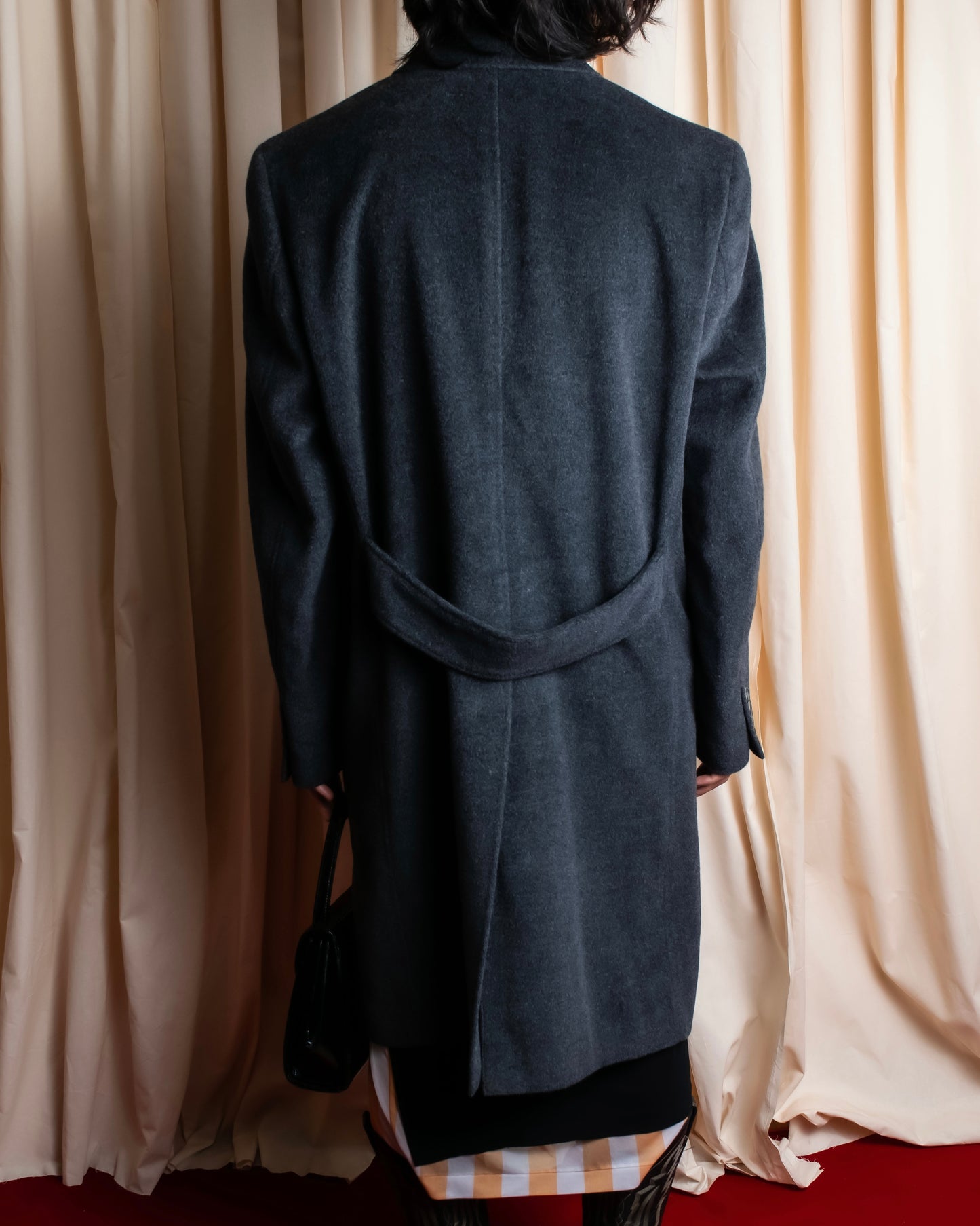 背面にはウエストベルトを模したディテールとハイスリットによって、着用の際にウエストラインに綺麗なくびれを描いている様子をお楽しみ頂くことができます。