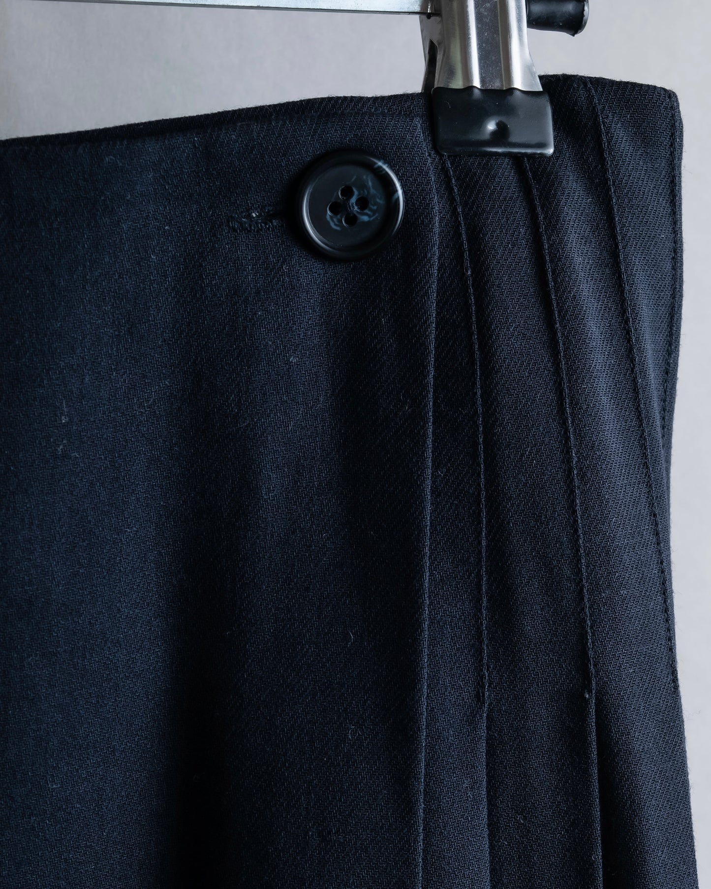 軽やかさを兼ね備えたミドル丈の設定に加え、ボタンで留める巻きスカート仕様となっているので、ジェンダーレスにお使い頂きやすく、レイヤードアイテムとしても落とし込める逸品となっております。