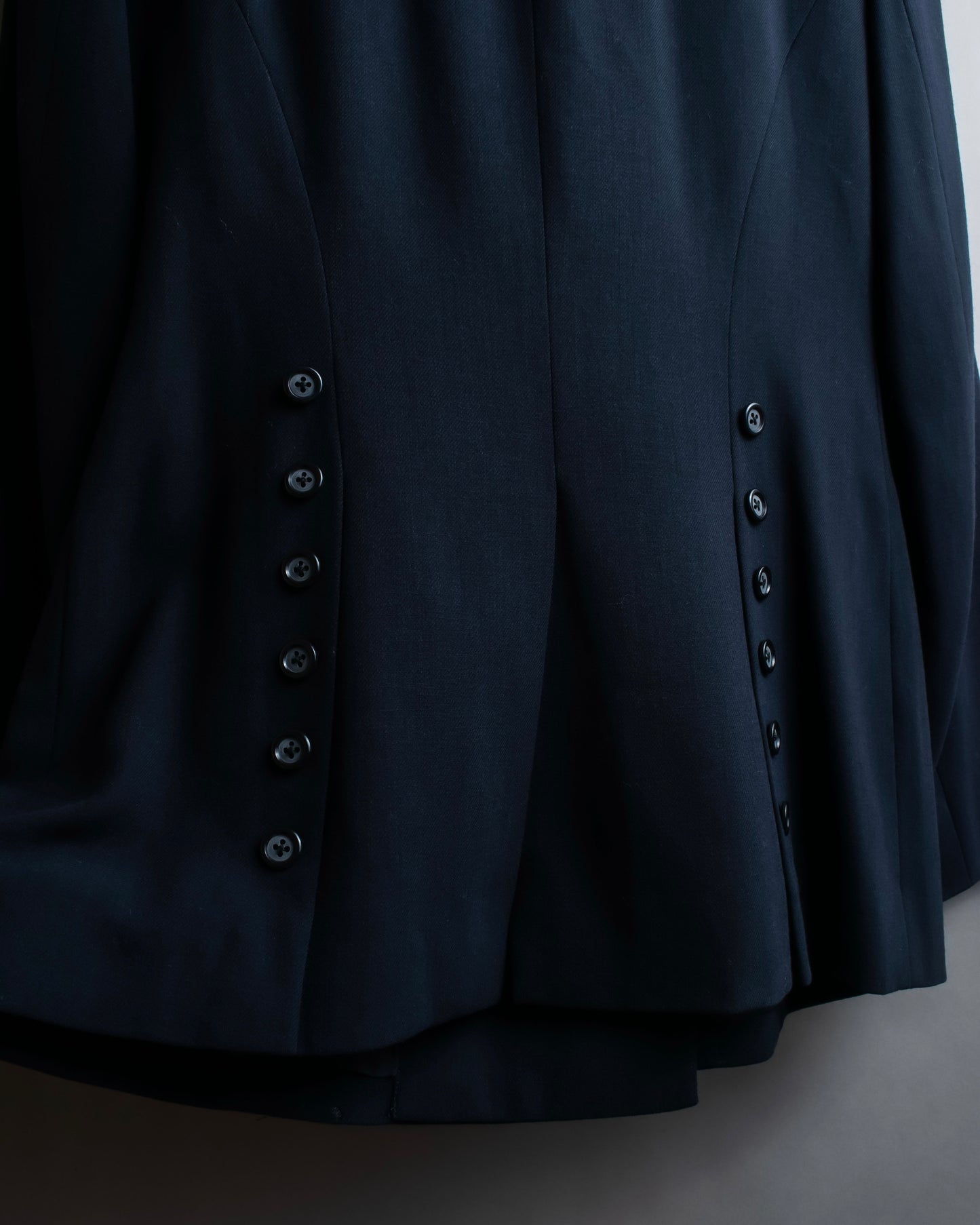 エレガントな印象をプラスしつつ、ウエストのダーツ処理や、センターベンツなど、伝統的なテーラリングが随所に施されているので、コンセプチュアルな風合いを感じさせます。