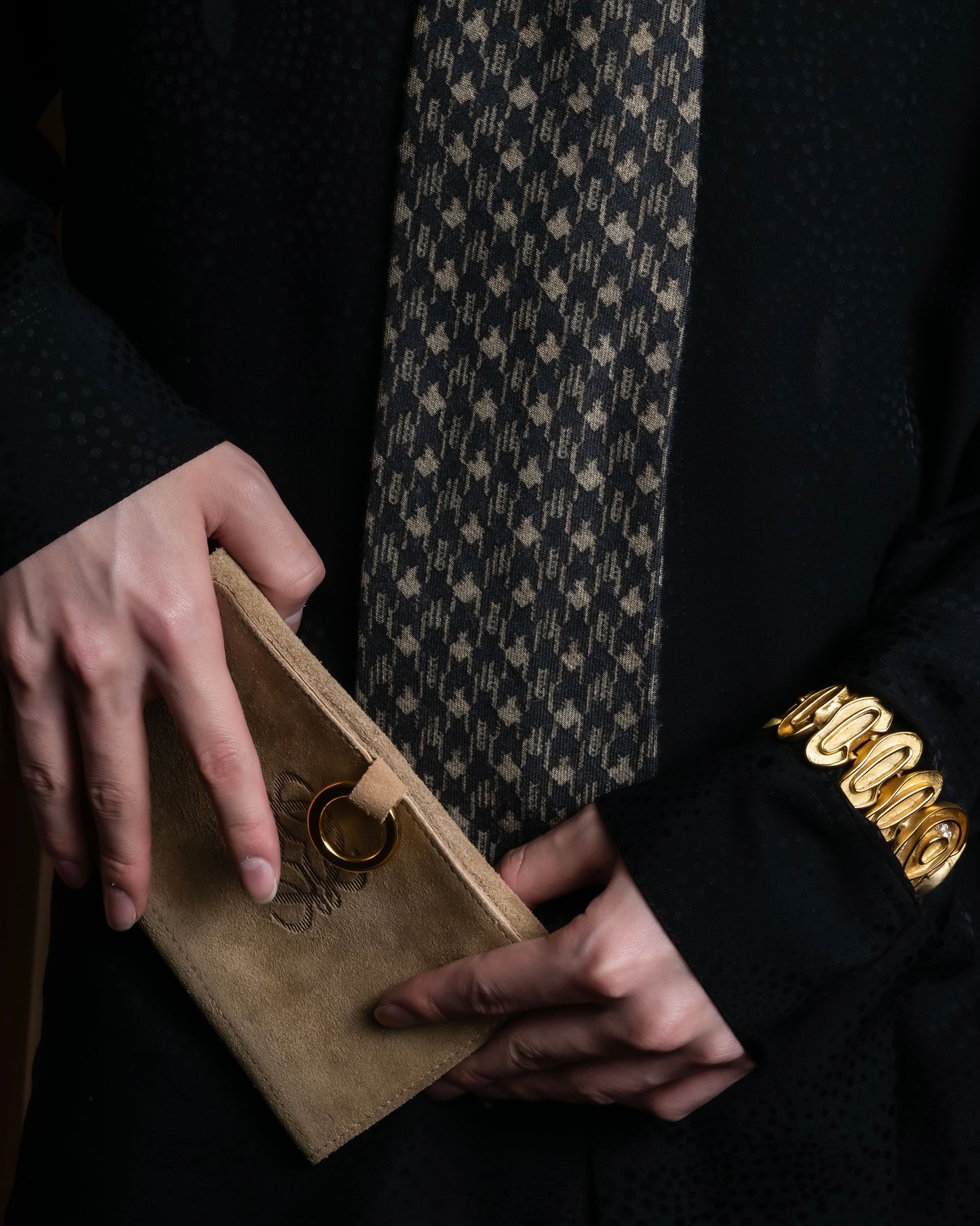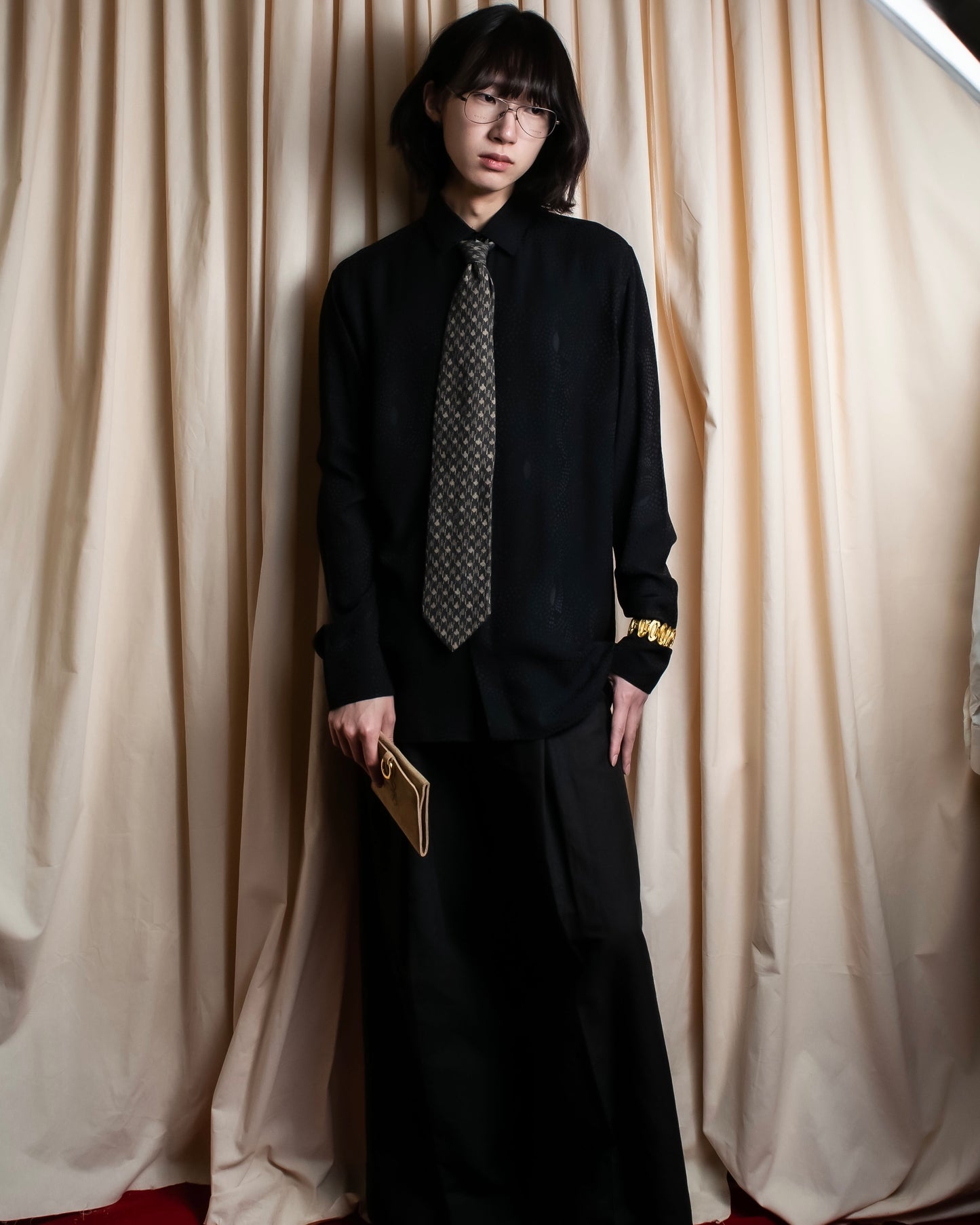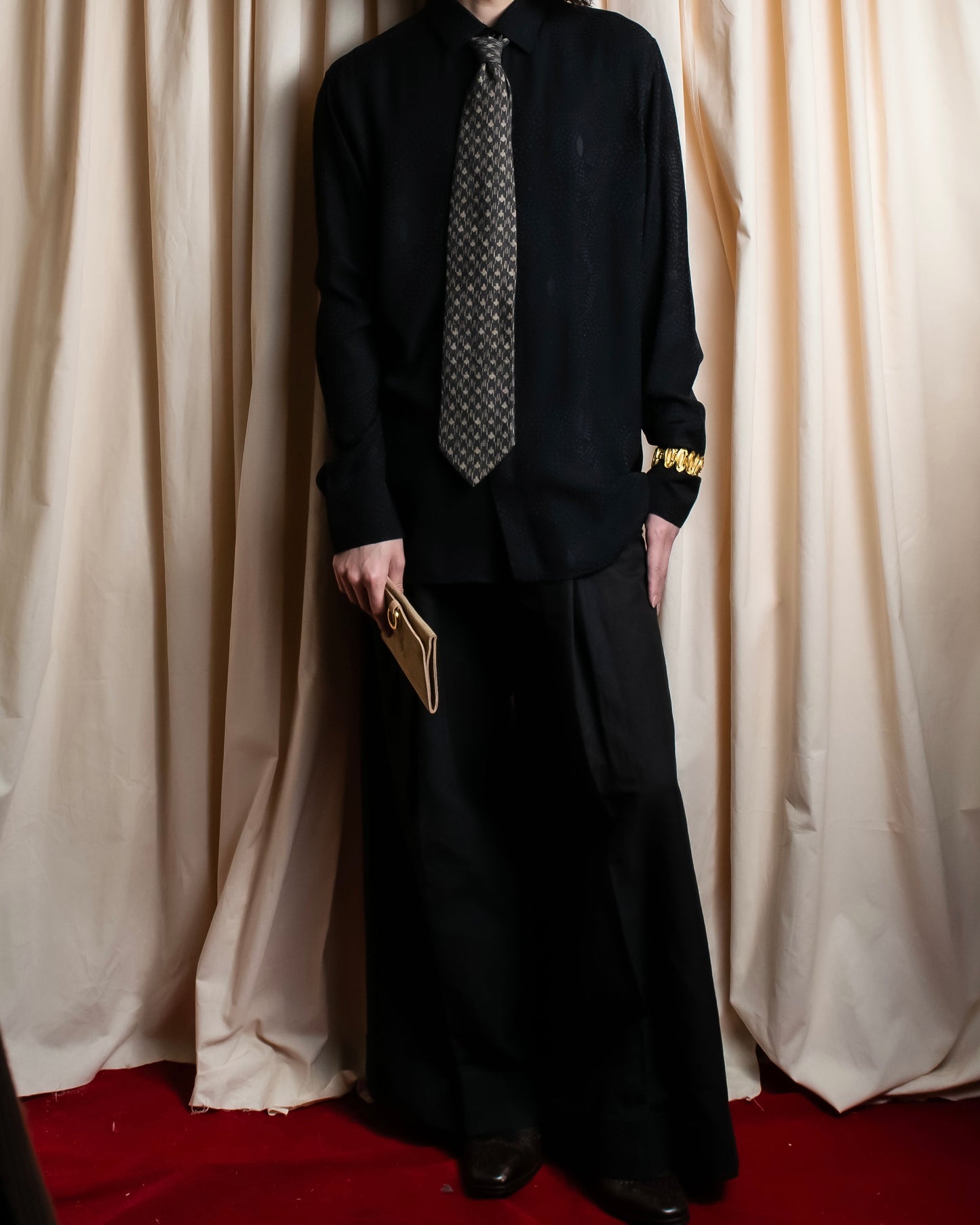 スタイリングとしては、ミディアムグレーのウールジャケットや、ダークトーンのシャツに合わせて、クラシックとモードが交差するようなニュアンスのあるスタイルに、仕上げることをおすすめしております。
