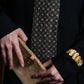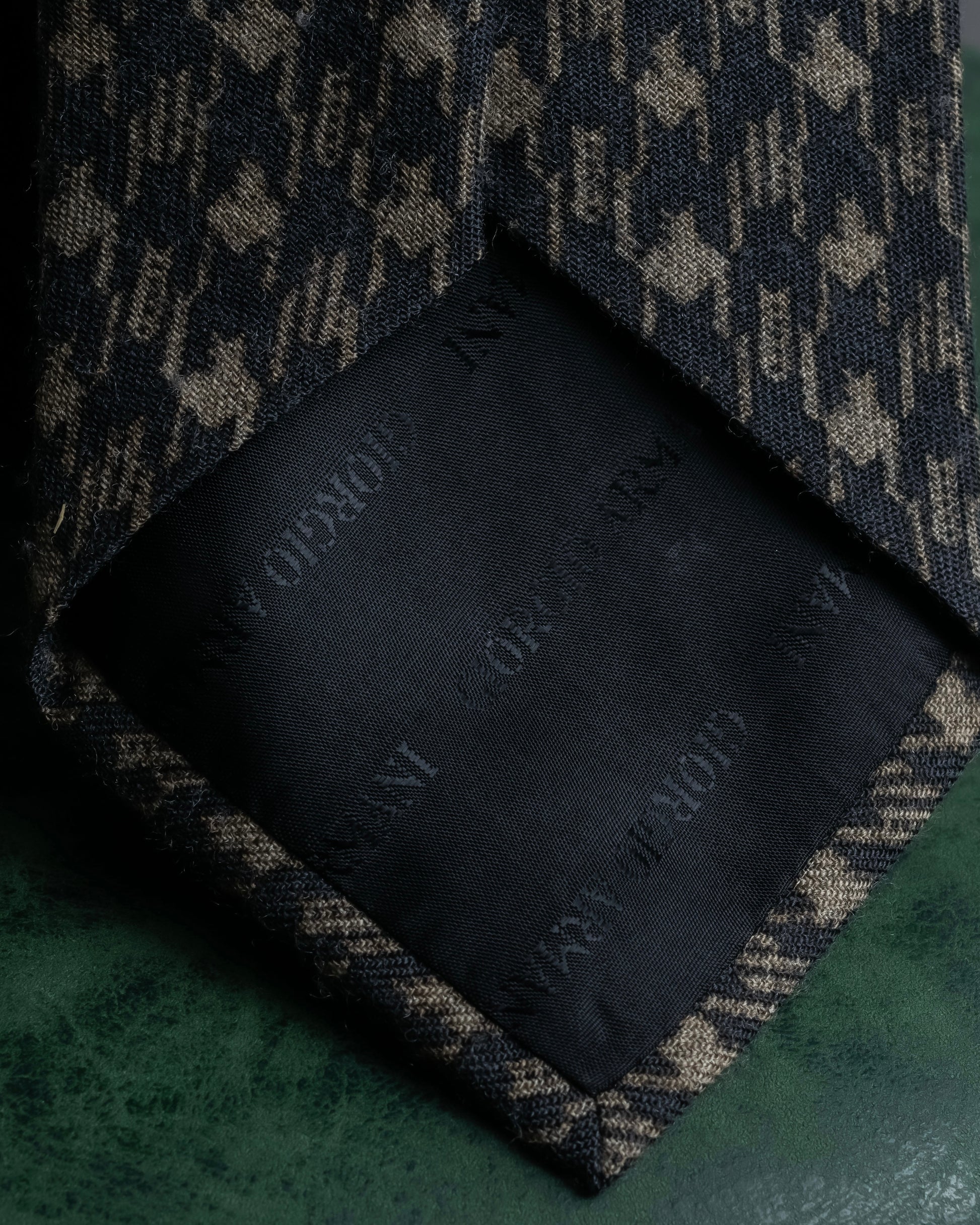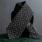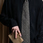 ウール混ならではの柔らかな質感と、程よい厚みを持つ織り生地が、タイドアップに奥行きをもたらします。柄はあくまで控えめに、しかし視線を引き寄せる絶妙なコントラストで織り出されており、モダンにもトラディショナルにも溶け込む汎用性を備えています。ヴィンテージながら現代的なエッセンスが漂う、静かな存在感が魅力です。