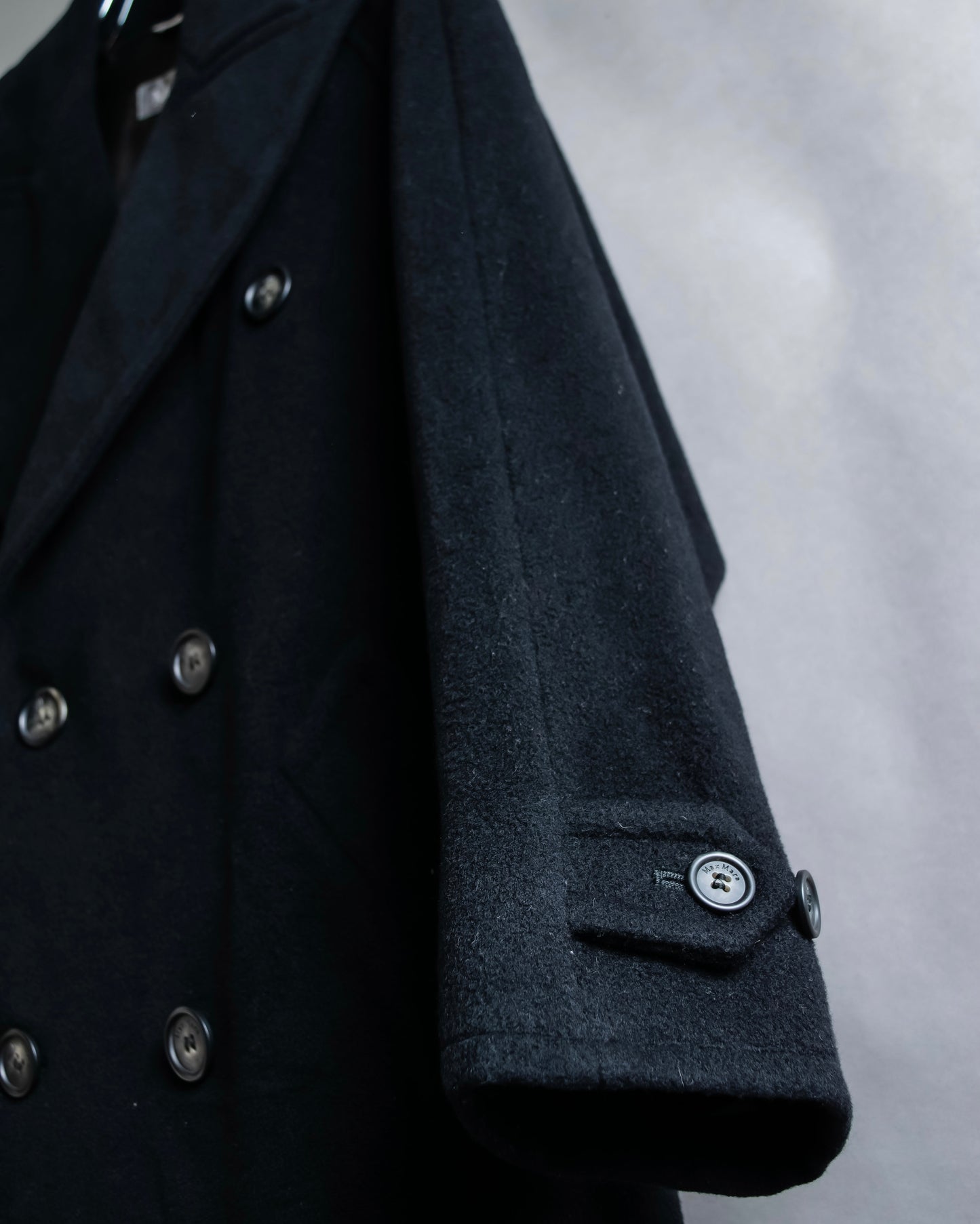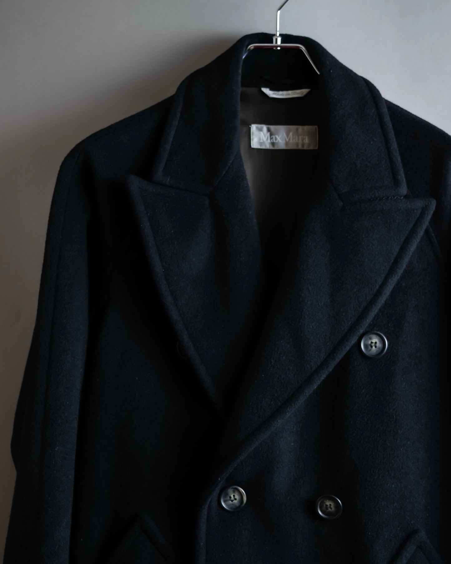 クラシカルなダブルブレストの前立てが、トラディショナルな雰囲気を醸し出しつつも、ボタンが上に設置されている為、どこかモダンで上品な佇まいを演出しており、マックスマーラが誇る仕立ての技術を感じさせる、時代を超えて愛されるエレガントなスタイルを体現しております。