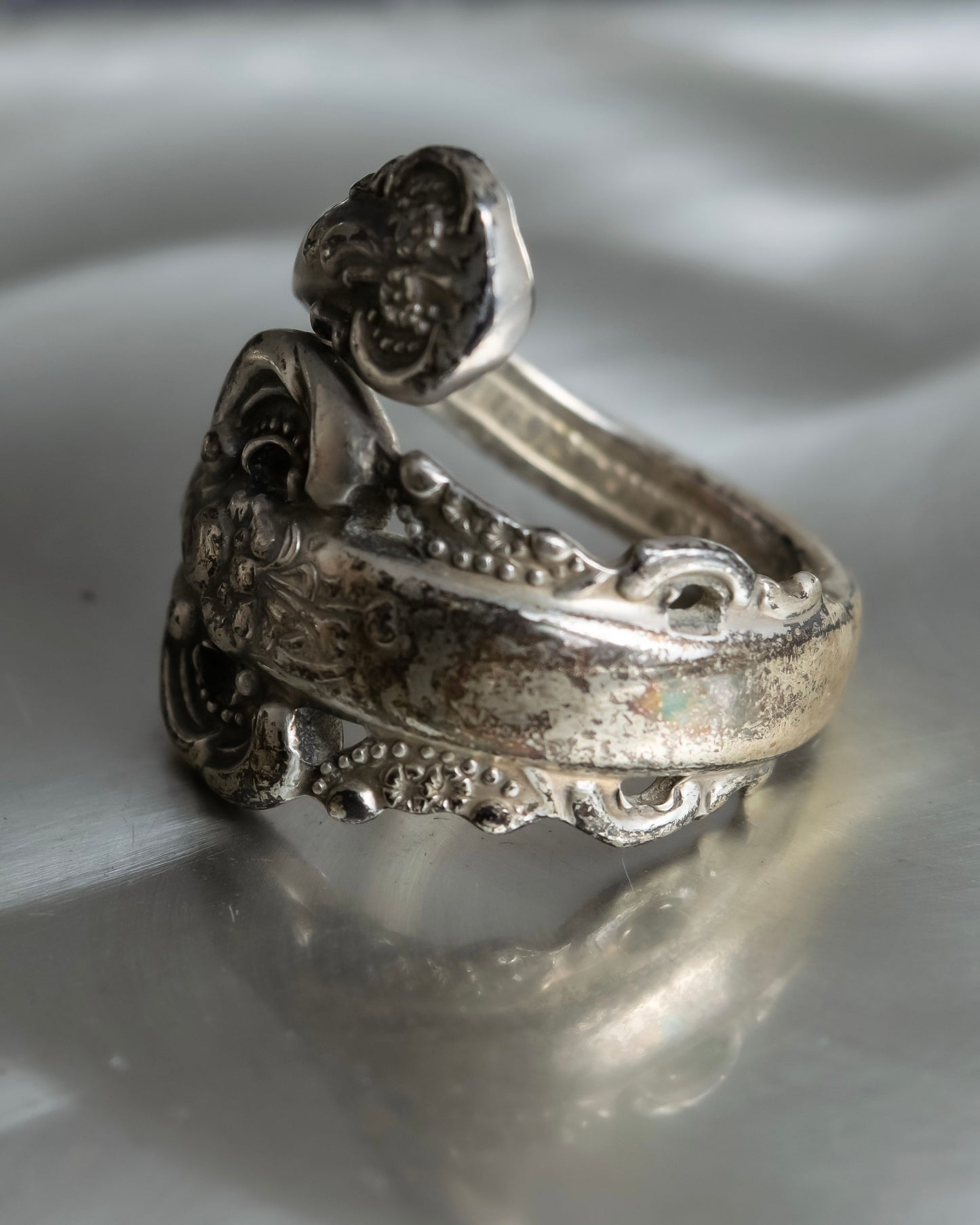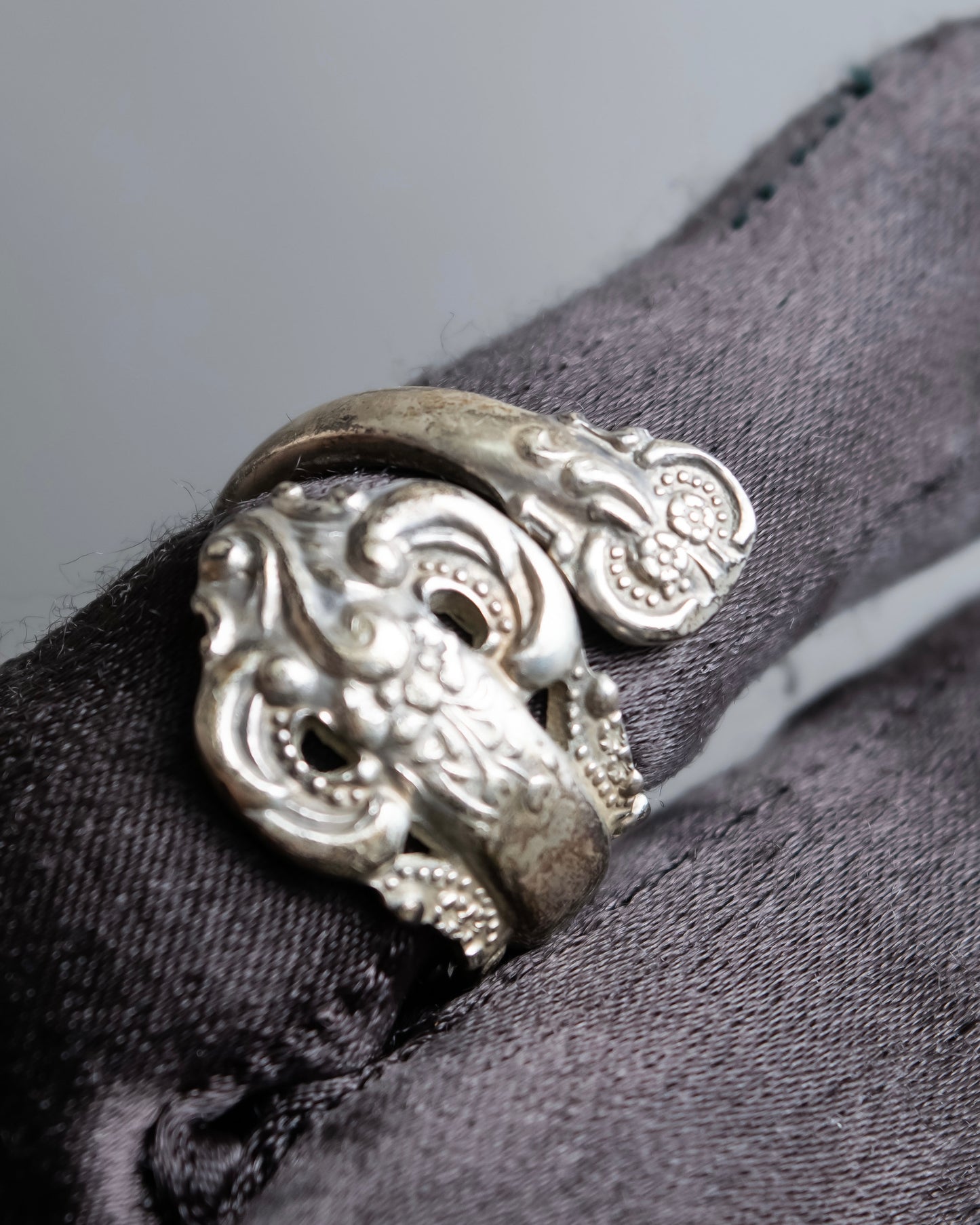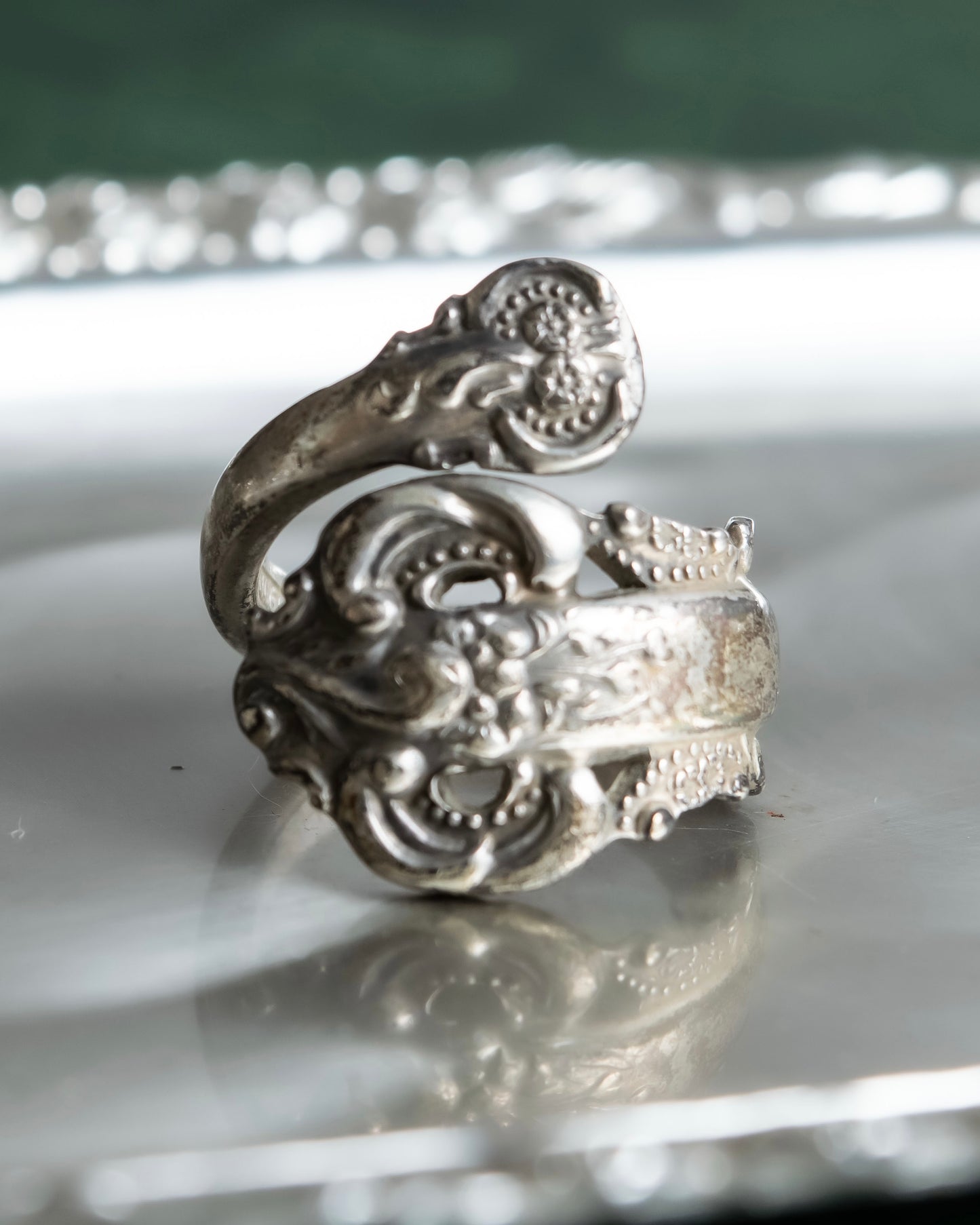 アンティーク調の刻印が施されたスプーンリングは、ヴィンテージ感が漂う魅力的なジュエリーとして、スプーンのハンドル部分を使用して作られ、独特の美しさを持つデザイン性を帯びております。