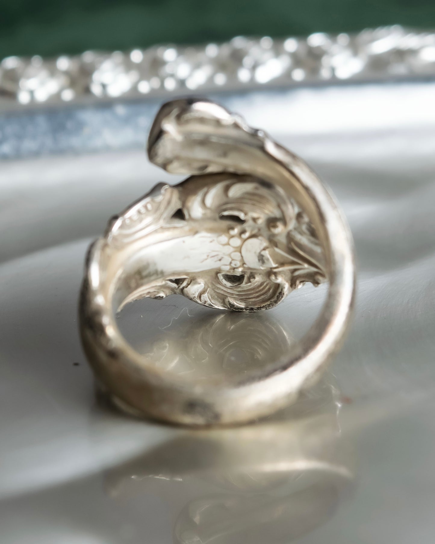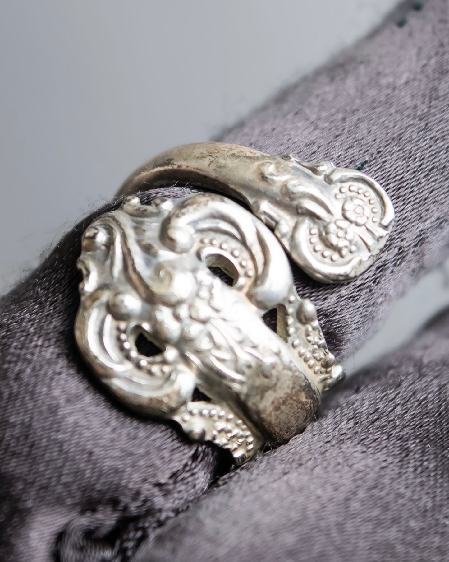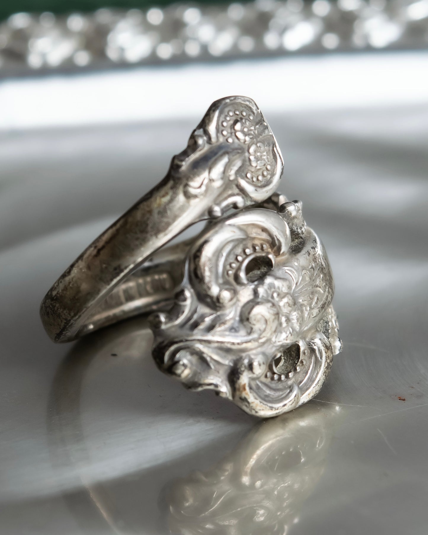 アンティーク調の刻印が施されたスプーンリングは、ヴィンテージ感が漂う魅力的なジュエリーとして、スプーンのハンドル部分を使用して作られ、独特の美しさを持つデザイン性を帯びております。