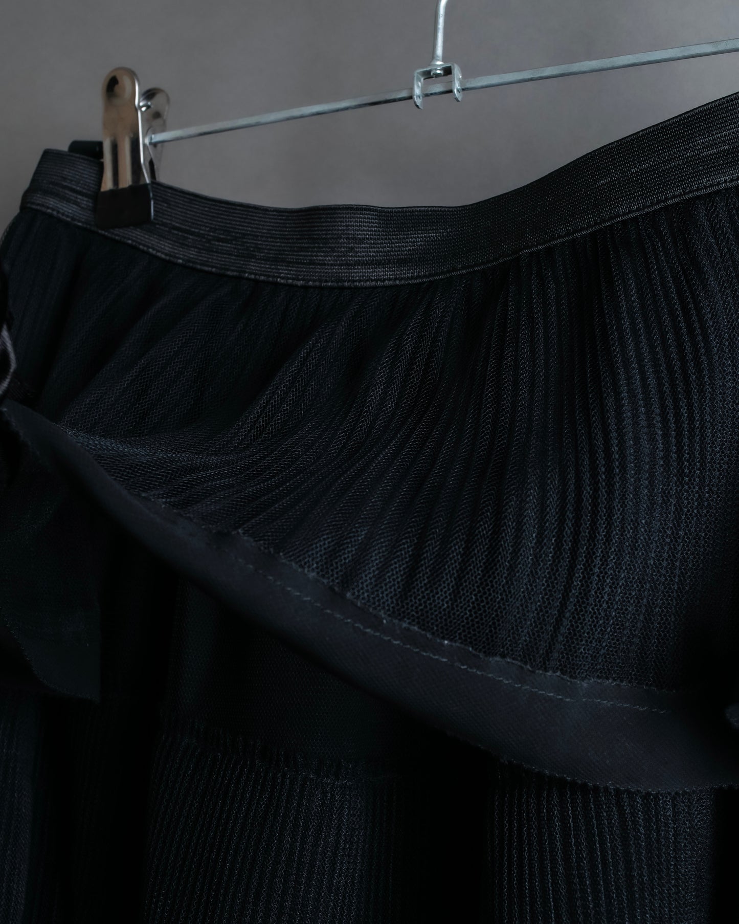 フレアシルエットによる動きのあるデザインに加え、ミドル丈の軽やかさが全体にバランスを持たせ、ジェンダーレスに着用できる点が魅力で、透け感と重なりのディテールが絶妙に調和し、唯一無二性に昇華されている逸品となっております。