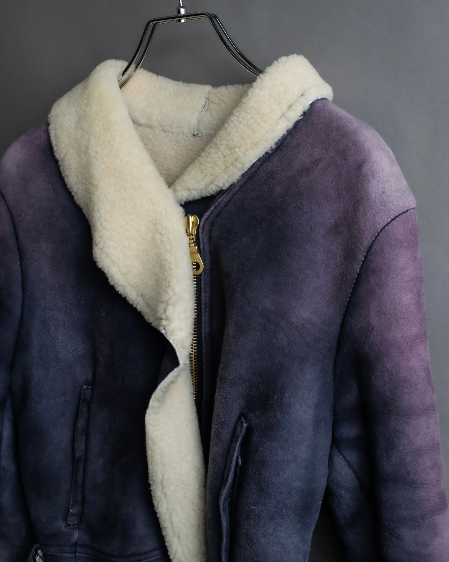 耐久性の高いスエード素材に、紫の美しいグラデーションが施され、独特の風合いが際立っている点に加え、ベージュのムートンが差し色として落とし込まれており、防寒性を高めるだけでなく、全体のカラーバランスを引き締めております。