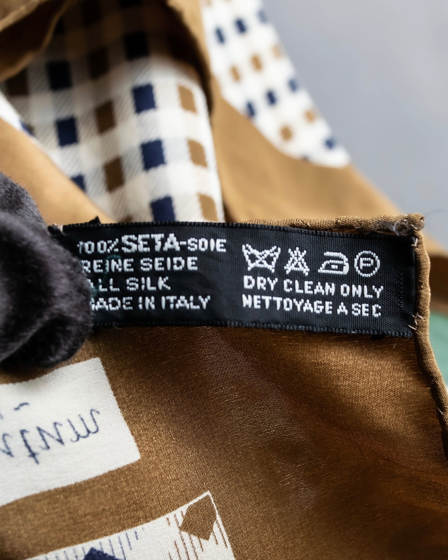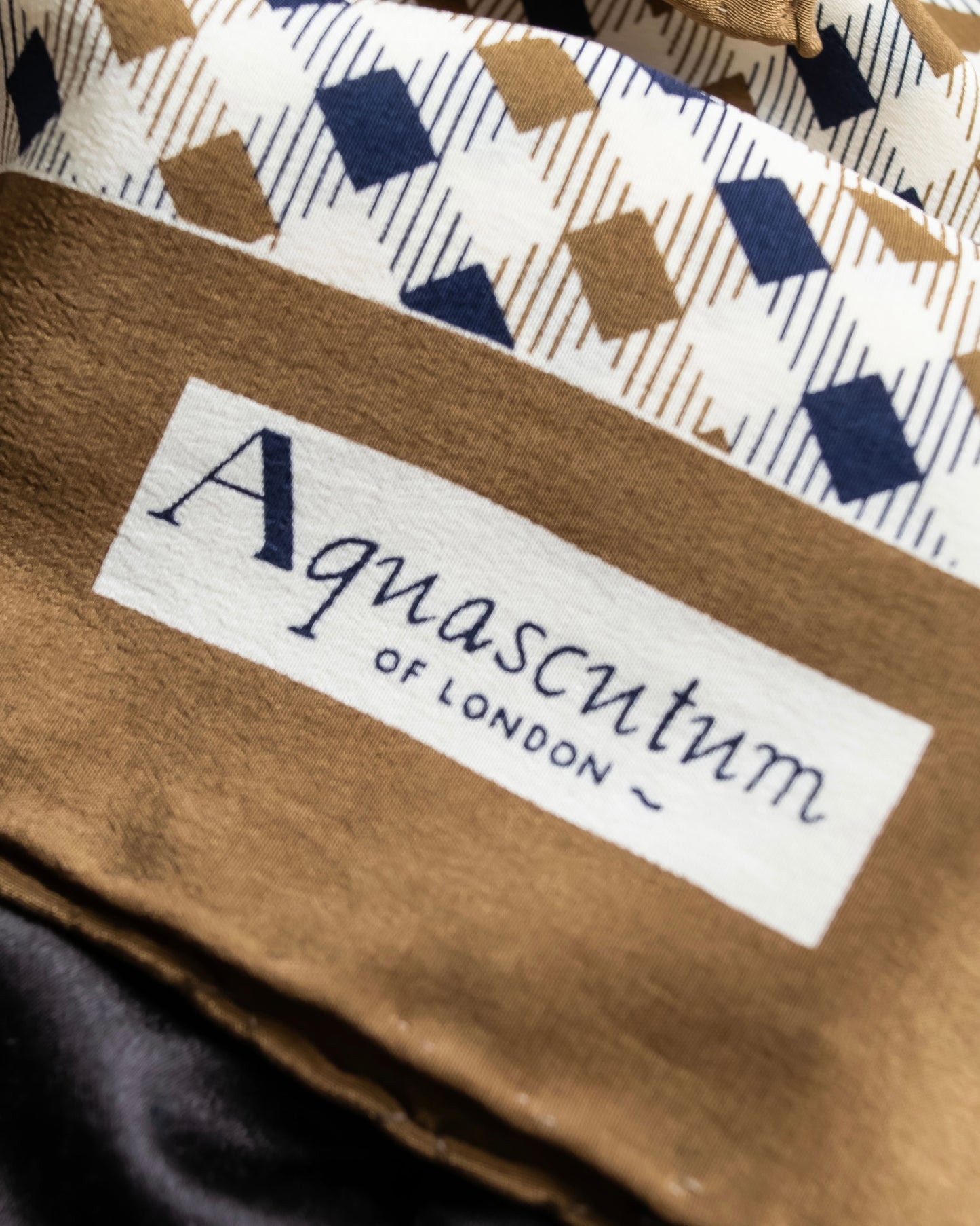 スタイリングとしては、トレンチコートを羽織り、細身のデニムを合わせたアクアスキュータムらしいトラディショナルな着こなしに、こちらの逸品が持つクラシカルな柄使いと落ち着いた色彩表現を落とし込んで頂き、よりアイコニックな印象に仕上げる秋冬のスタイリングを推奨しております。