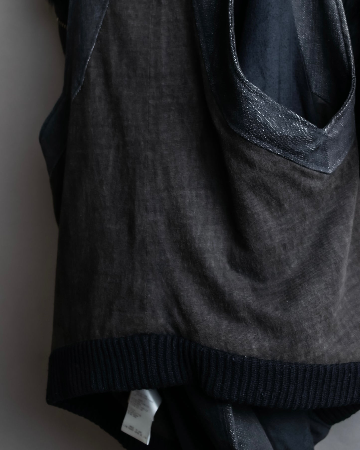 フロントから後ろにかけてのデニム生地の切り替えデザインがアクセントとして落とし込まれており、異なる素材感のコントラストによる立体的な美しさが、ヘルムートラングならではの哲学とパターンメイキング技術を感じさせます。