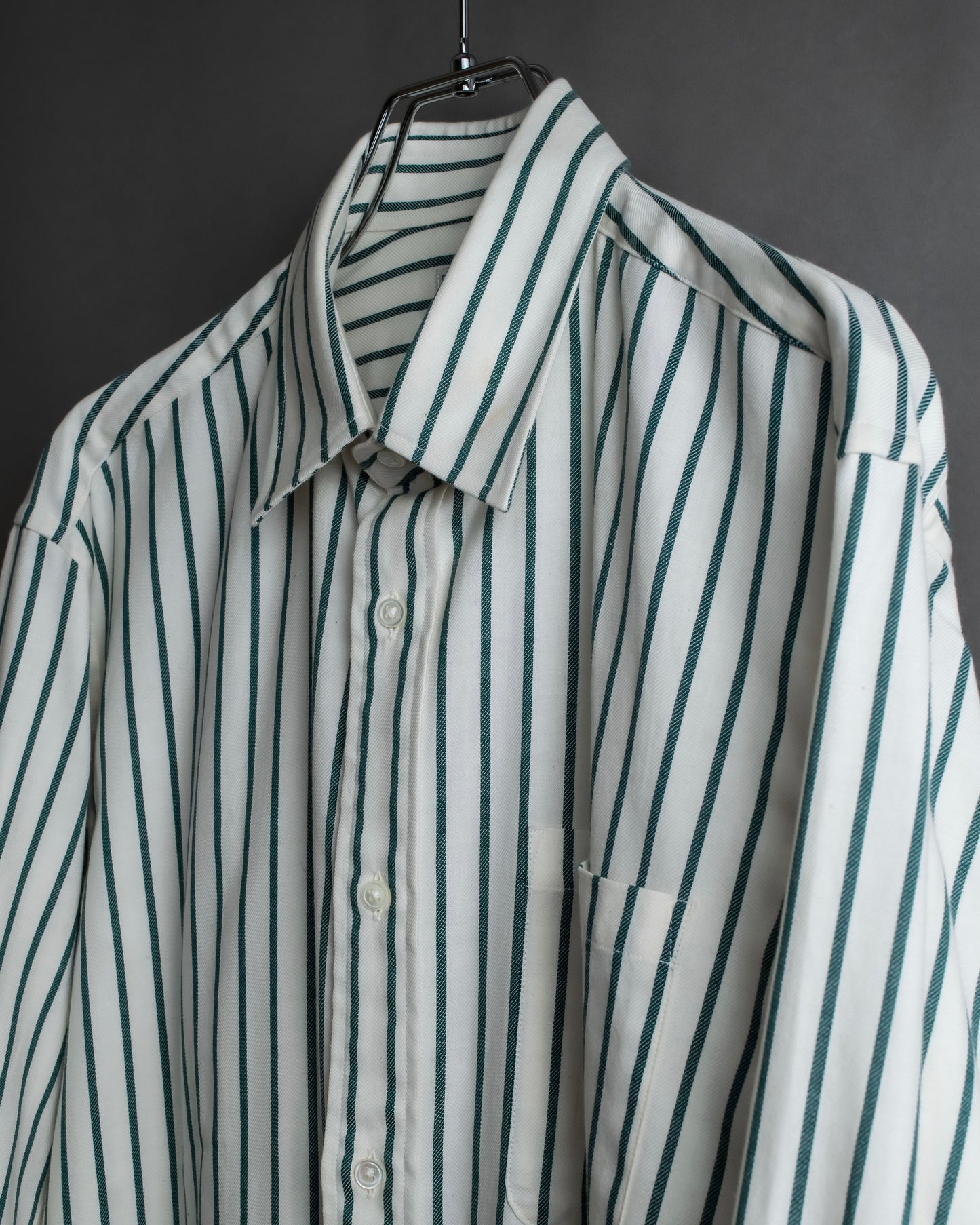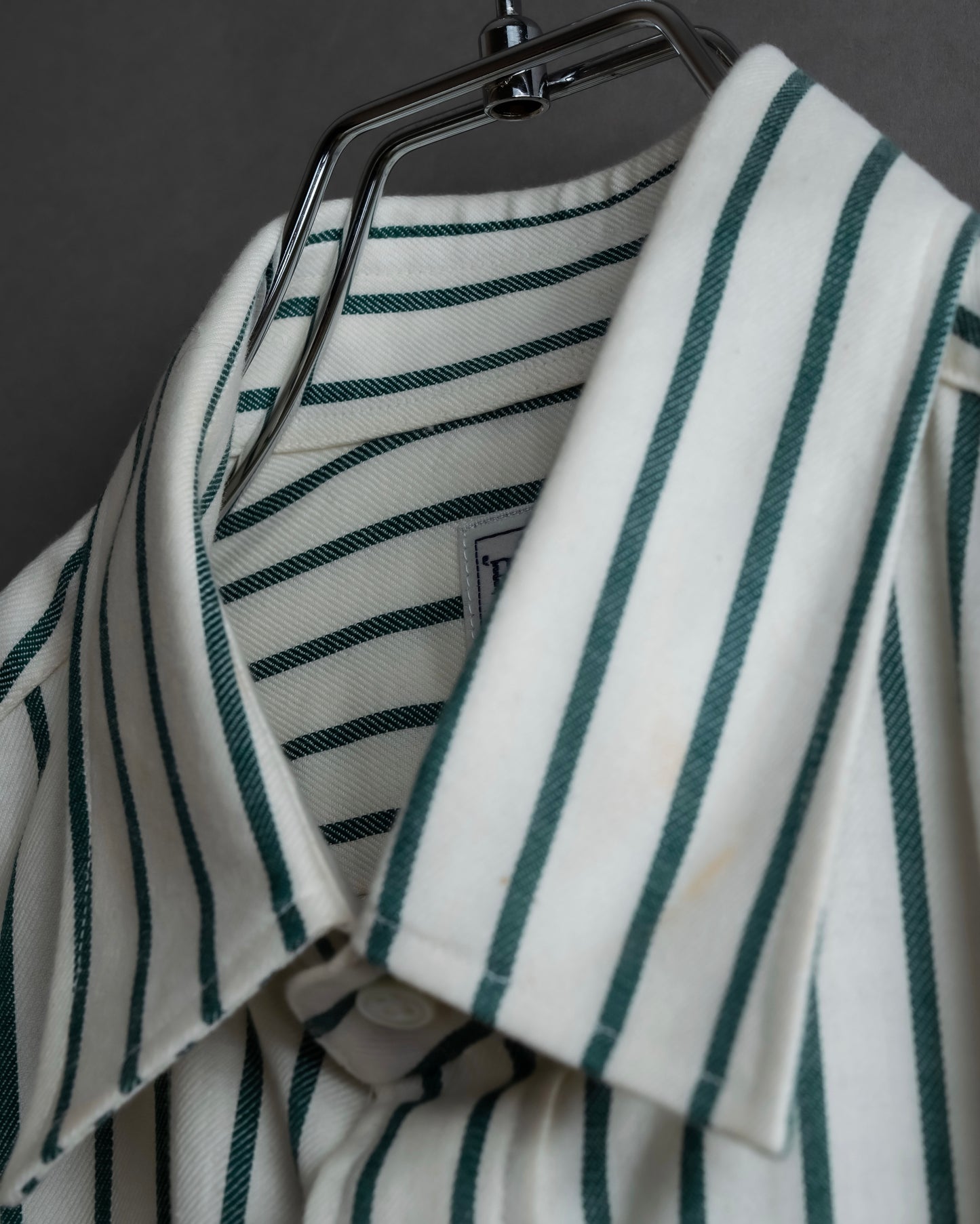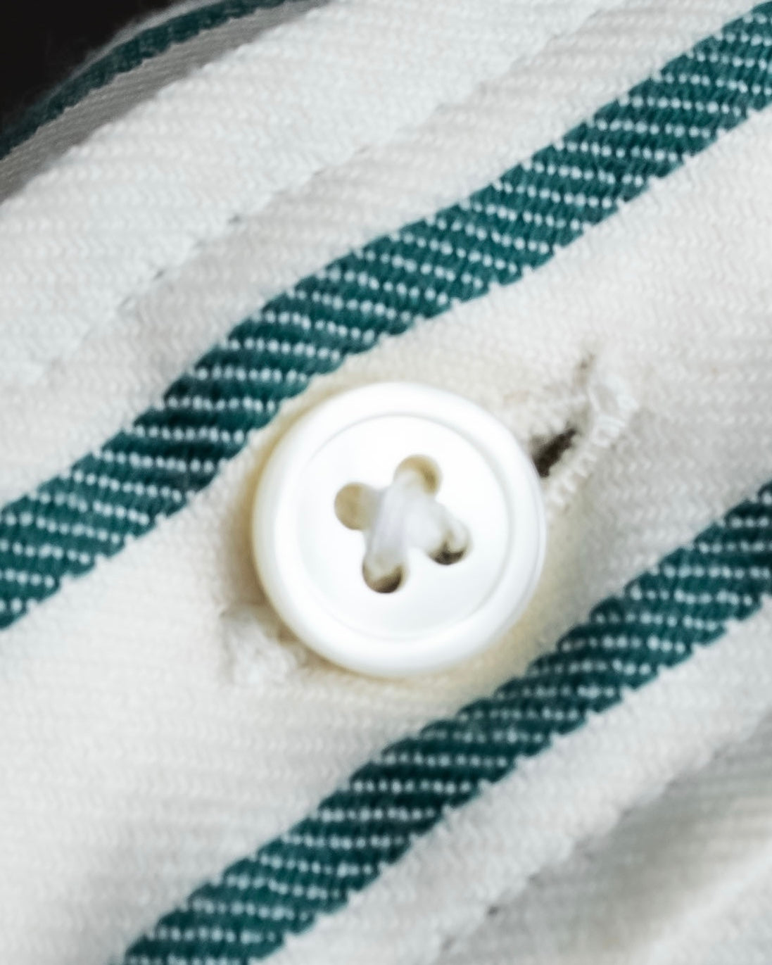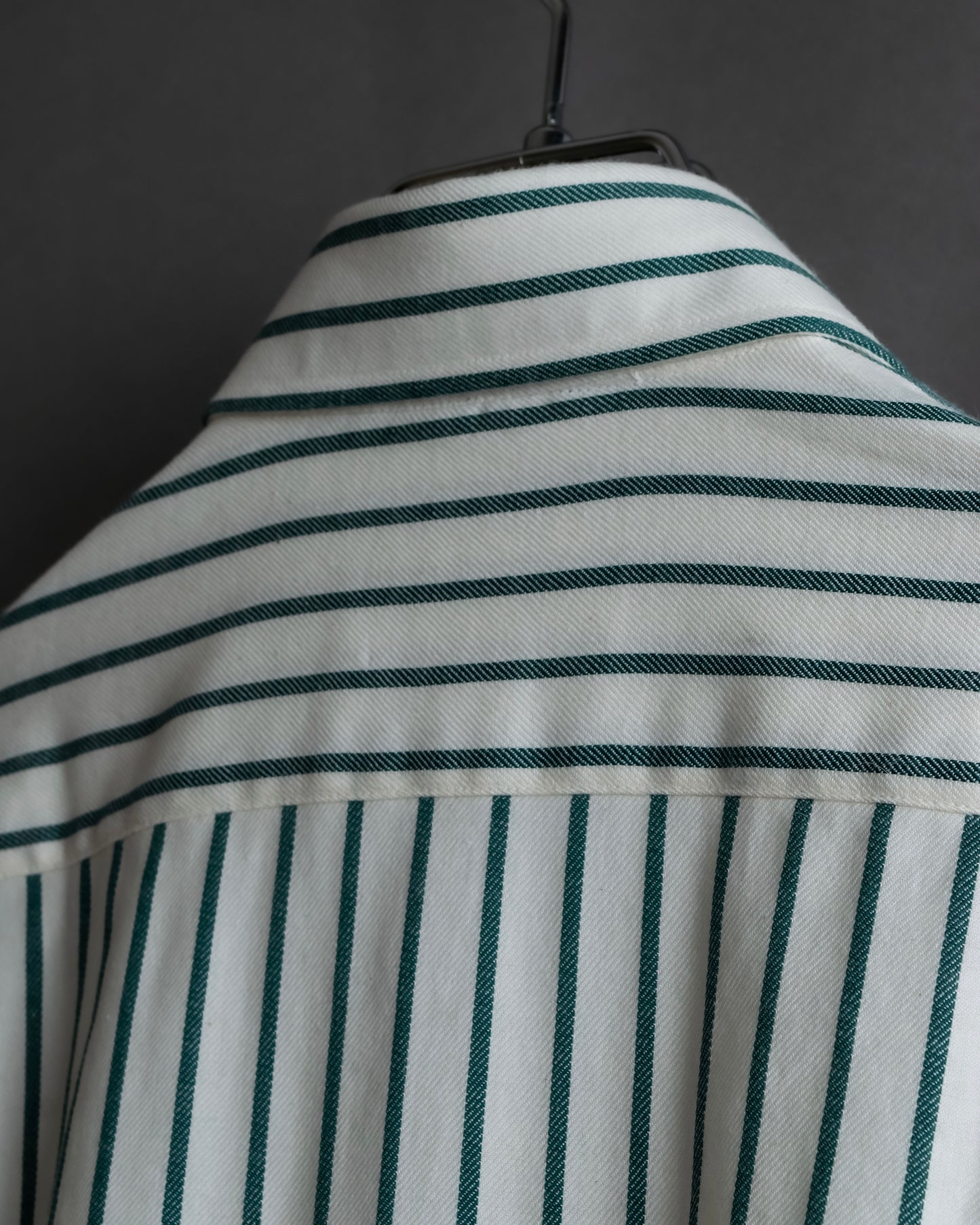 スタイリングとしては、細身でフルレングスのデニムパンツを合わせ、ダービーシューズで締めて頂く様な、こちらの逸品が持つストライプ柄のスタイリッュな特性を活かし、縦のラインを強調したスタイリングを推奨しております。