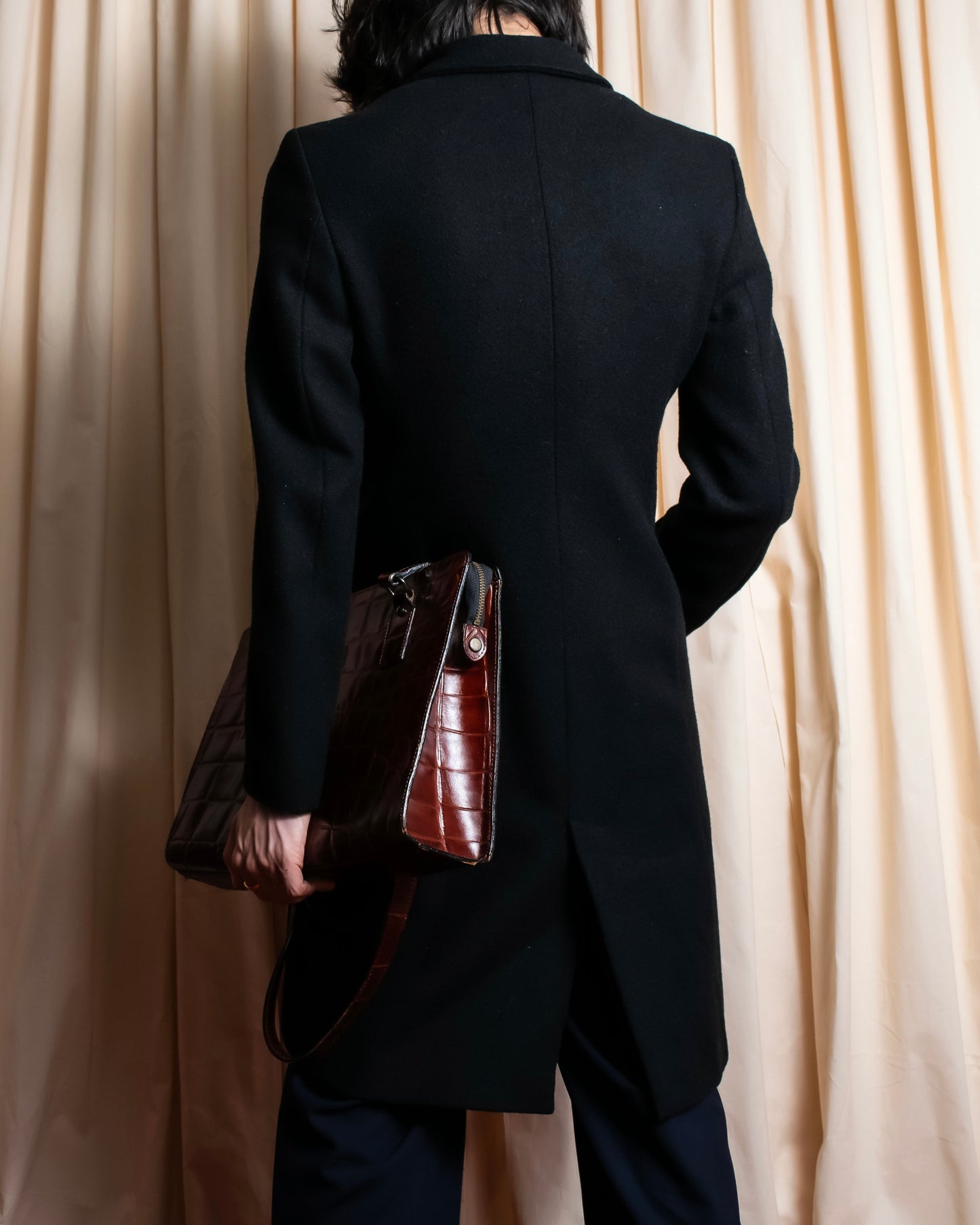 また、ウールを贅沢に混紡した厚手の生地を使用することで、高級感のあるラグジュアリーな風合いに仕上がっております。裏地も深みのあるボルドーという大変美しい色合いで、見えないところまでこだわり抜いたブランドの風格を感じさせられますね。