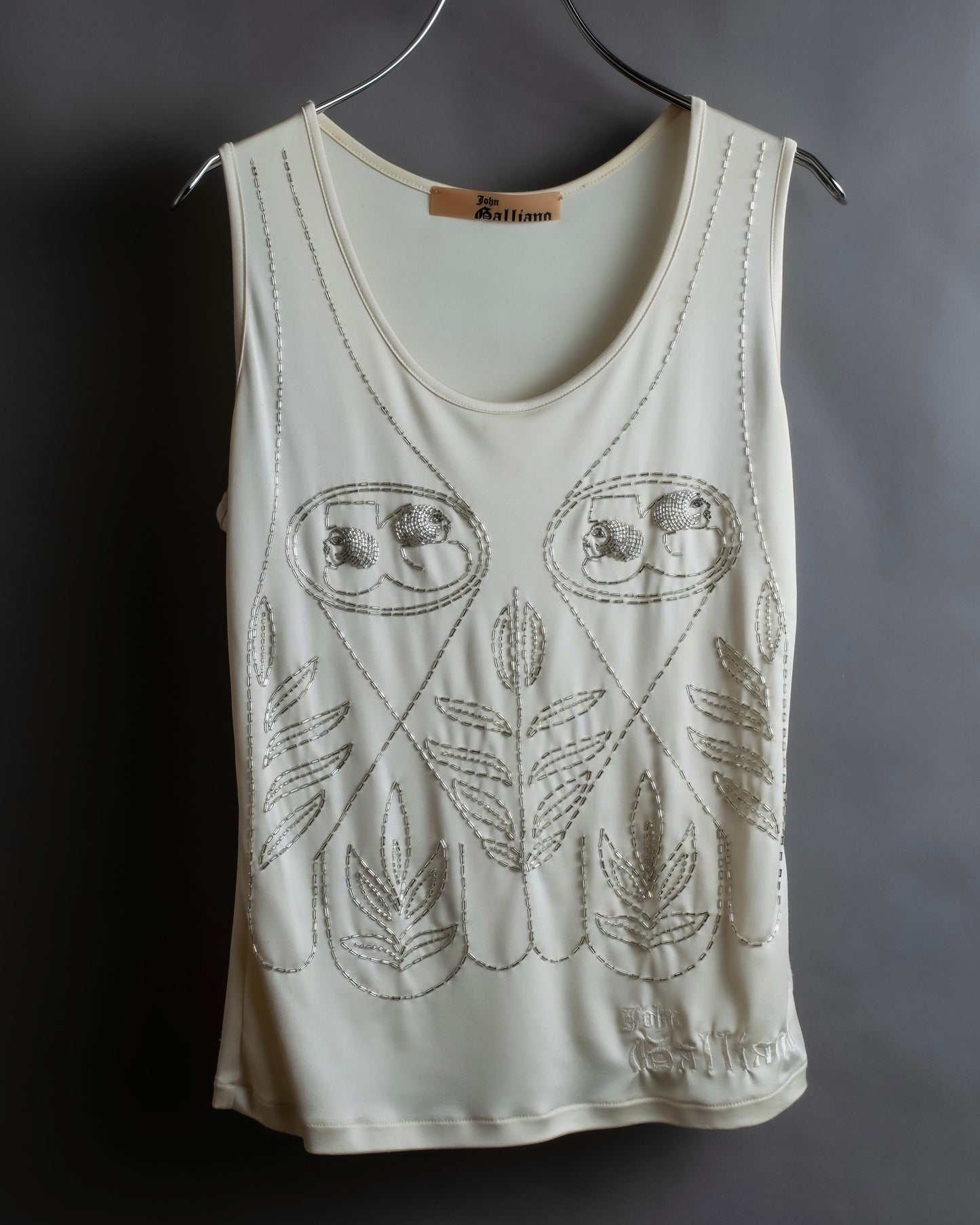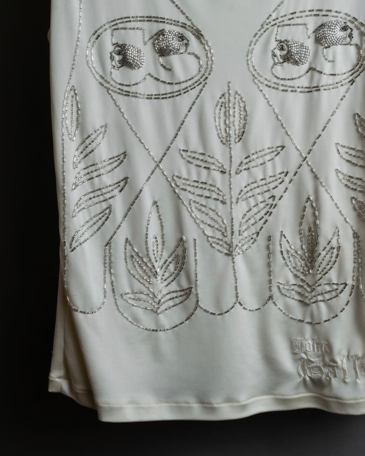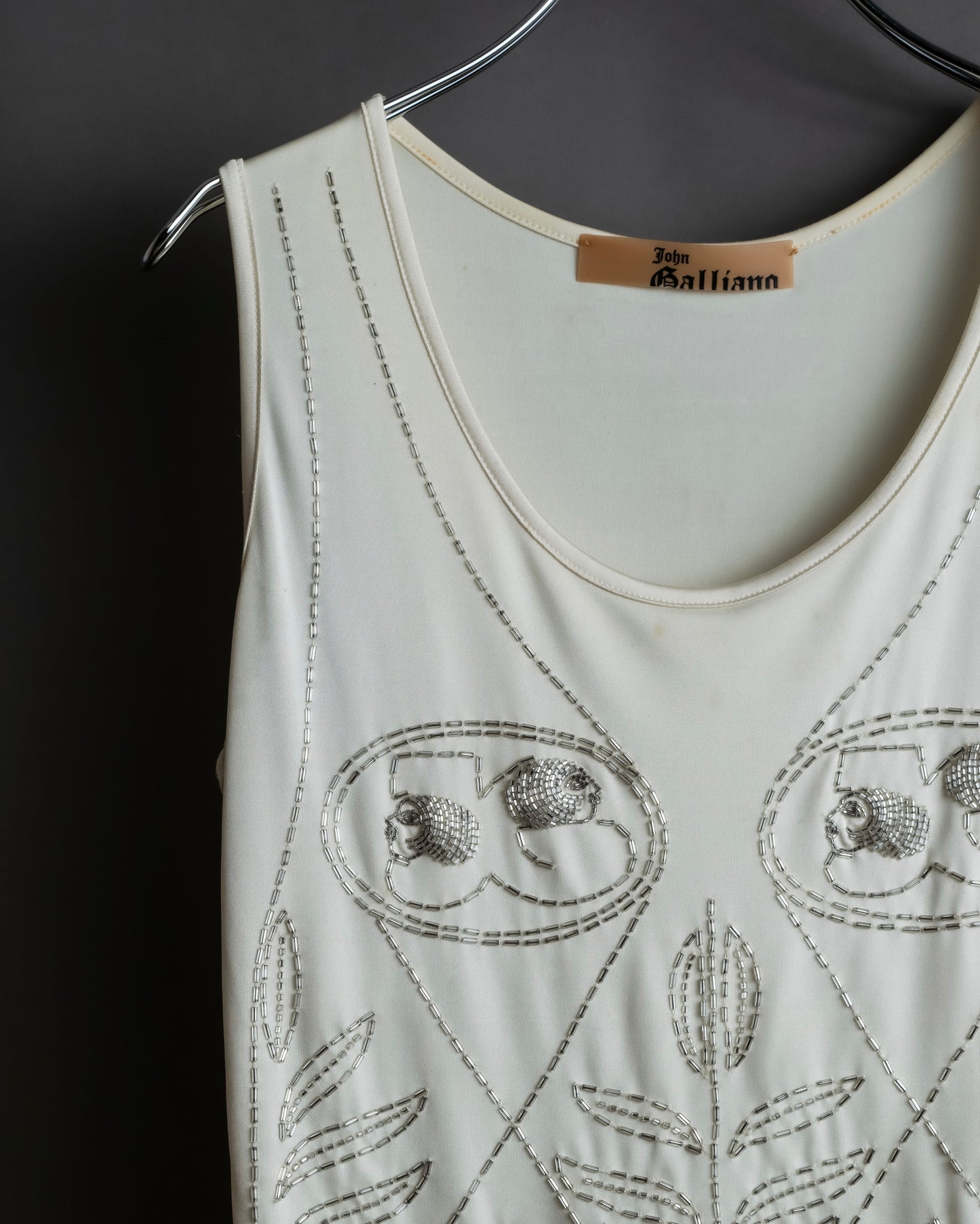ソリッドな印象のノースリーブに、程良い色気を感じさせるやや開いたクルーネックが特徴のベースに、花々や草木、人の横顔を思わせるビジューデザインをを全体に施しているまさしくガリアーノのデザインセンスが光るこちらの逸品。