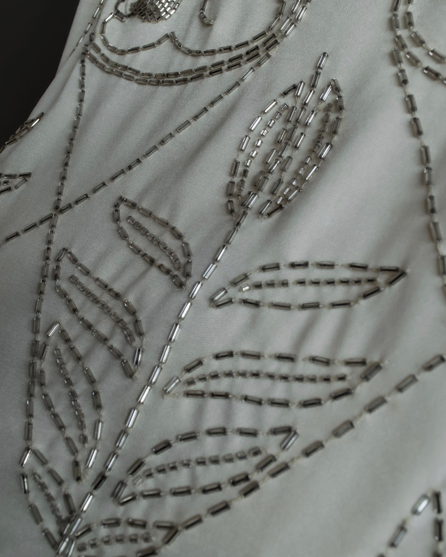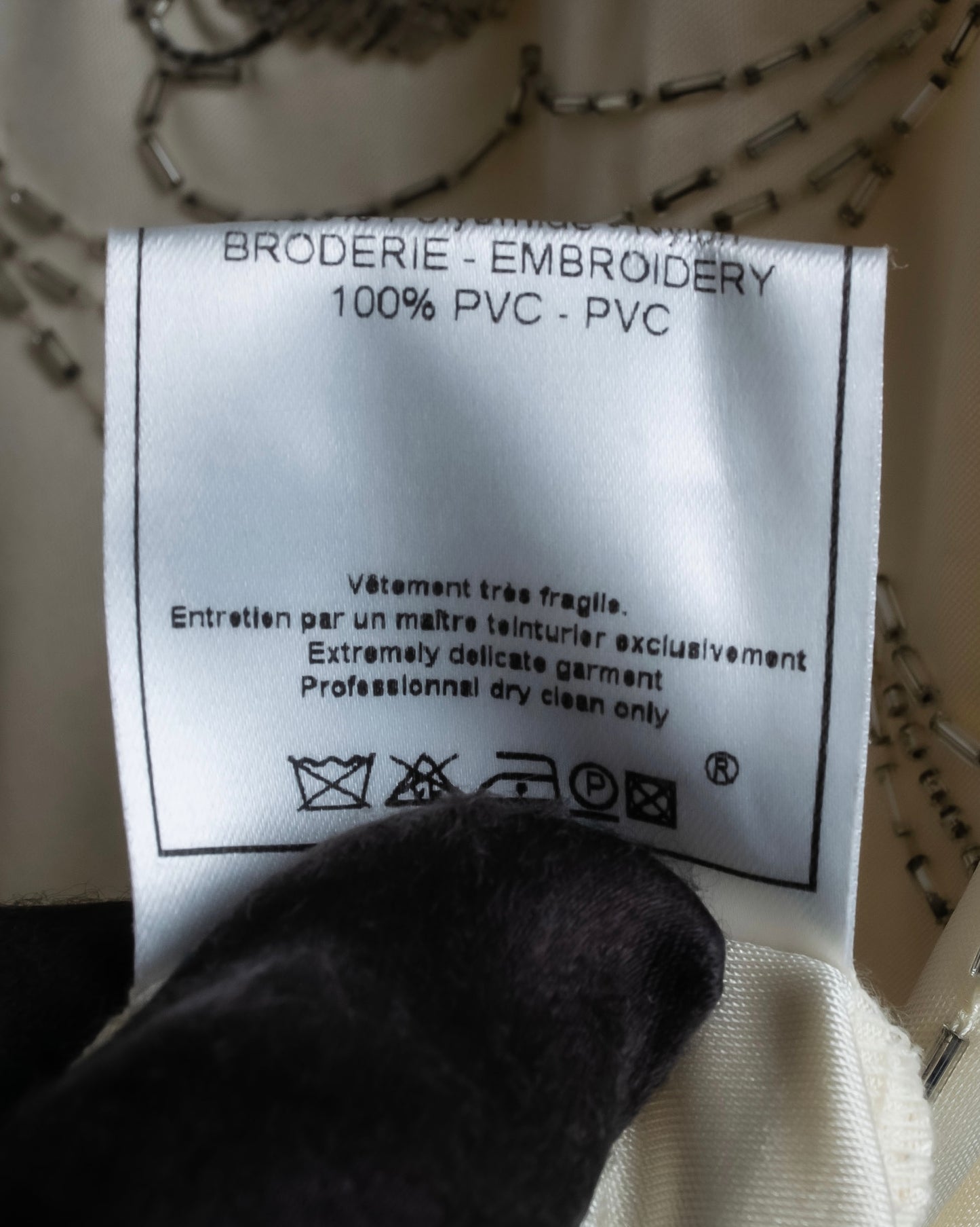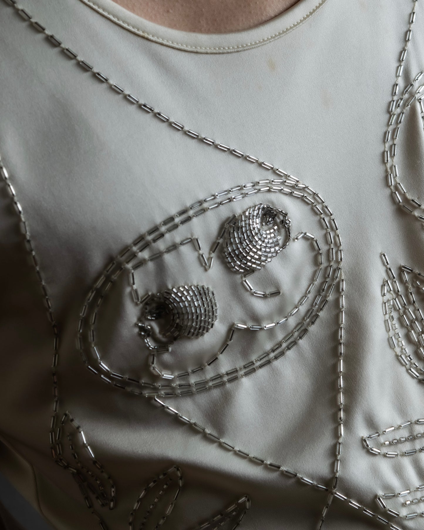 ソリッドな印象のノースリーブに、程良い色気を感じさせるやや開いたクルーネックが特徴のベースに、花々や草木、人の横顔を思わせるビジューデザインをを全体に施しているまさしくガリアーノのデザインセンスが光るこちらの逸品。