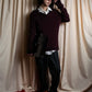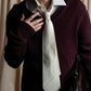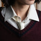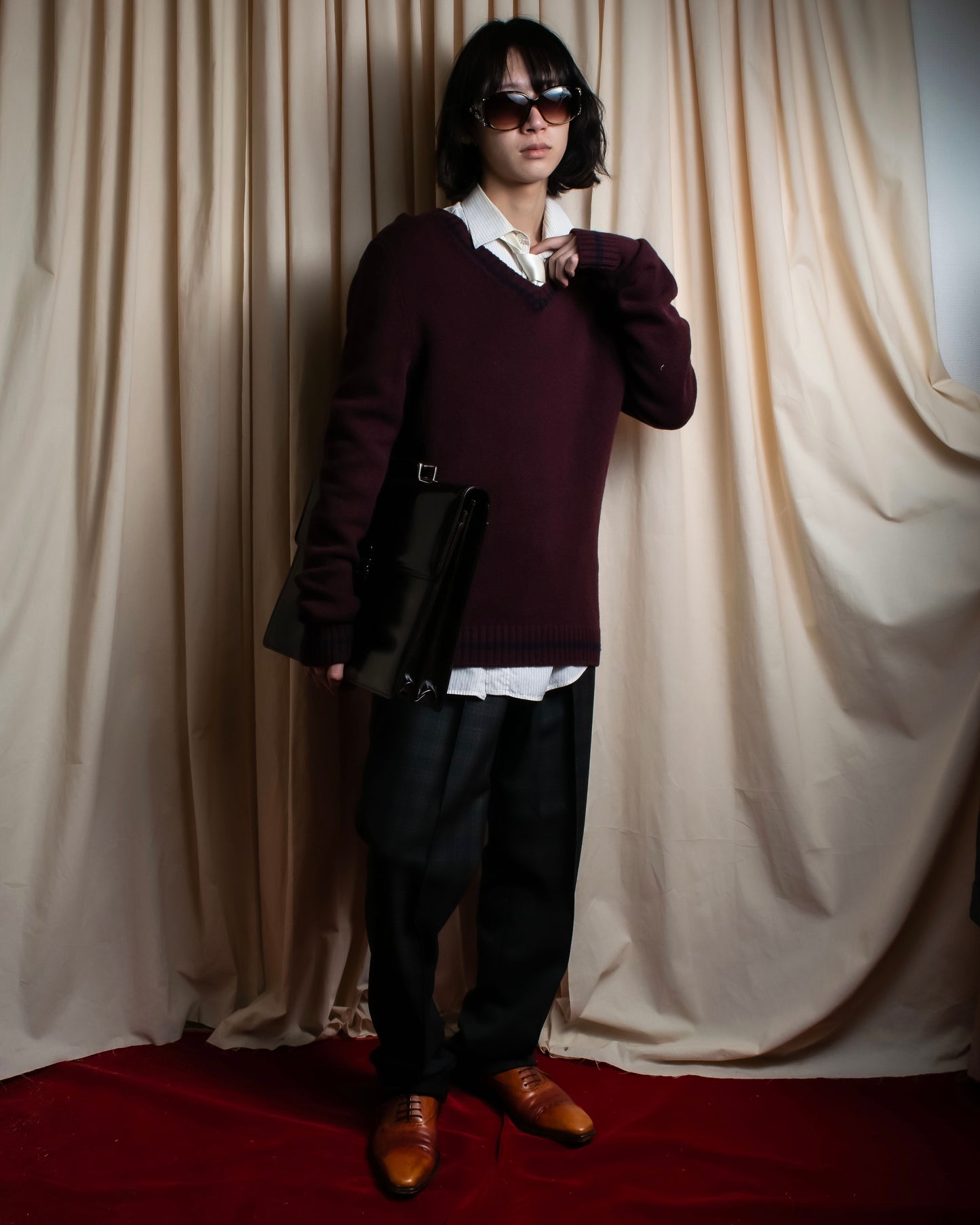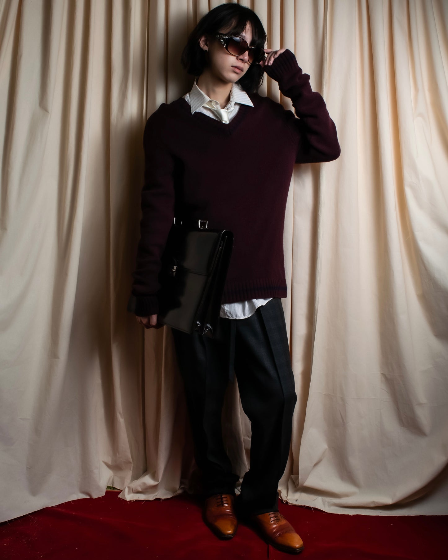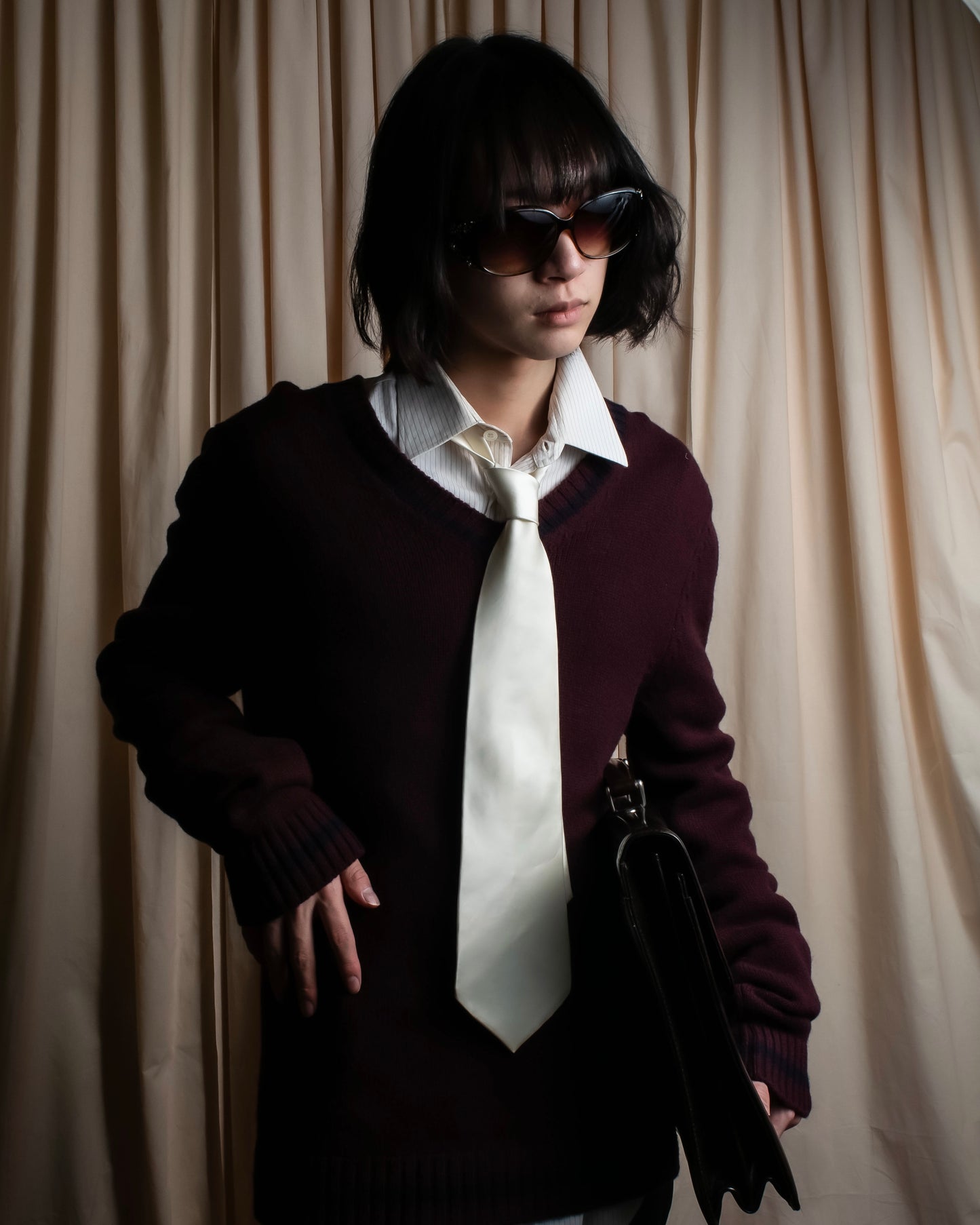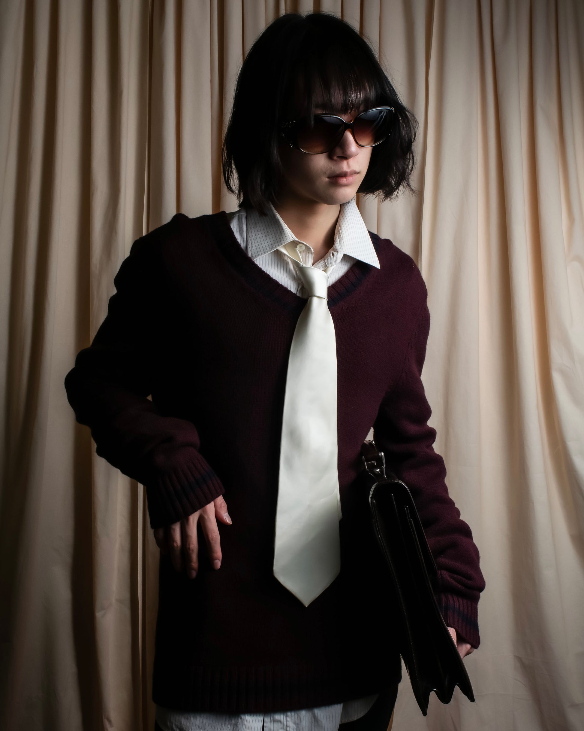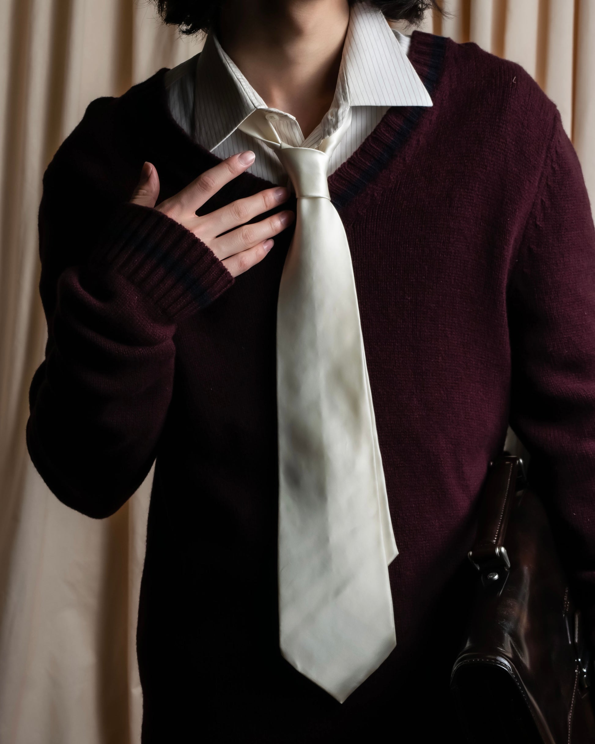 スタイリングとしては、バーガンディのニットとピンストライプシャツを合わせた上品なレイヤードスタイルに、アイボリータイをアクセントとして挿し込むことで、クラシックとモードが交差する新鮮なバランスが生まれます。カチッとしすぎないリラックス感がありつつ、エッジの効いたスタイルに整えてくれるので、ヴィンテージのジャケットやスラックス、重厚なレザーバッグとの相性も抜群ですね。