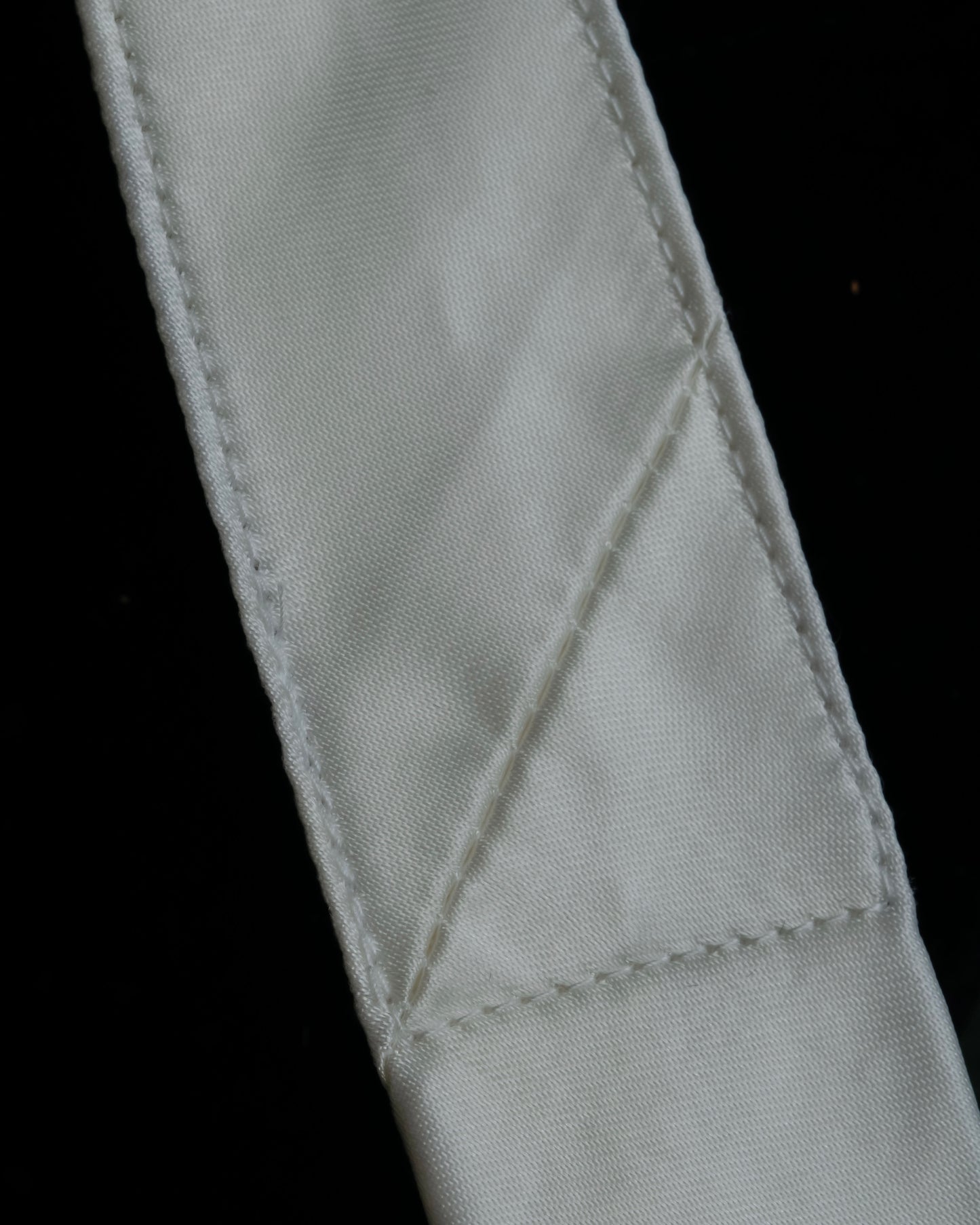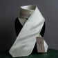 無駄を削ぎ落としたプレーンな佇まいが、かえって造形美を際立たせるコム デ ギャルソン オム プリュスのホワイトネクタイ。やや肉厚なサテン地の質感が、結び目に立体的な陰影を生み出し、フォルムに奥行きを添えています。