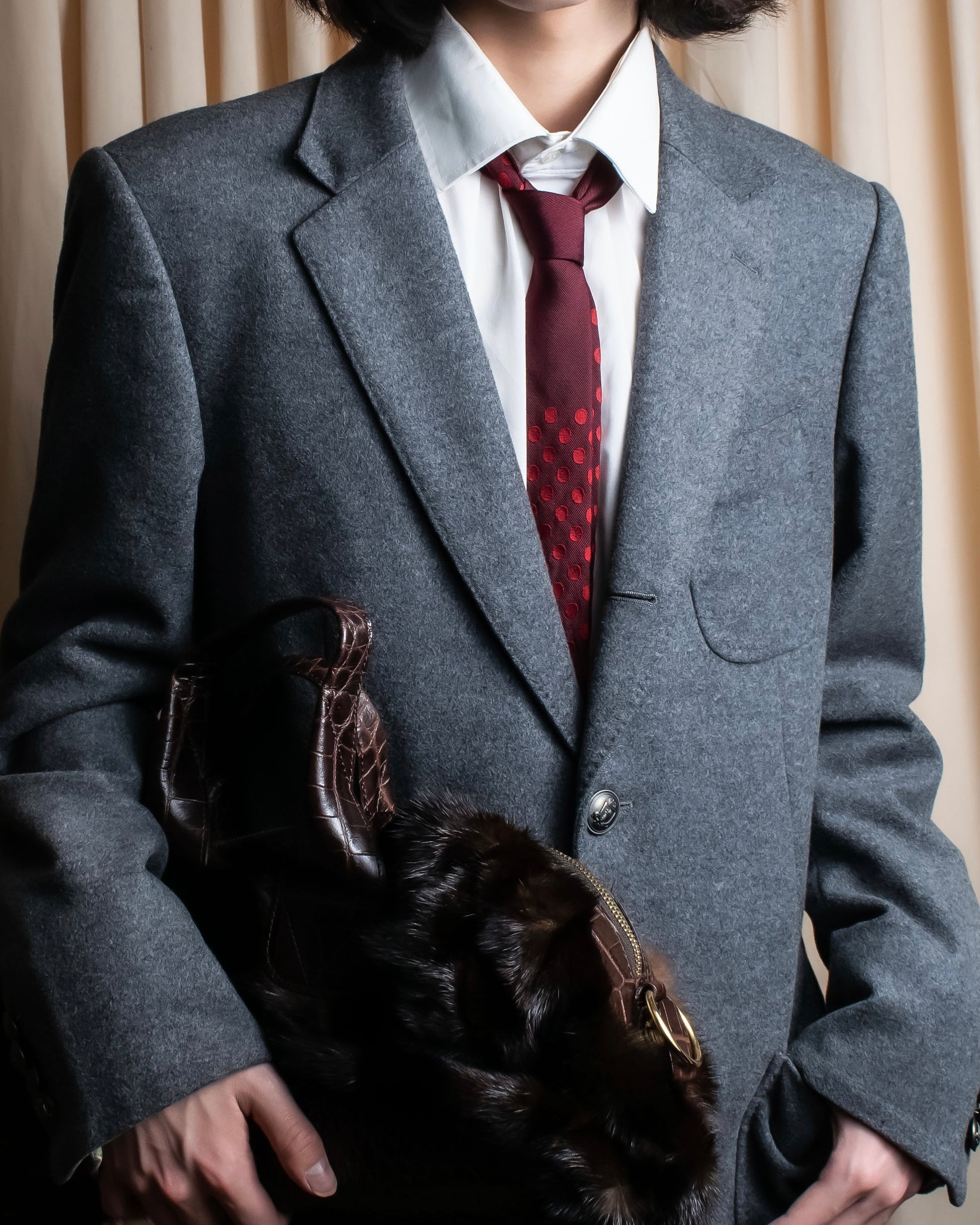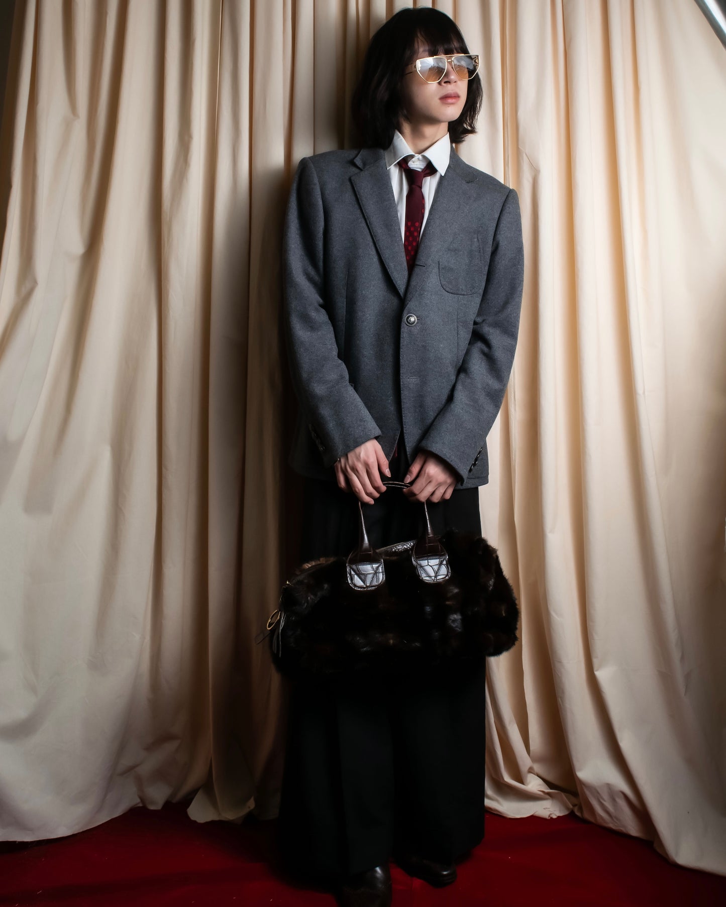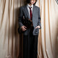 華美になりすぎないモードなアクセントとして、ブラックのレギュラーカラーシャツにグレイッシュなウールトラウザー、足元にはスリムなレザーシューズを合わせることで、都会的でありながら品のある装いが完成します。遊び心と洗練を両立したい方へおすすめしたい一本です。