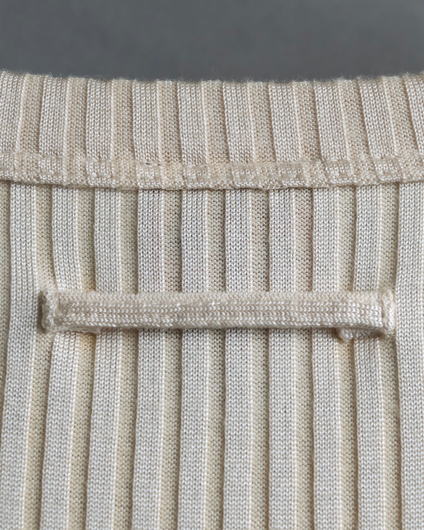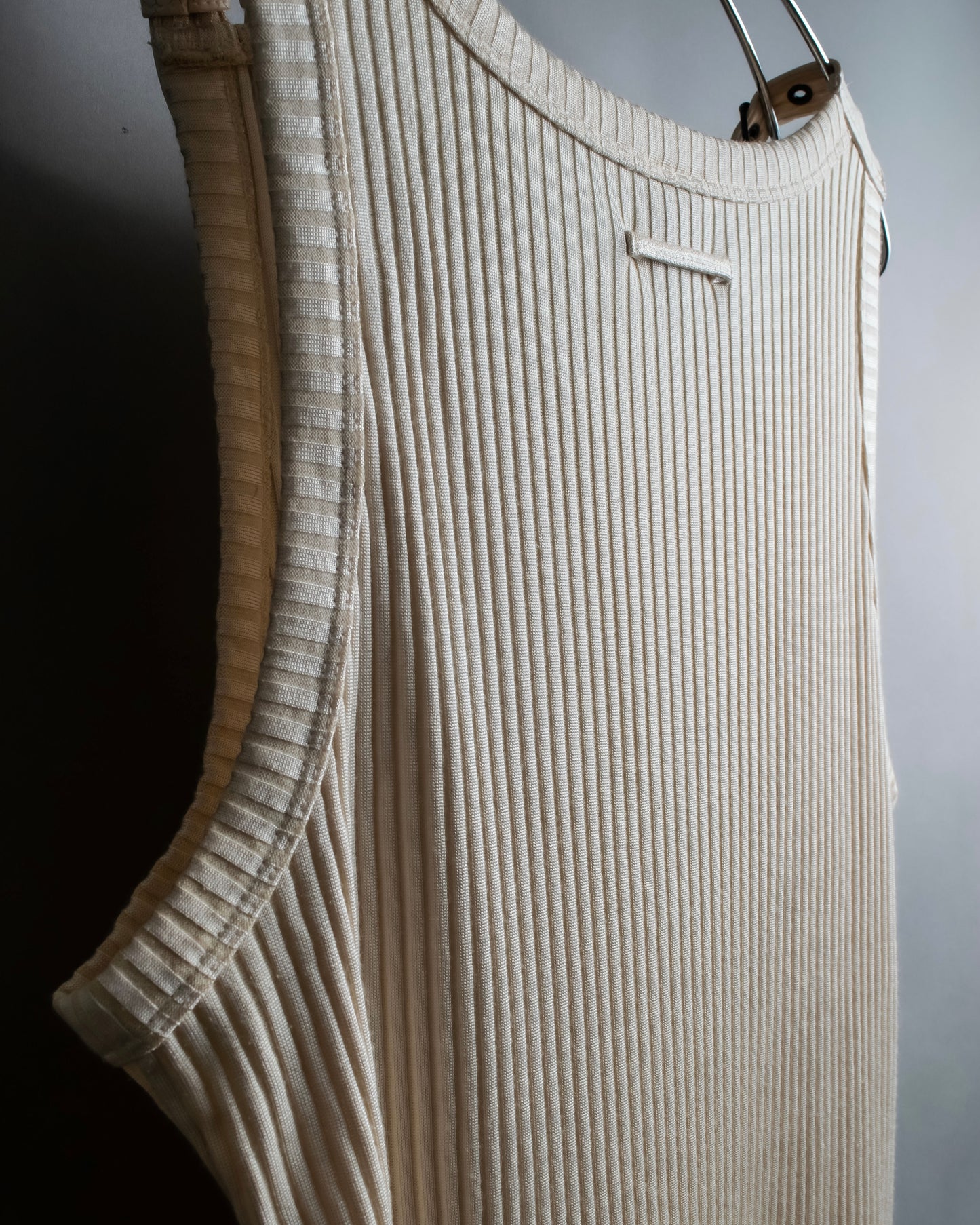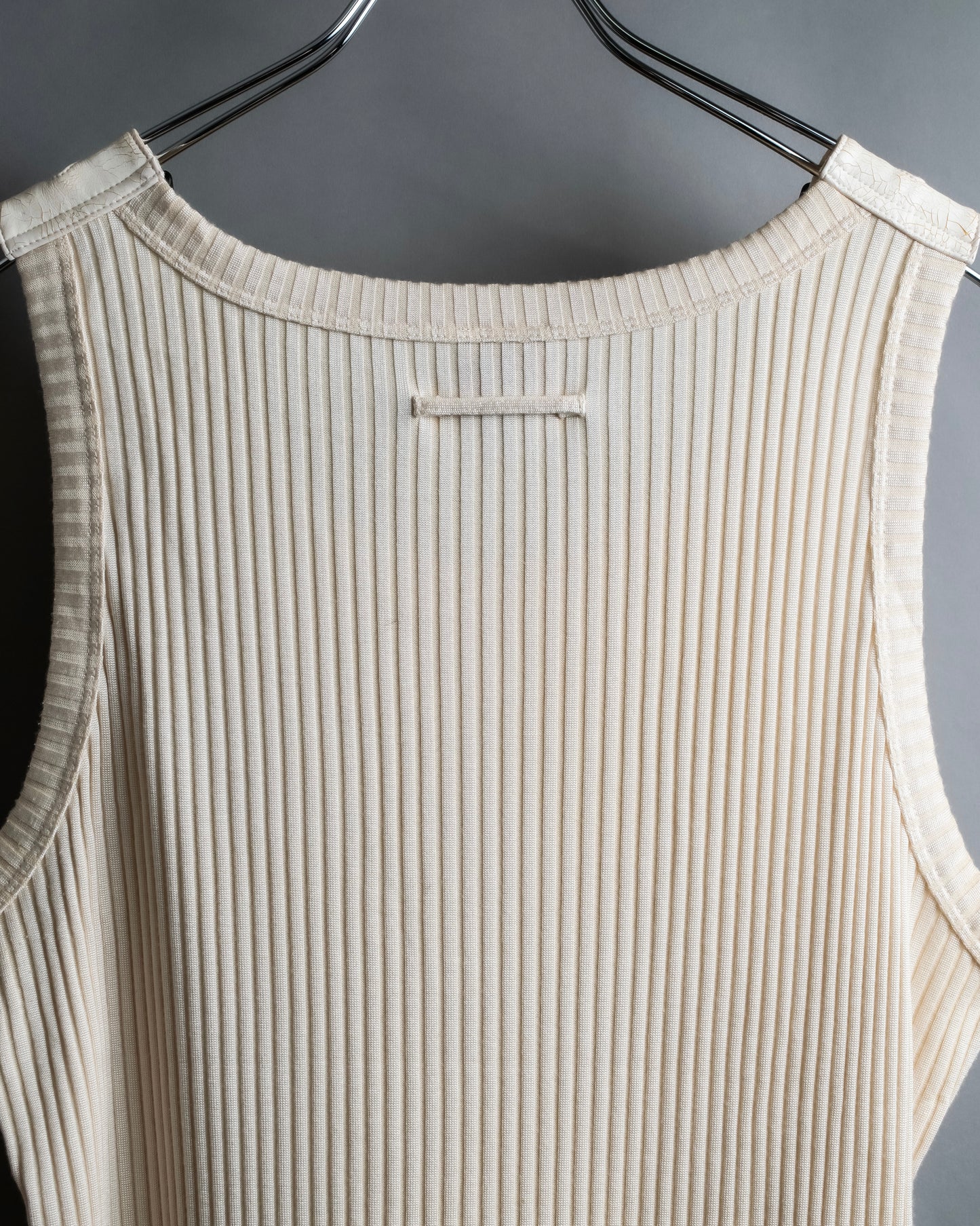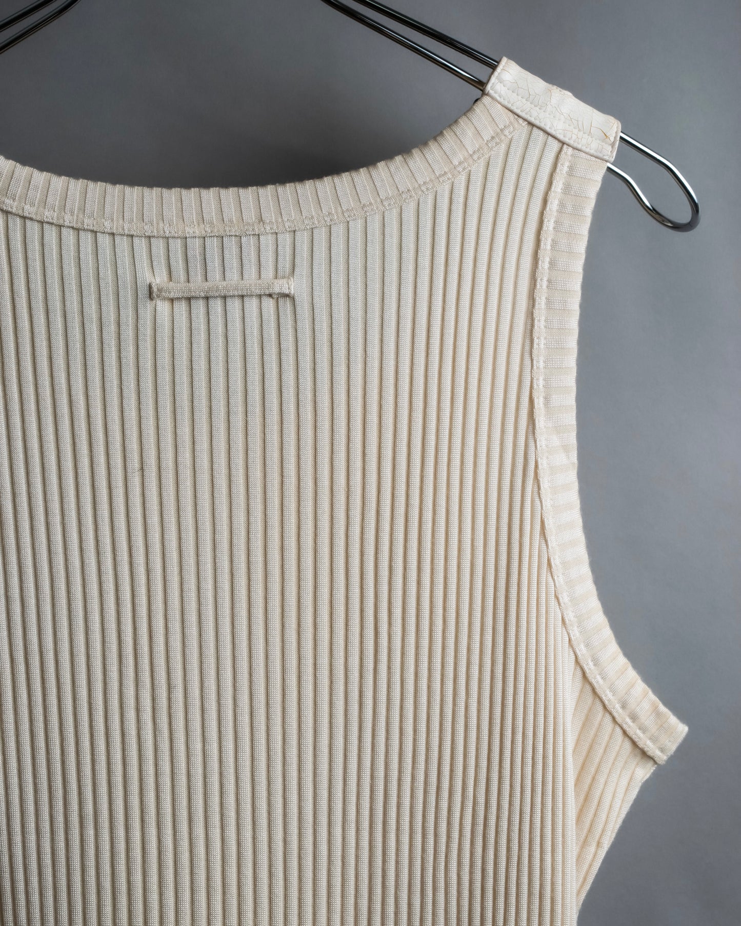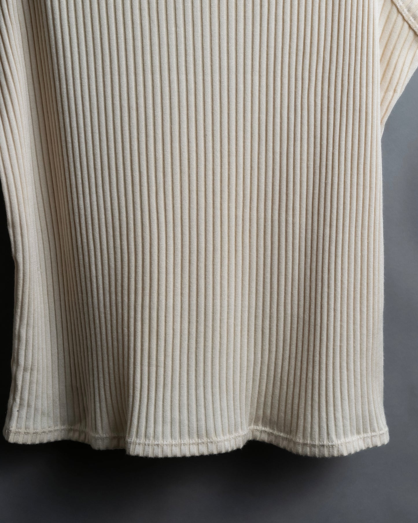 また、全体に入ったリブによって、より挑発的で唯一性の高いな雰囲気を感じることができるのも魅力的ですね。首周りと肩周りはさらに厚めのリブが入れられており、全体的にシンプルになりがちなタンクトップのデザインの中で、程よく主張するアクセントとなっています。